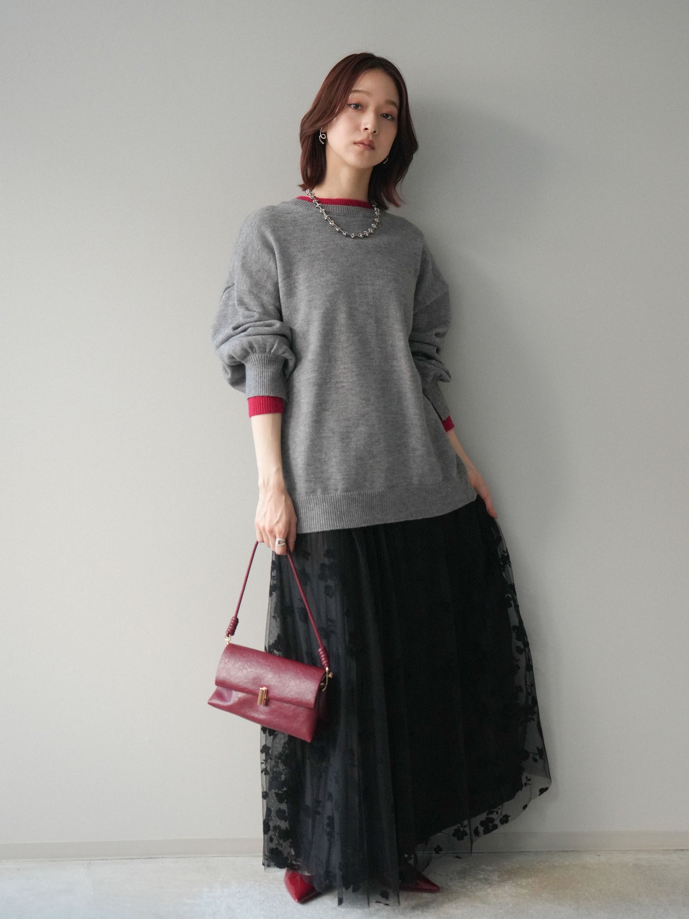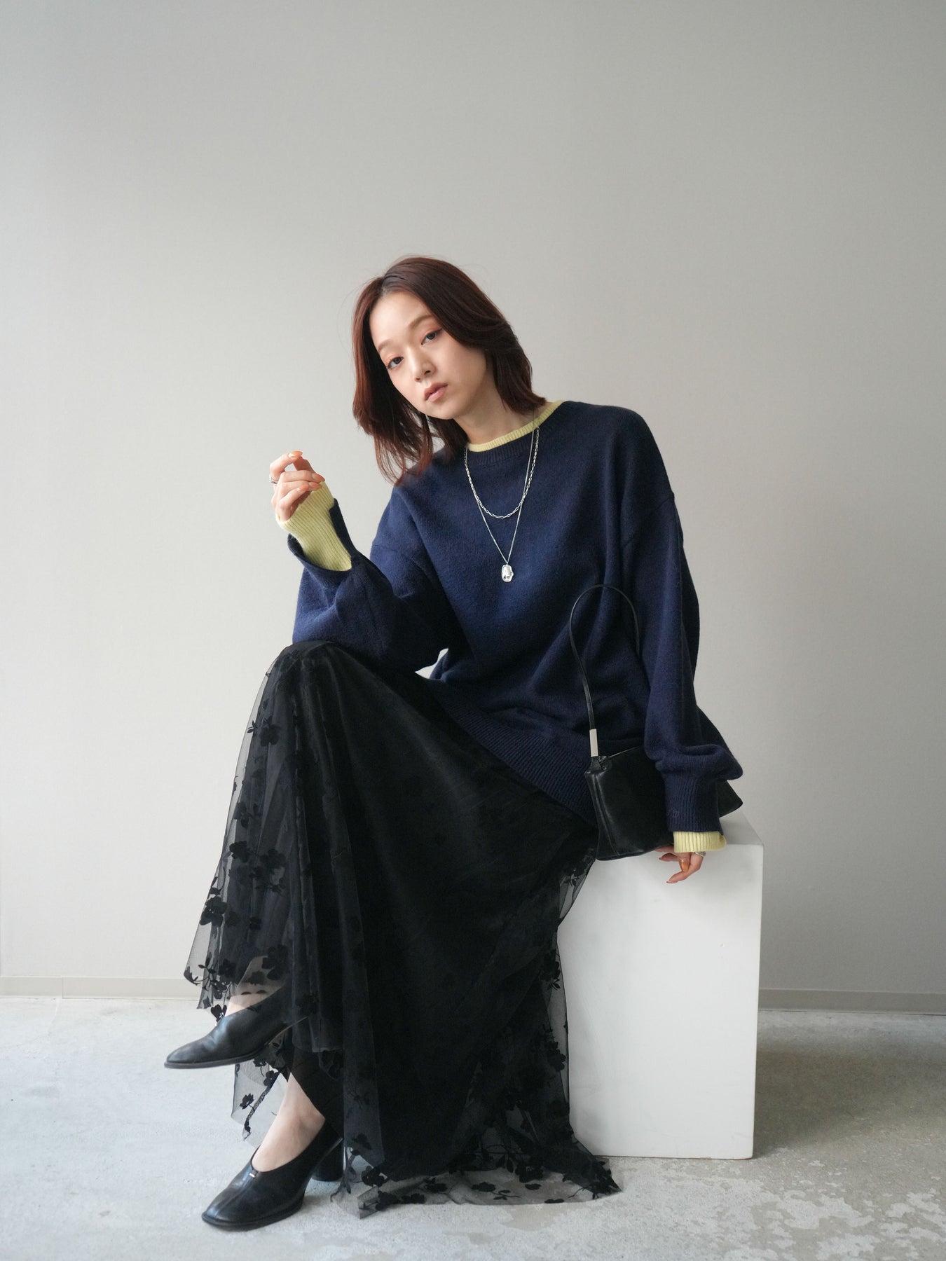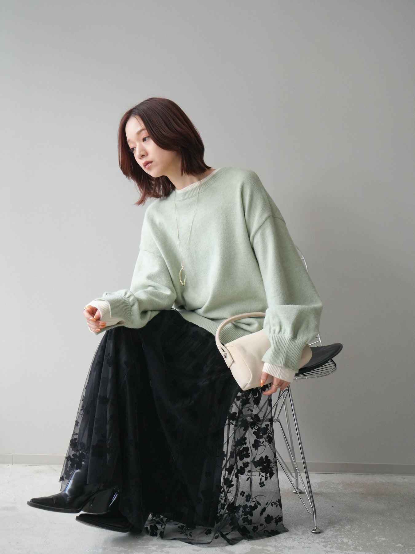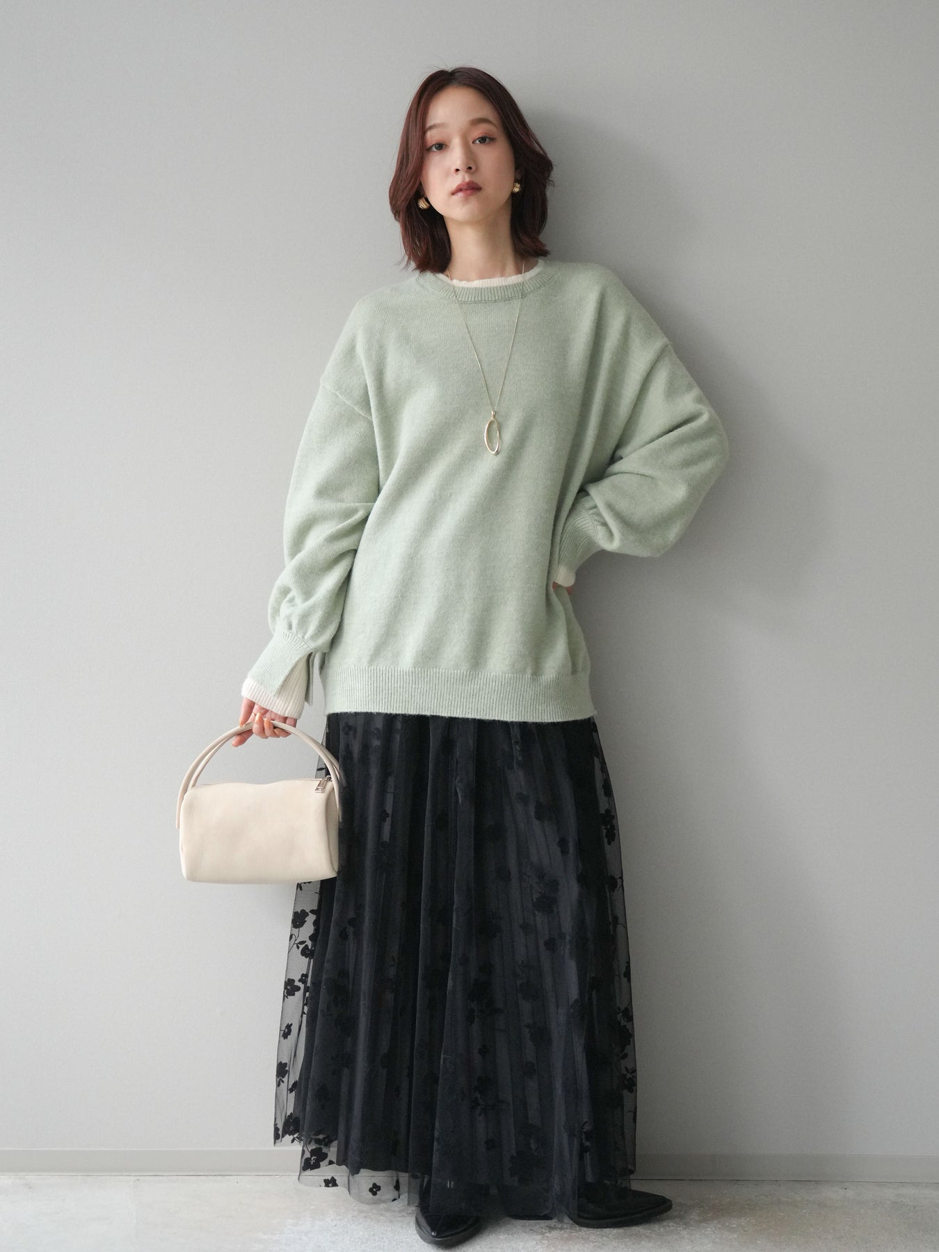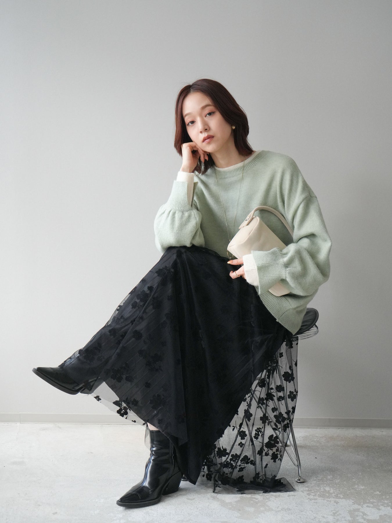 [SET]ヘンリーネック配色レイヤードニットプルオーバー+フラワーフロッキーチュールプリーツスカート(2set)