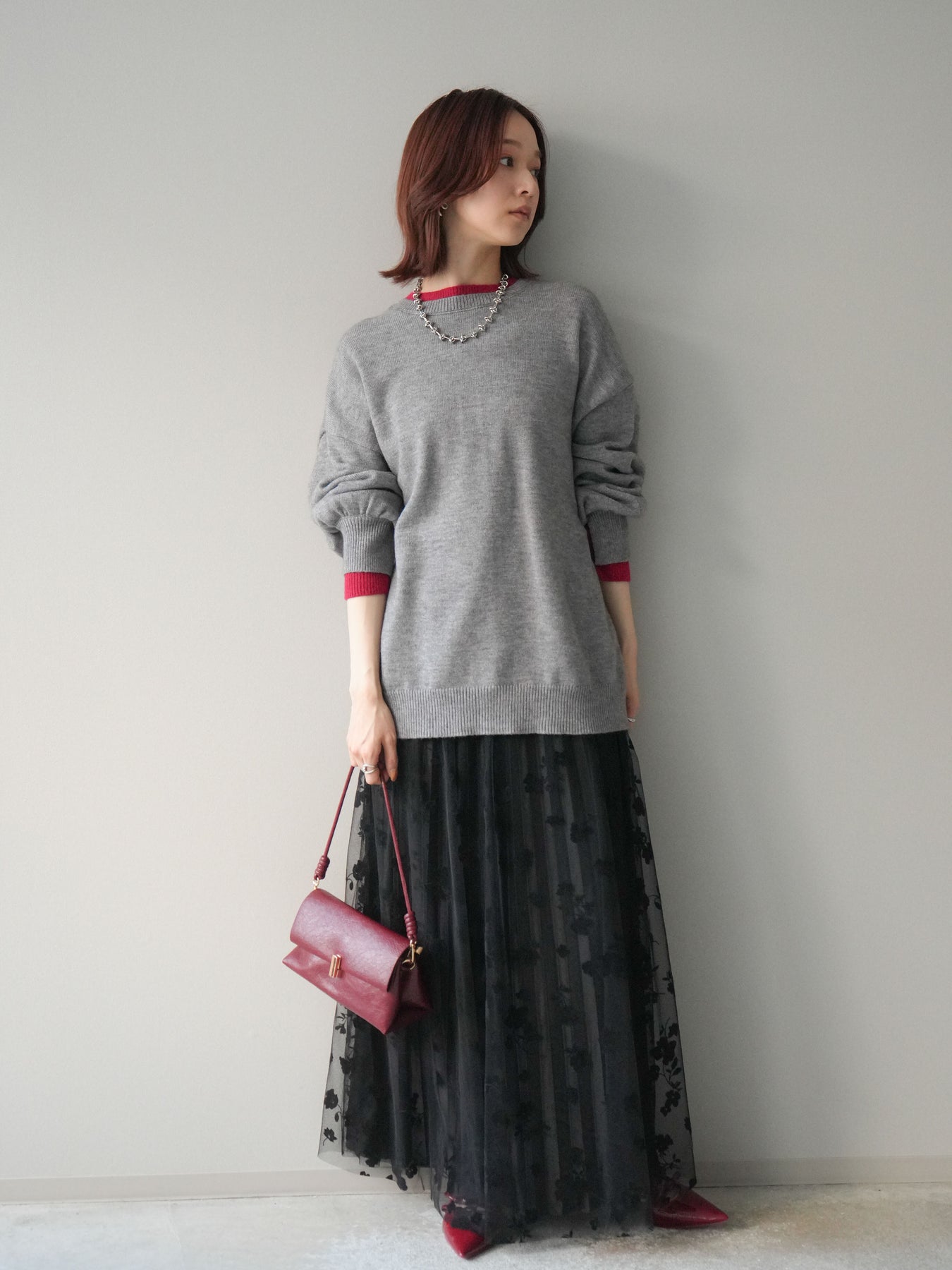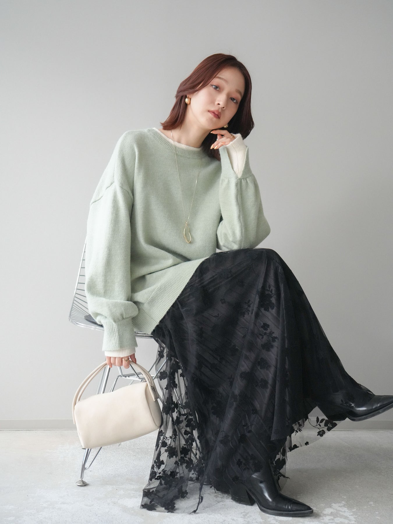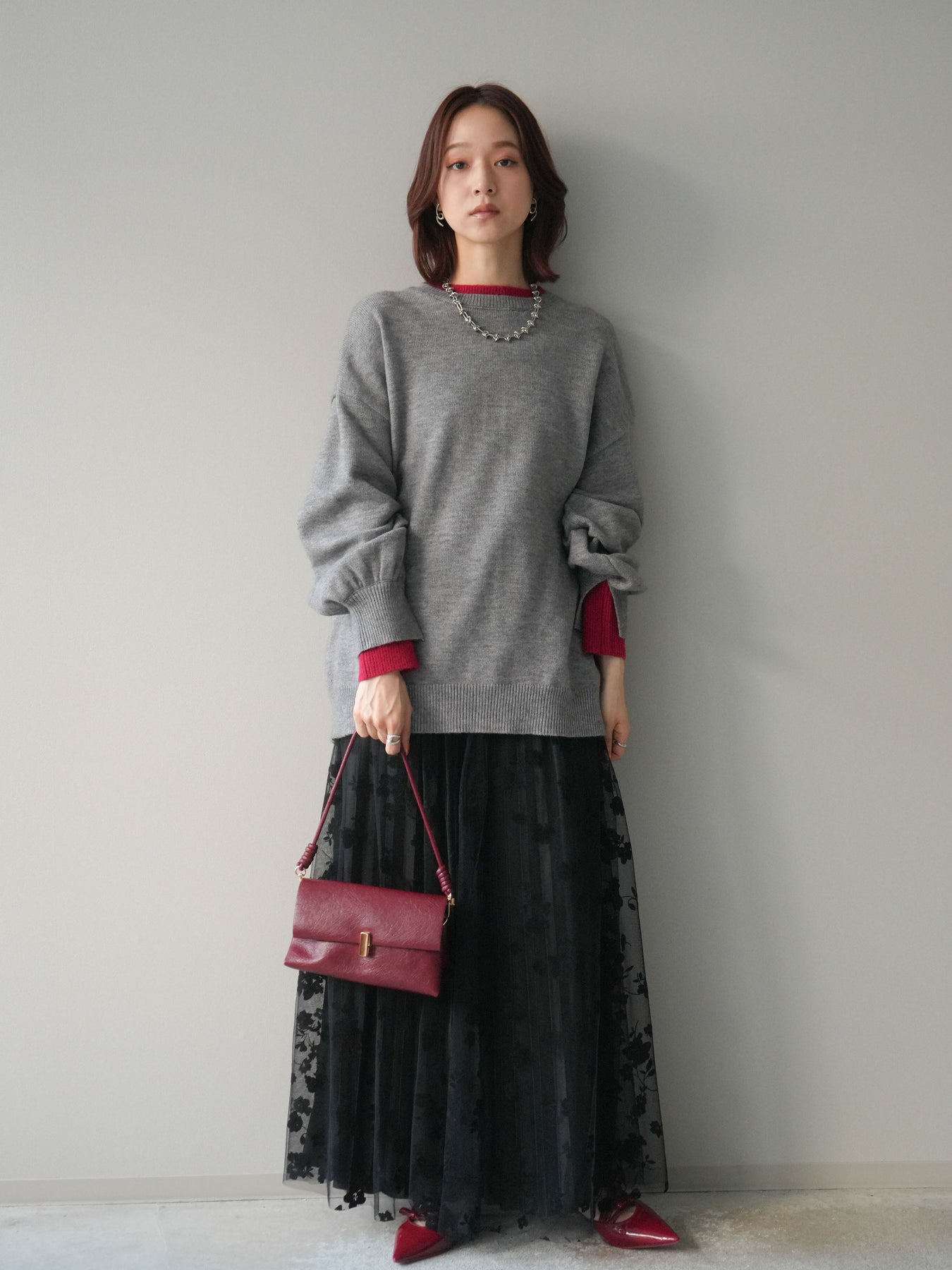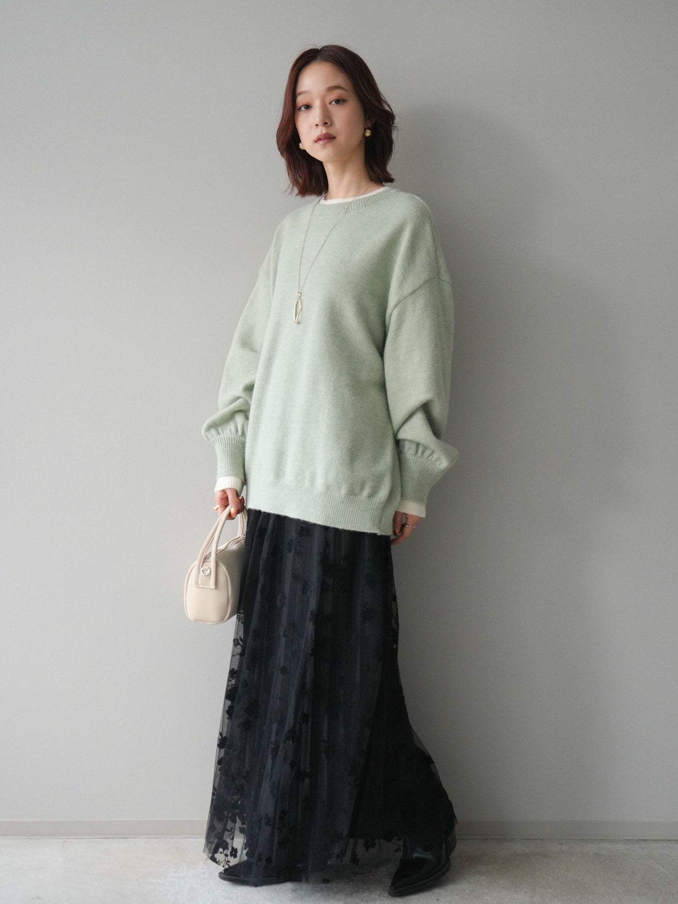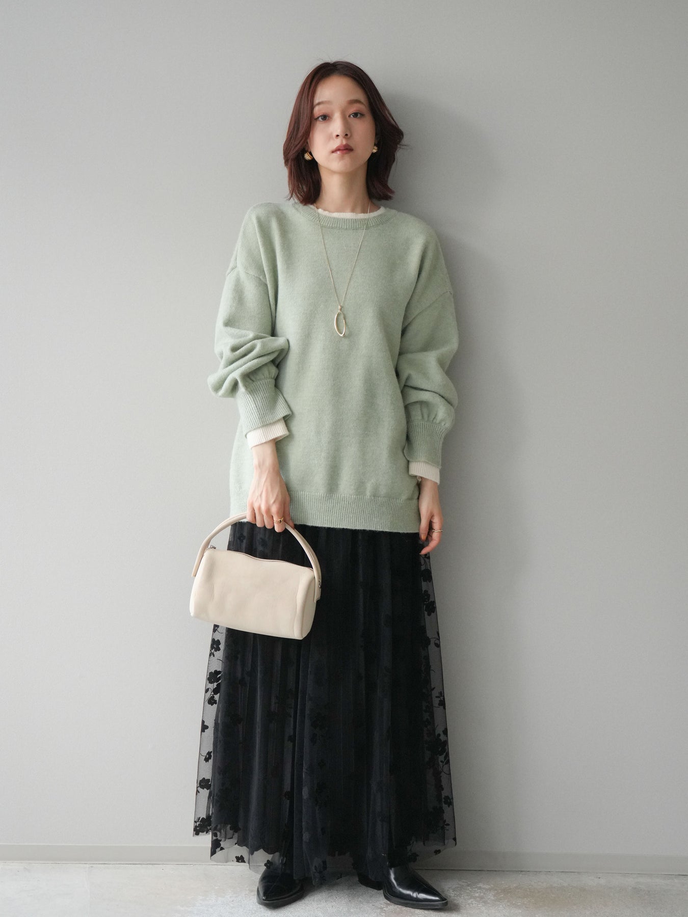 [SET]ヘンリーネック配色レイヤードニットプルオーバー+フラワーフロッキーチュールプリーツスカート(2set)
