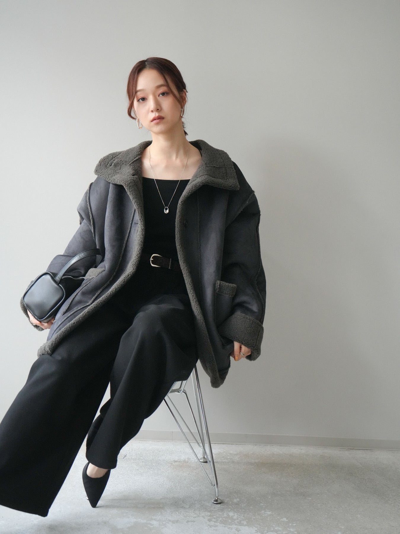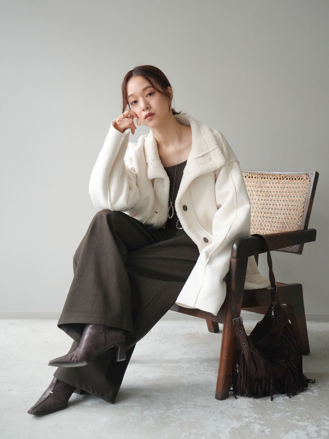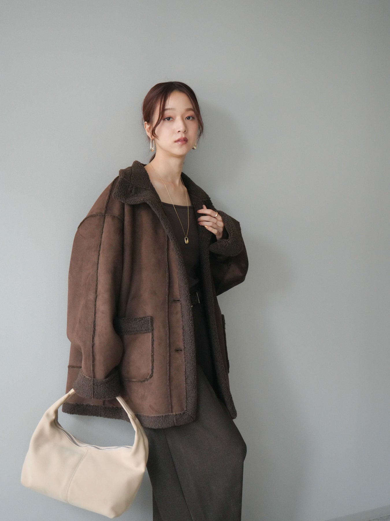 ふんわりとしたフェイクムートン素材で仕立てた、暖かみあふれるミディアムコート。スタンドネックが首元までしっかり包み込み、防寒性とデザイン性の両方を叶えてくれます。フロントやポケットまわりに施されたボア風の切り替えがアクセントとなり、シンプルなシルエットにほどよい表情をプラス。ゆったりとしたサイズ感でニットの上からも羽織りやすく、デイリーから冬のお出かけまで幅広く活躍する一枚です。全体をすっきり見せる縦ラインのバランスも魅力。 ※ボトムス、キャミソール(インナー)以外の商品は一律でインナーは付属していません。