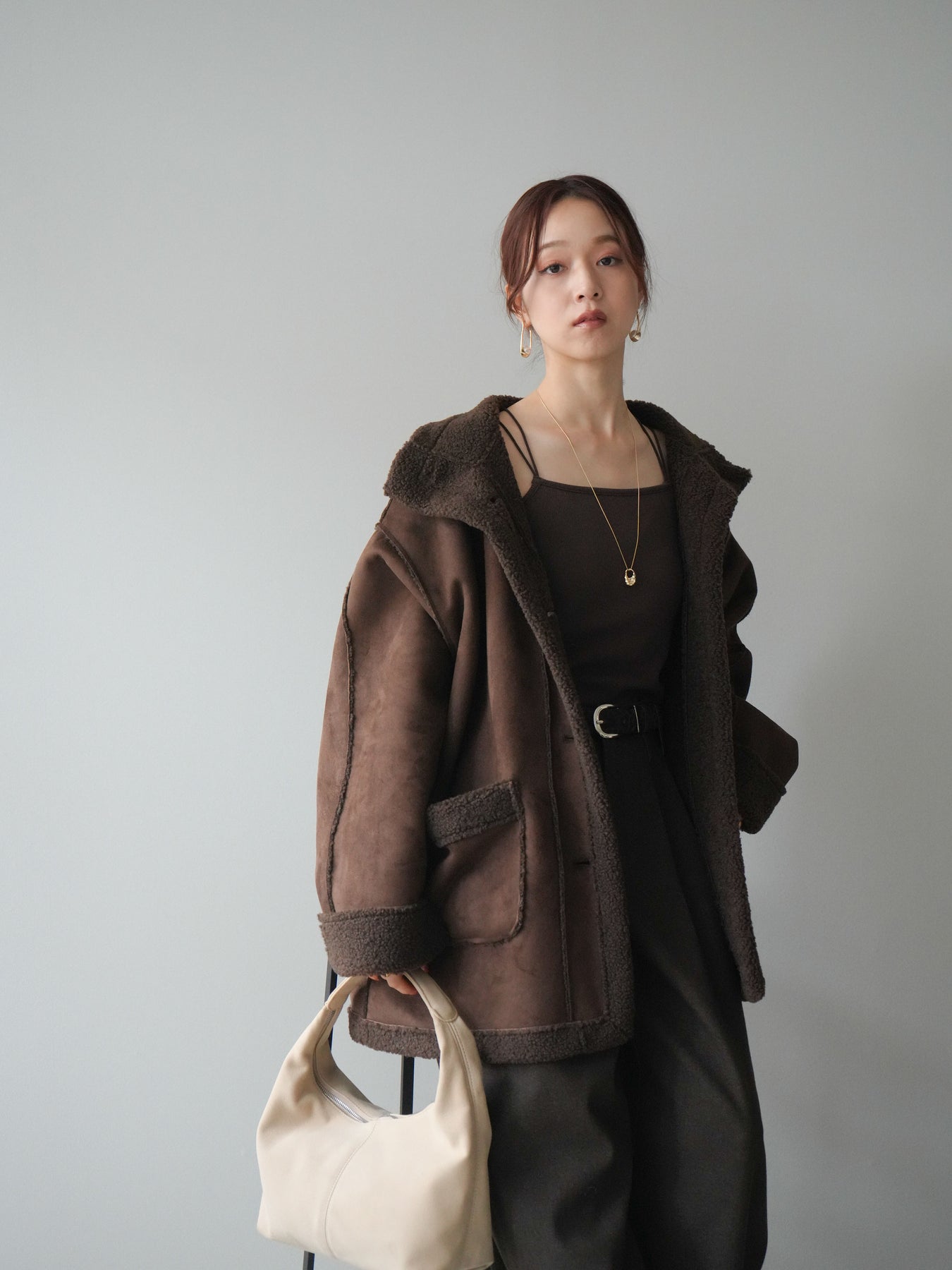 [SET]スタンドネックフェイクムートンミディアムコート+カップ付きバッククロスキャミソール(2set)