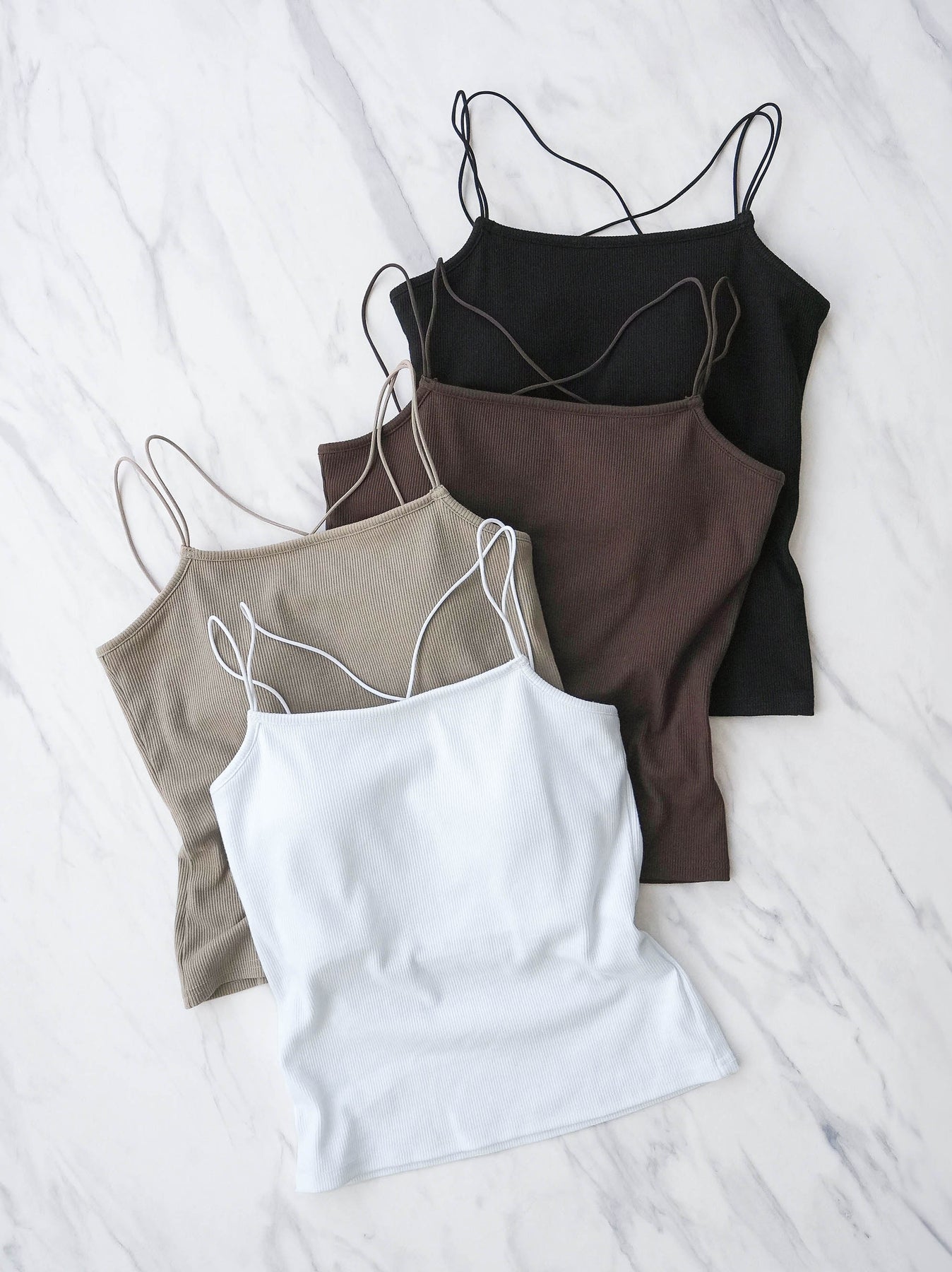 エフォートレスに着こなせるカップ付きキャミソール。華奢なバッククロスストラップがデザインのポイントになり、ヘルシーな抜け感を演出。リブ素材のフィット感が快適な着心地を提供し、一枚での着用はもちろん、シャツやジャケットのインナーとしても活躍。デイリーに使いやすいベーシックカラー展開で、幅広いスタイリングにマッチします。トレンド感のあるシンプルなデザインで、ワードローブの定番アイテムとしておすすめ。 ※ボトムス、キャミソール(インナー)以外の商品は一律でインナーは付属していません
