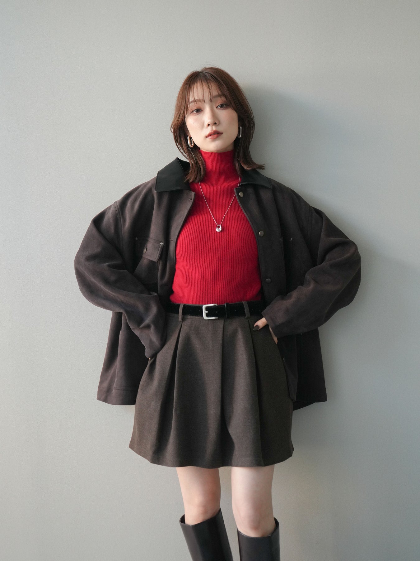 スエードタッチの柔らかな素材にレザー調の襟を組み合わせた、上品さとモード感を兼ね備えたステンカラージャケット。異素材のコントラストがスタイリングに奥行きを生み、シンプルなシルエットでもしっかりと存在感のある一枚に仕上がっています。大きめのポケットやメタルボタンがアクセントとなり、実用性とデザイン性を両立。ゆとりのあるシルエットでニットの上からも羽織りやすく、デイリーからきれいめコーデまで幅広く活躍する万能アウターです。 ※ボトムス、キャミソール(インナー)以外の商品は一律でインナーは付属していません。