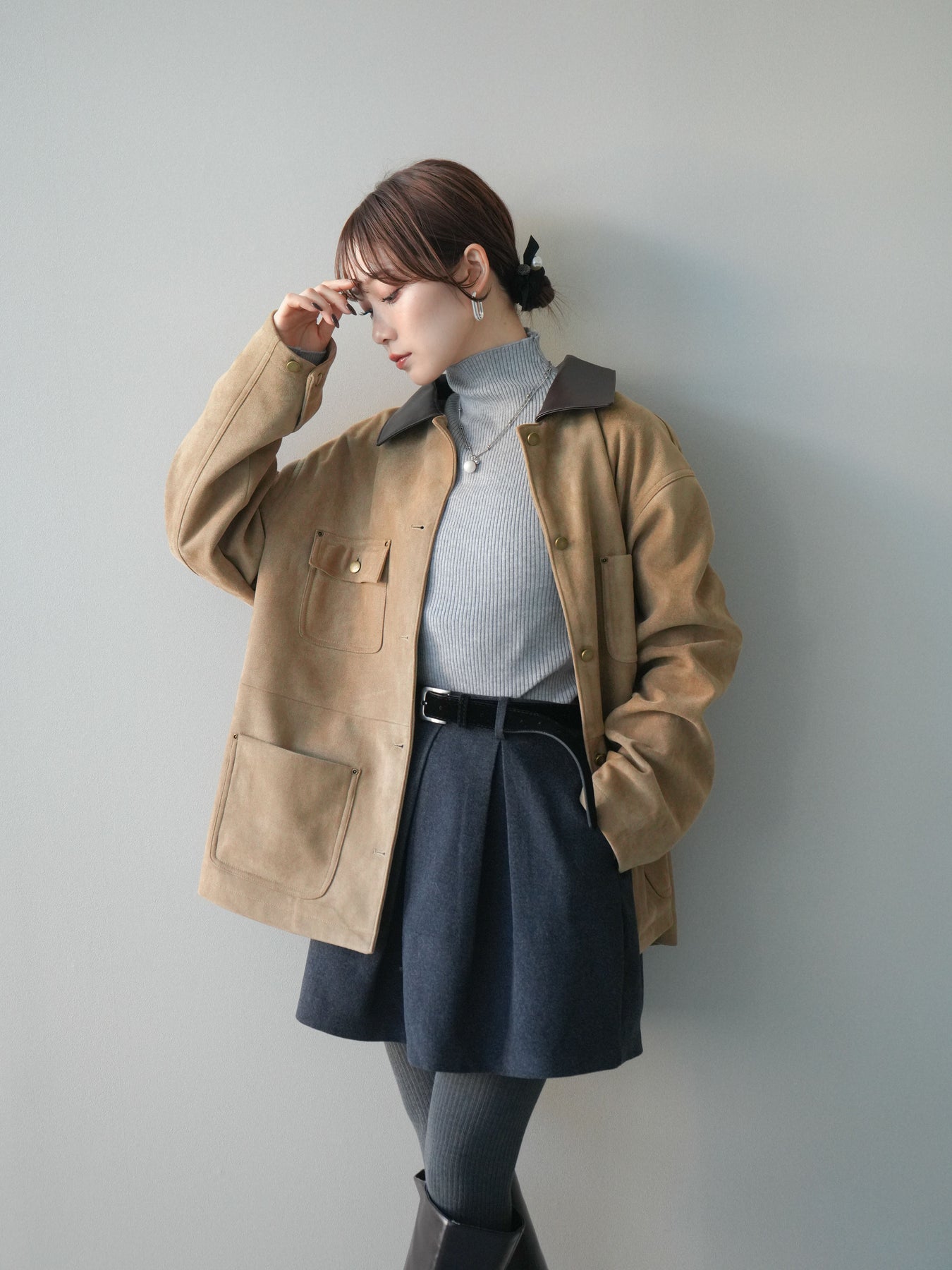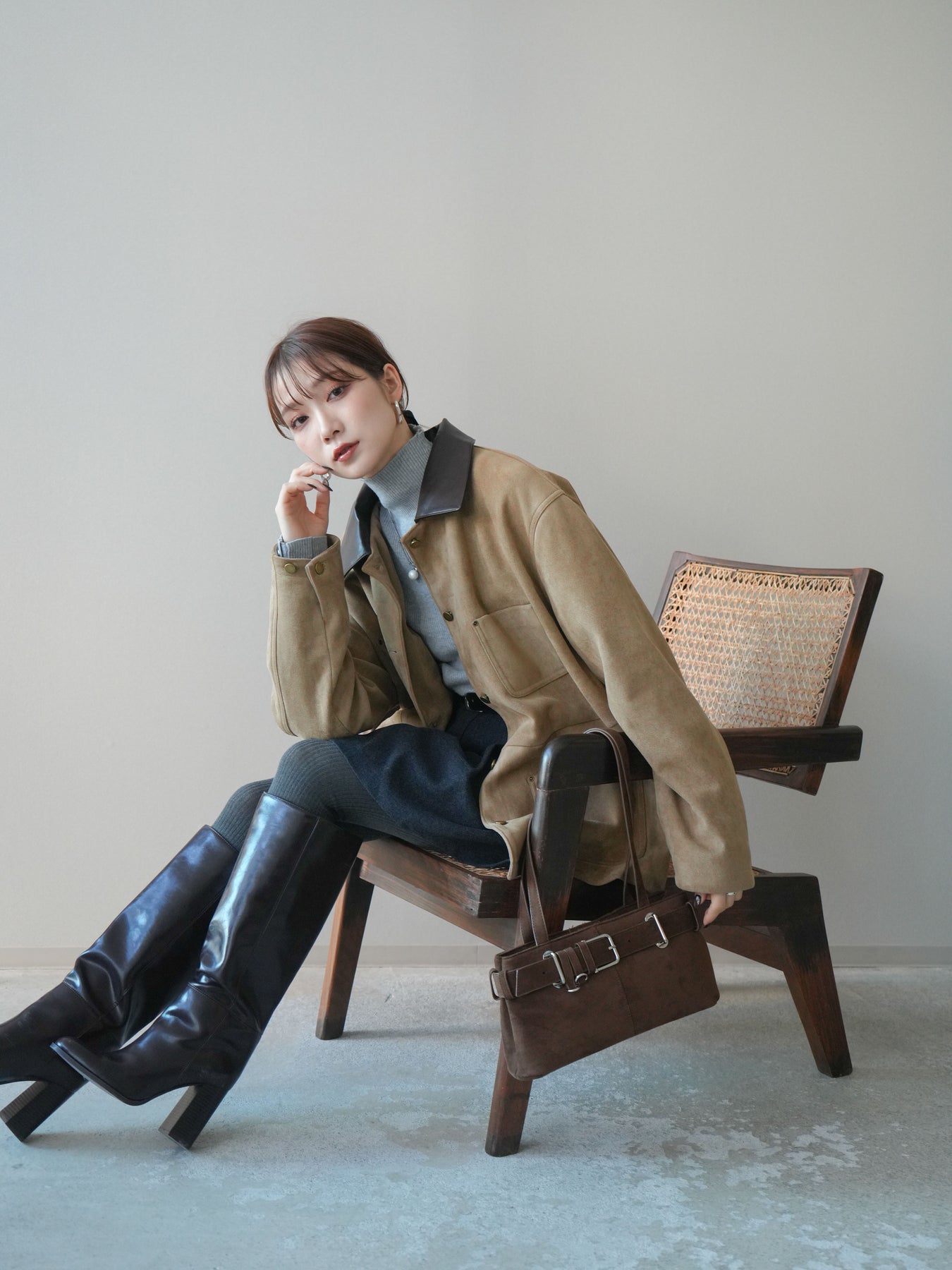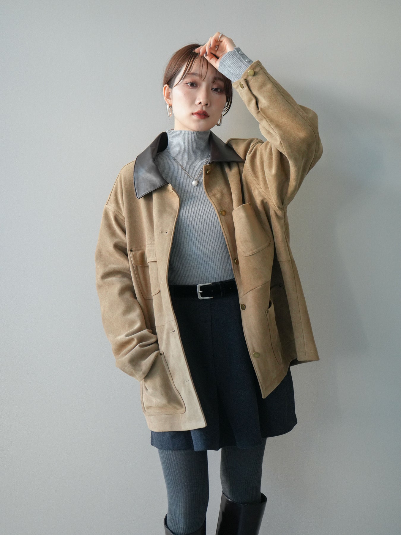 [SET]襟レザーステンカラースエードジャケット+袖ボタンボトルネックリブニットトップス(2set)