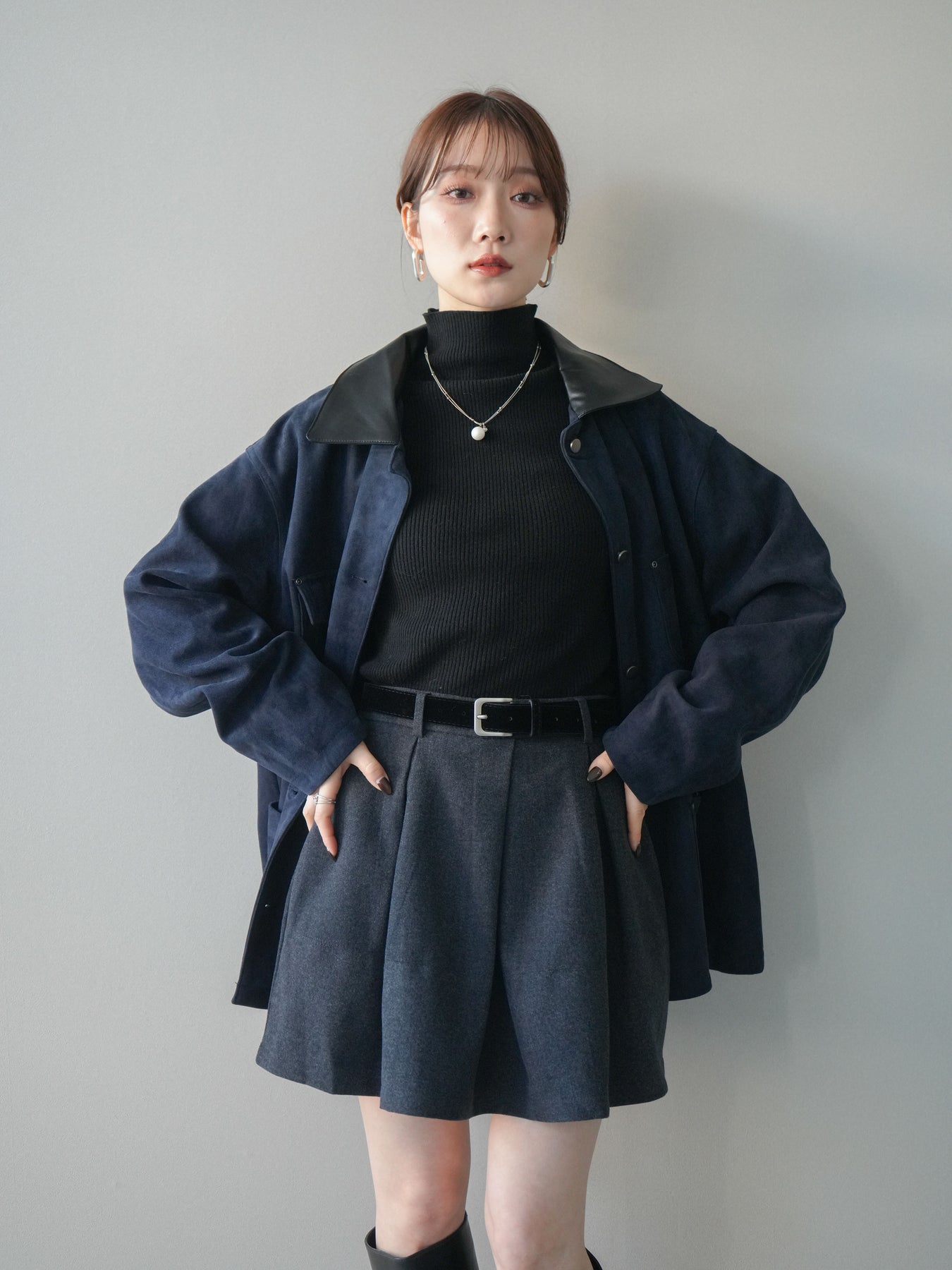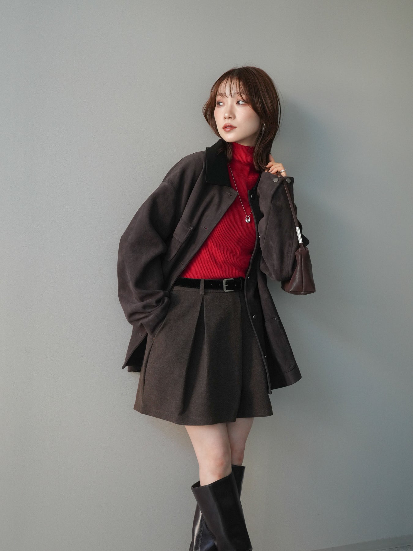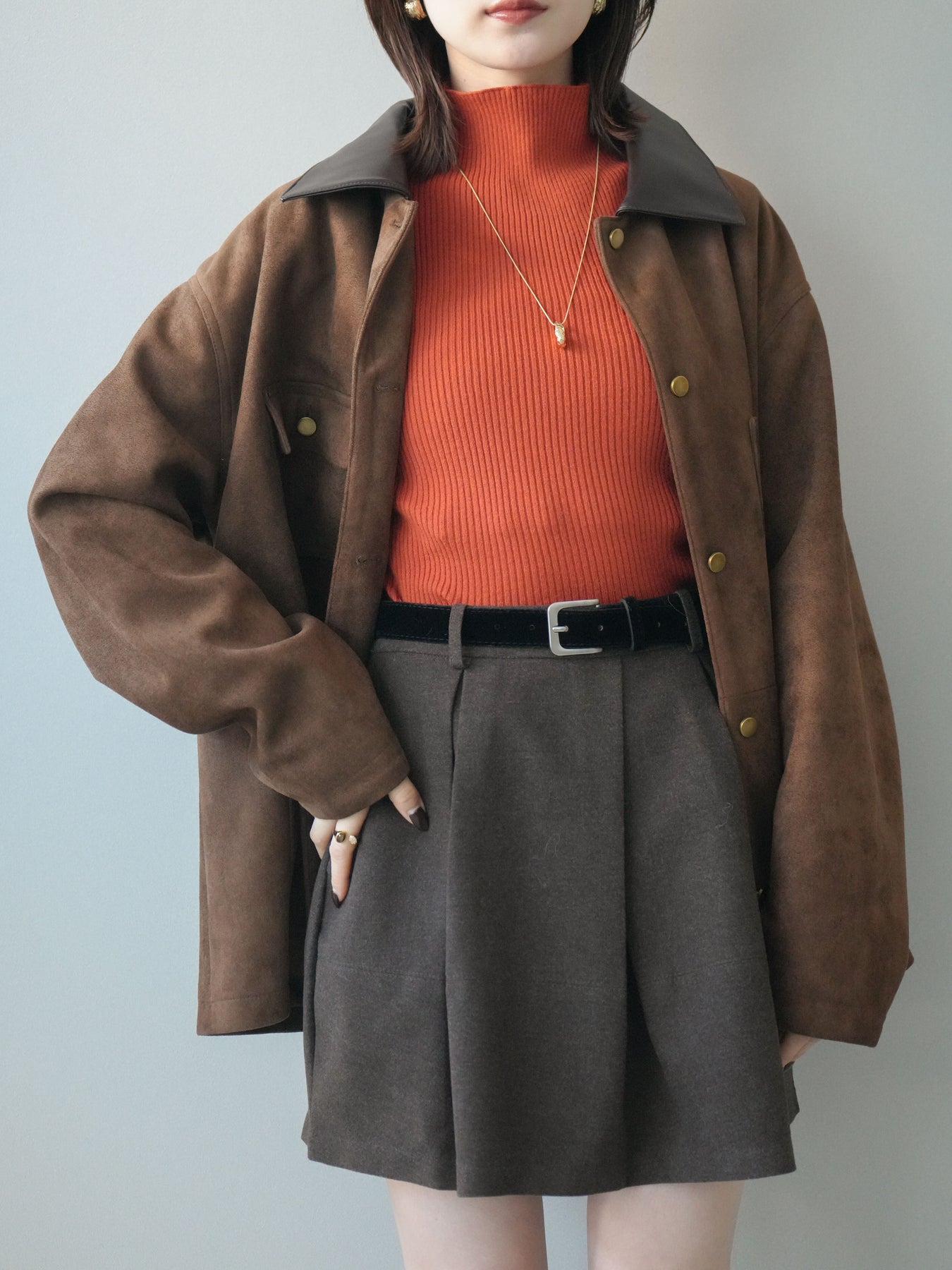 [SET]襟レザーステンカラースエードジャケット+袖ボタンボトルネックリブニットトップス(2set)