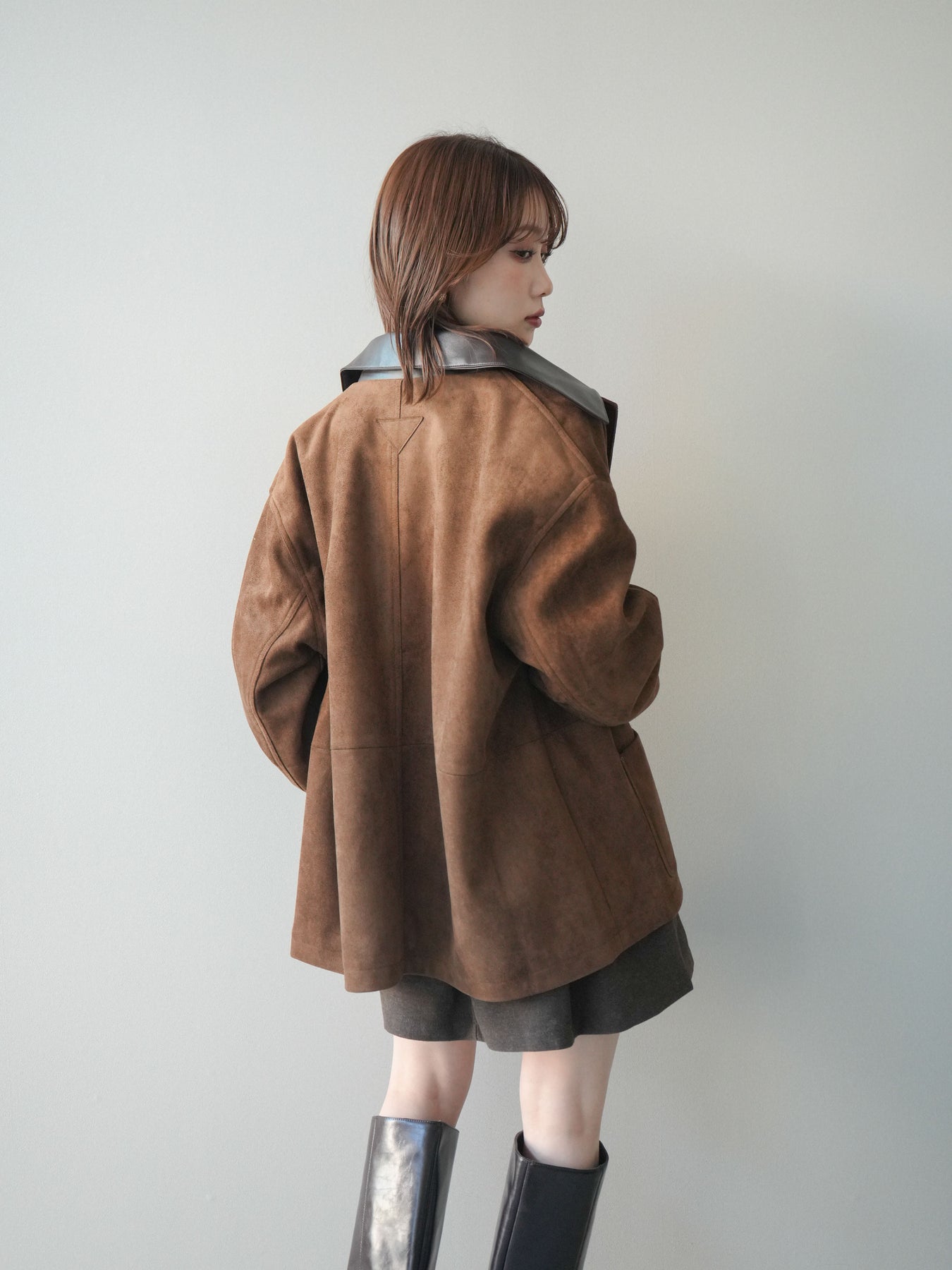 スエードタッチの柔らかな素材にレザー調の襟を組み合わせた、上品さとモード感を兼ね備えたステンカラージャケット。異素材のコントラストがスタイリングに奥行きを生み、シンプルなシルエットでもしっかりと存在感のある一枚に仕上がっています。大きめのポケットやメタルボタンがアクセントとなり、実用性とデザイン性を両立。ゆとりのあるシルエットでニットの上からも羽織りやすく、デイリーからきれいめコーデまで幅広く活躍する万能アウターです。 ※ボトムス、キャミソール(インナー)以外の商品は一律でインナーは付属していません。