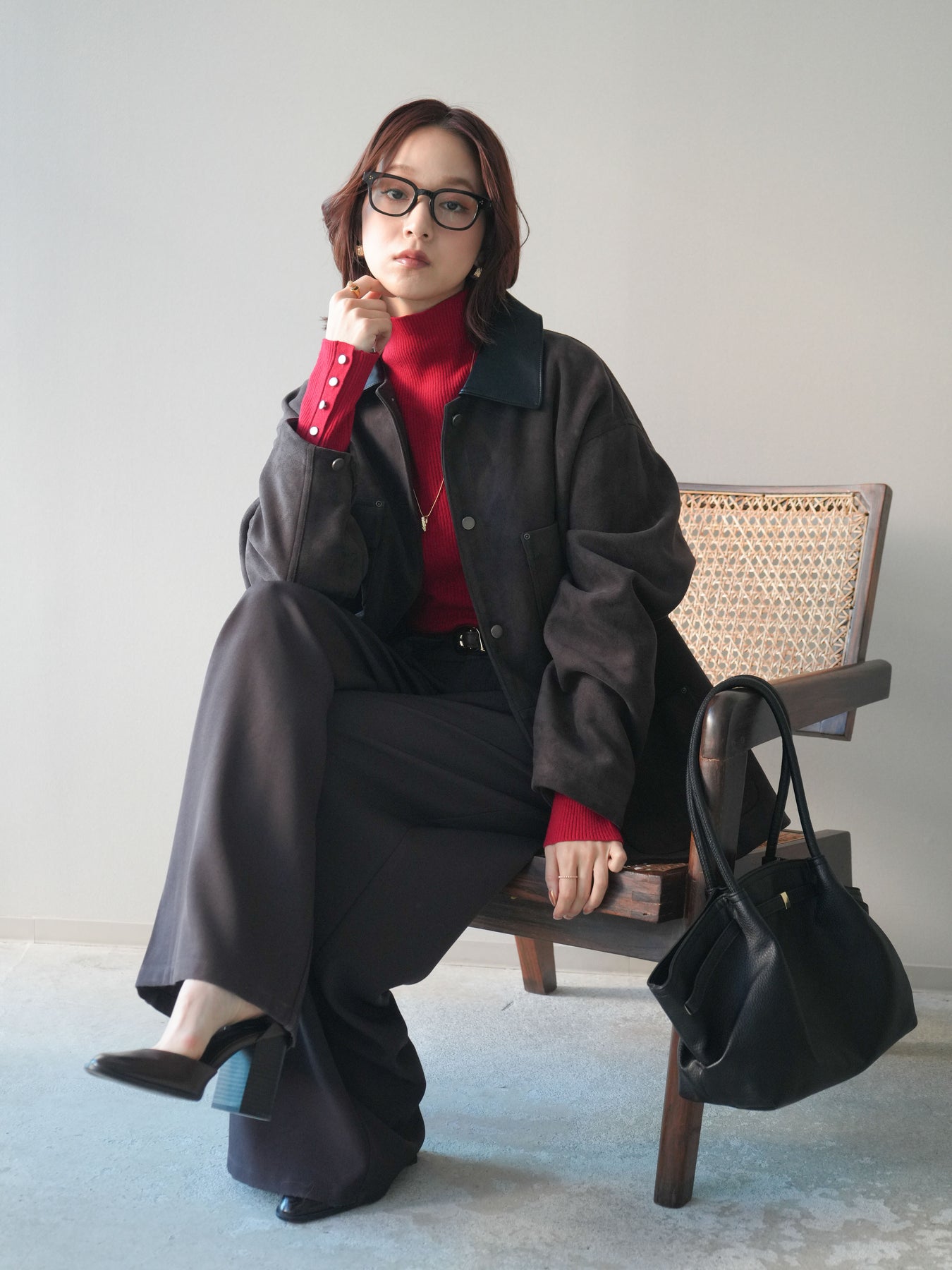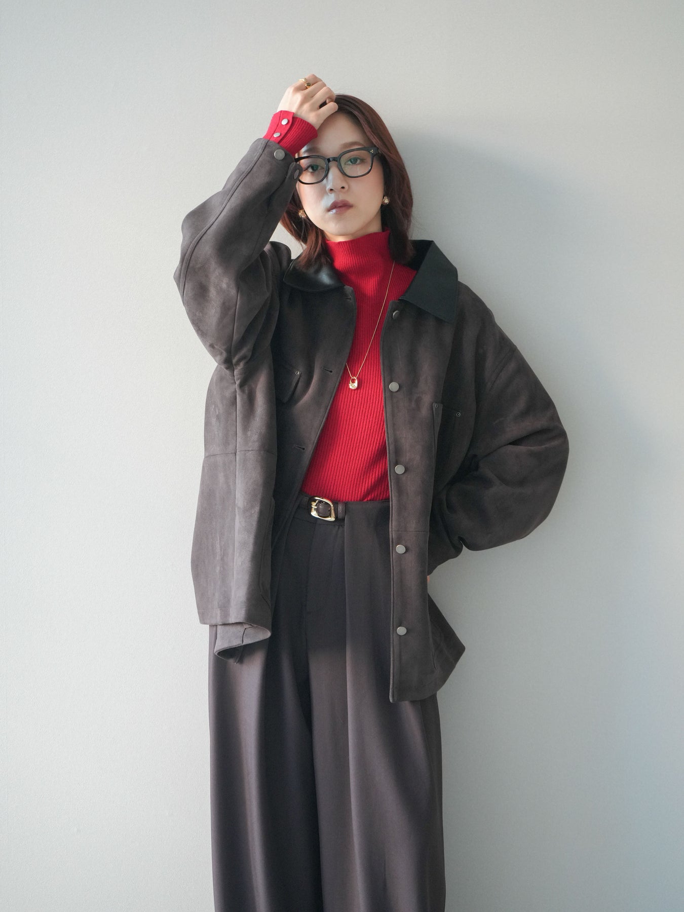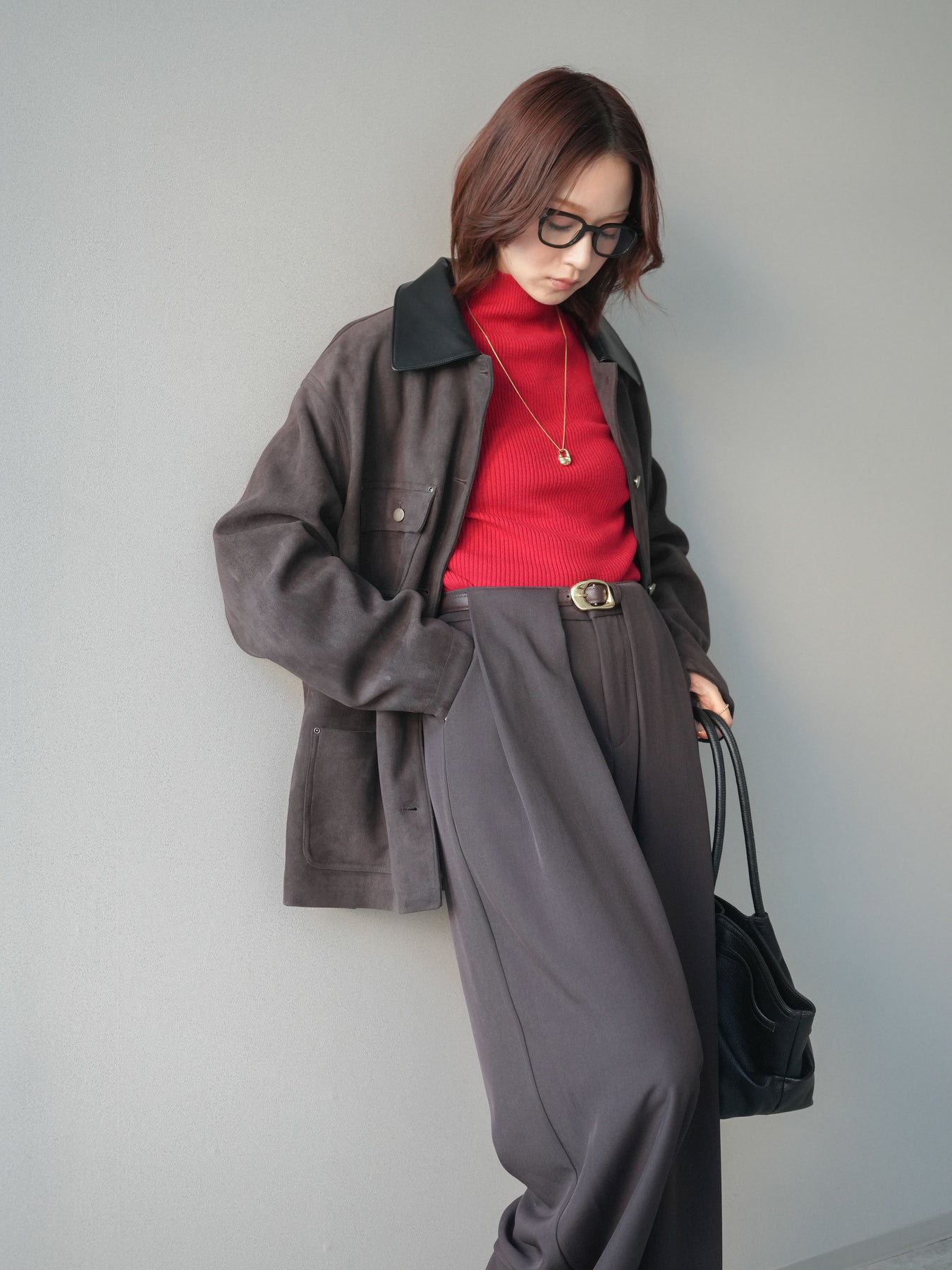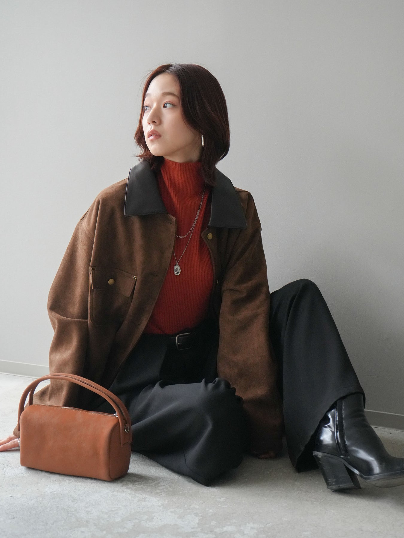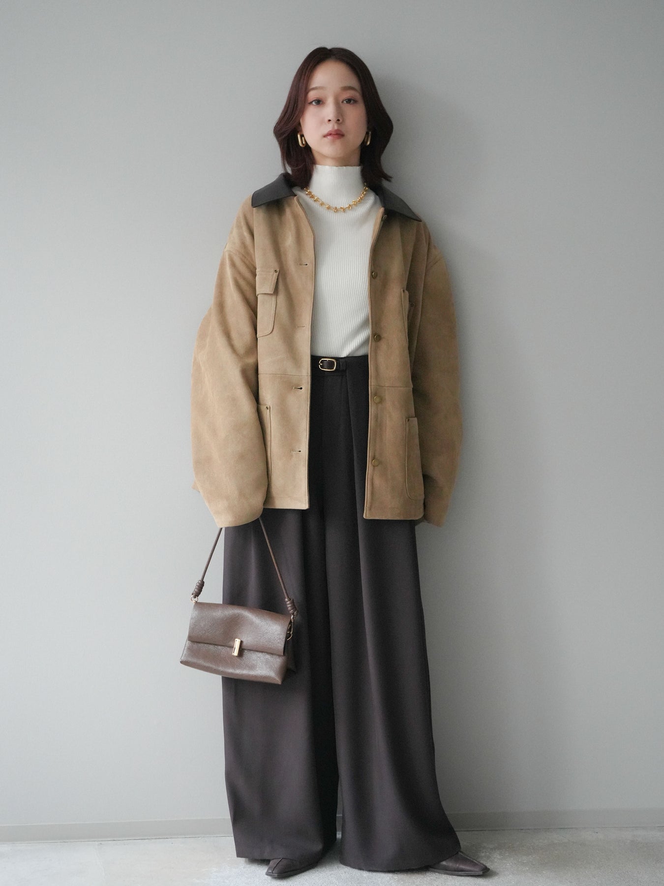 [SET]襟レザーステンカラースエードジャケット+袖ボタンボトルネックリブニットトップス+ベルトループデザインワイドパンツ(3set)