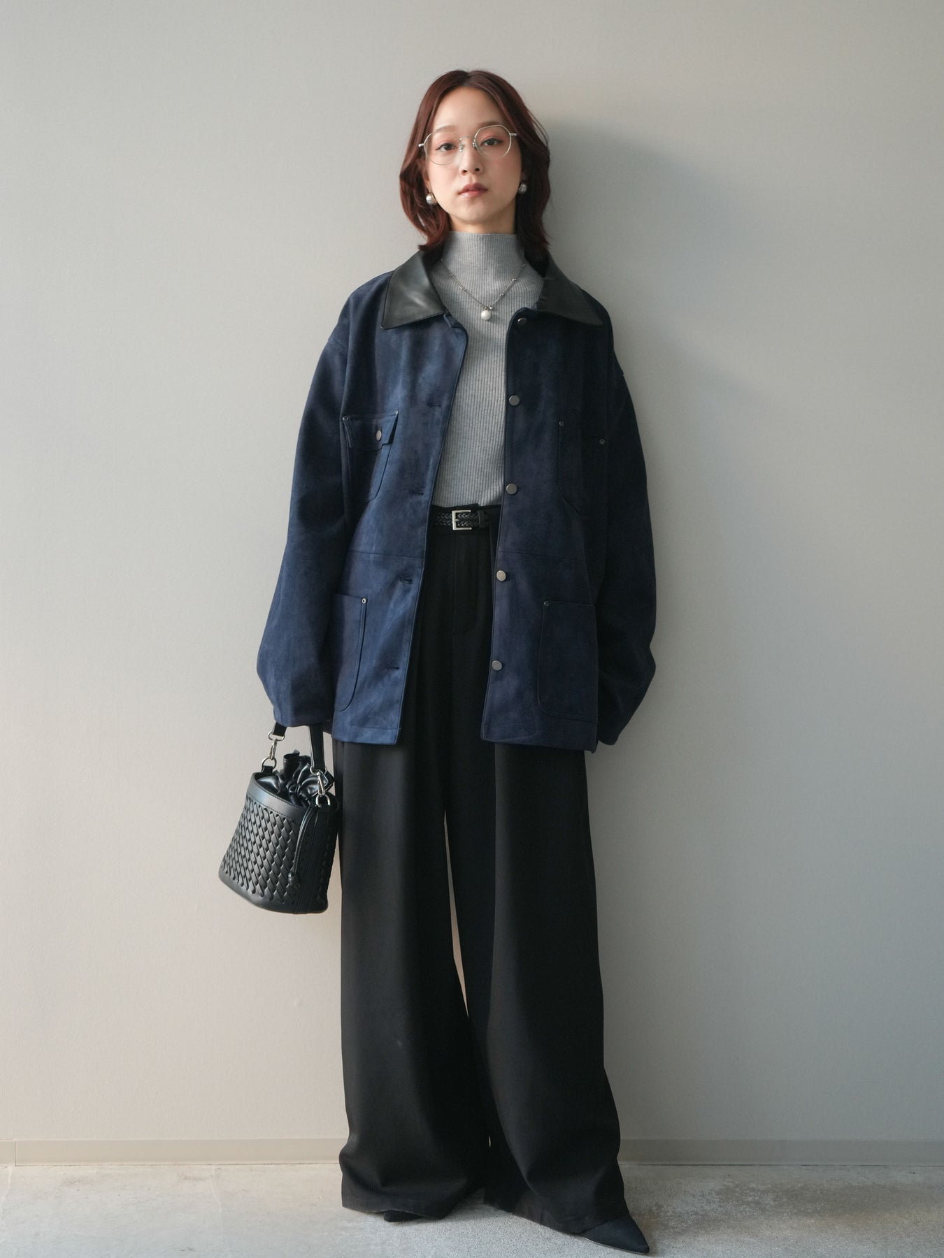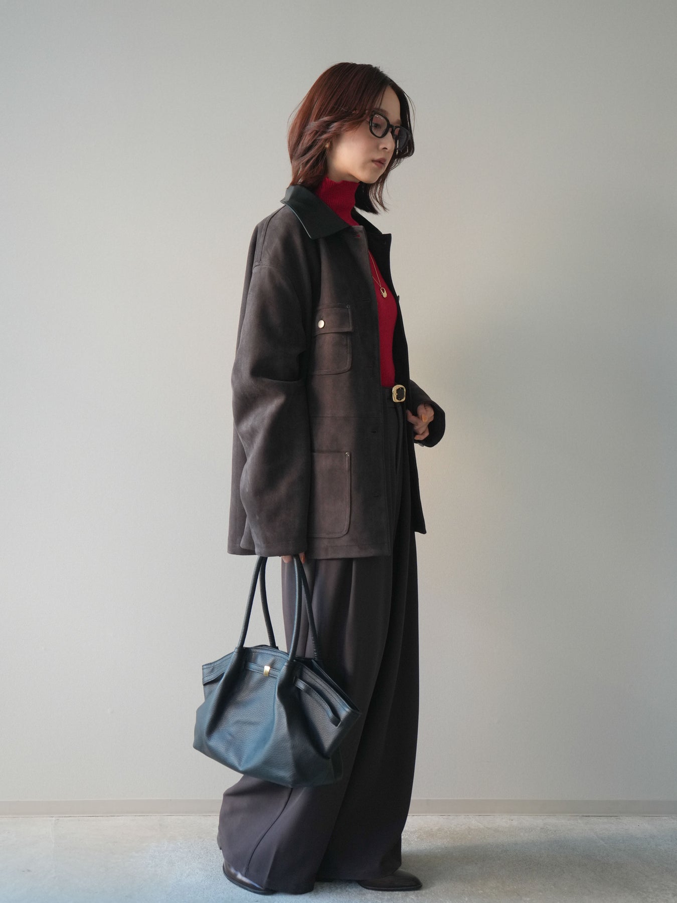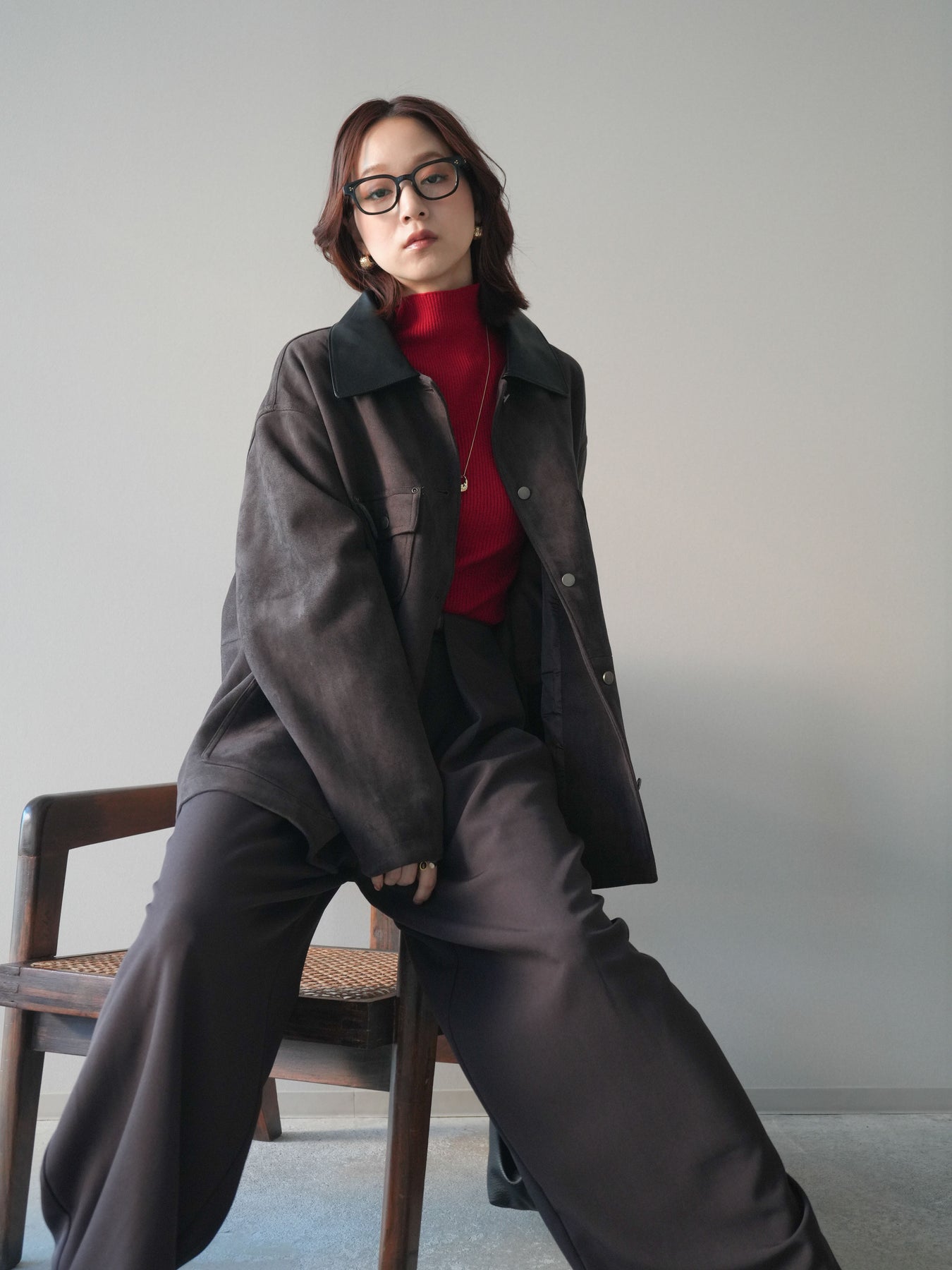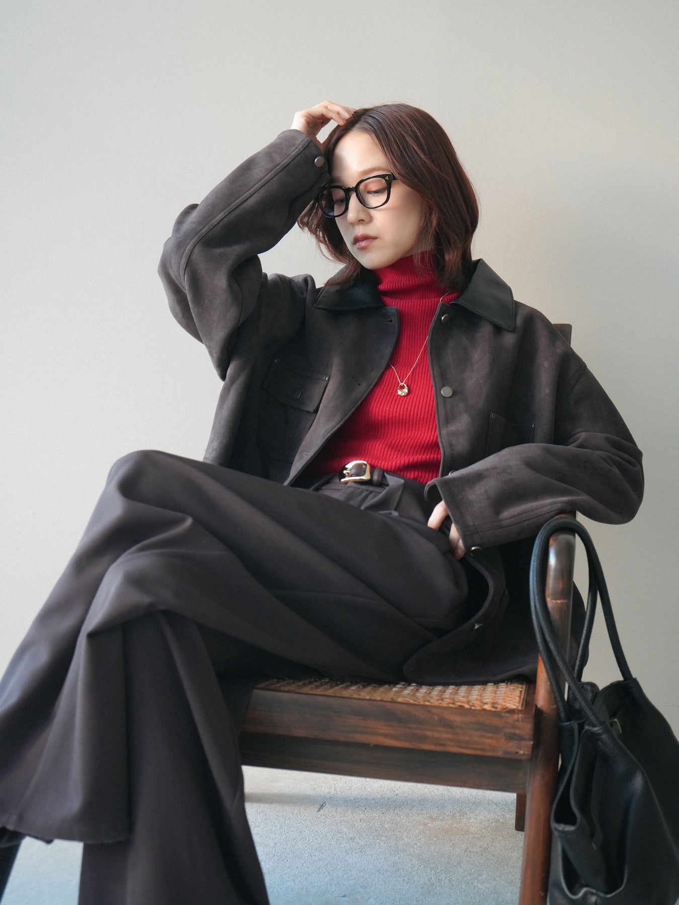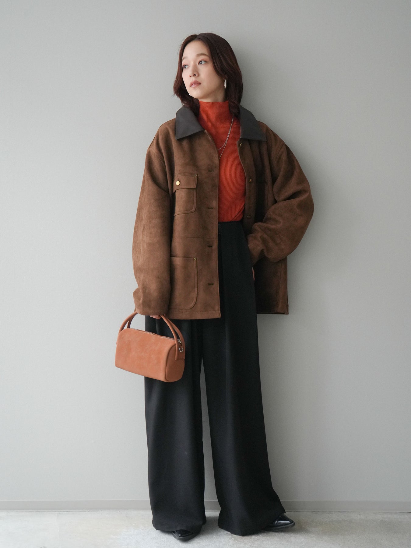 [SET]襟レザーステンカラースエードジャケット+袖ボタンボトルネックリブニットトップス+ベルトループデザインワイドパンツ(3set)