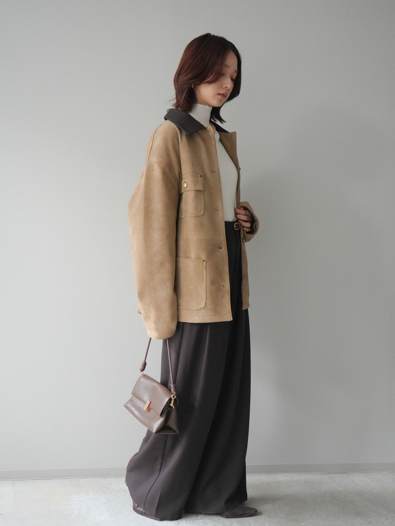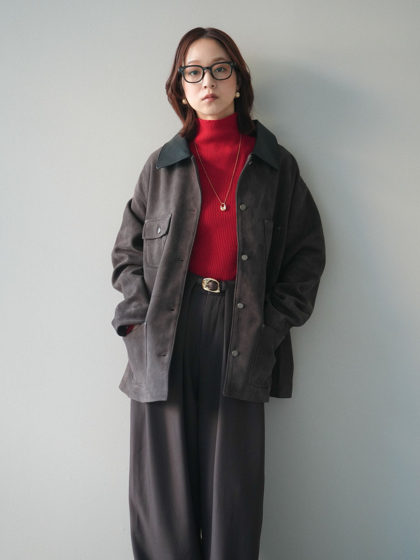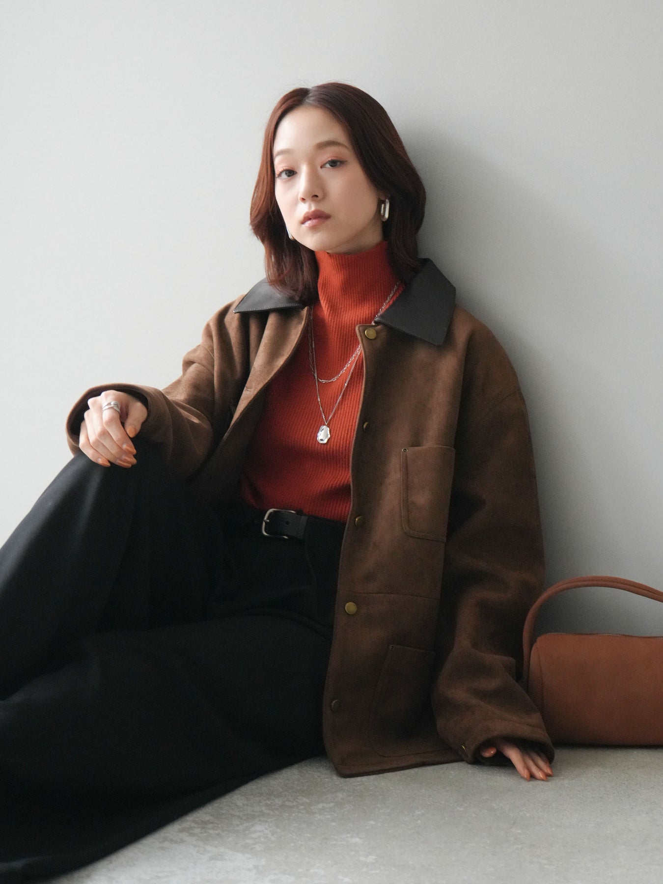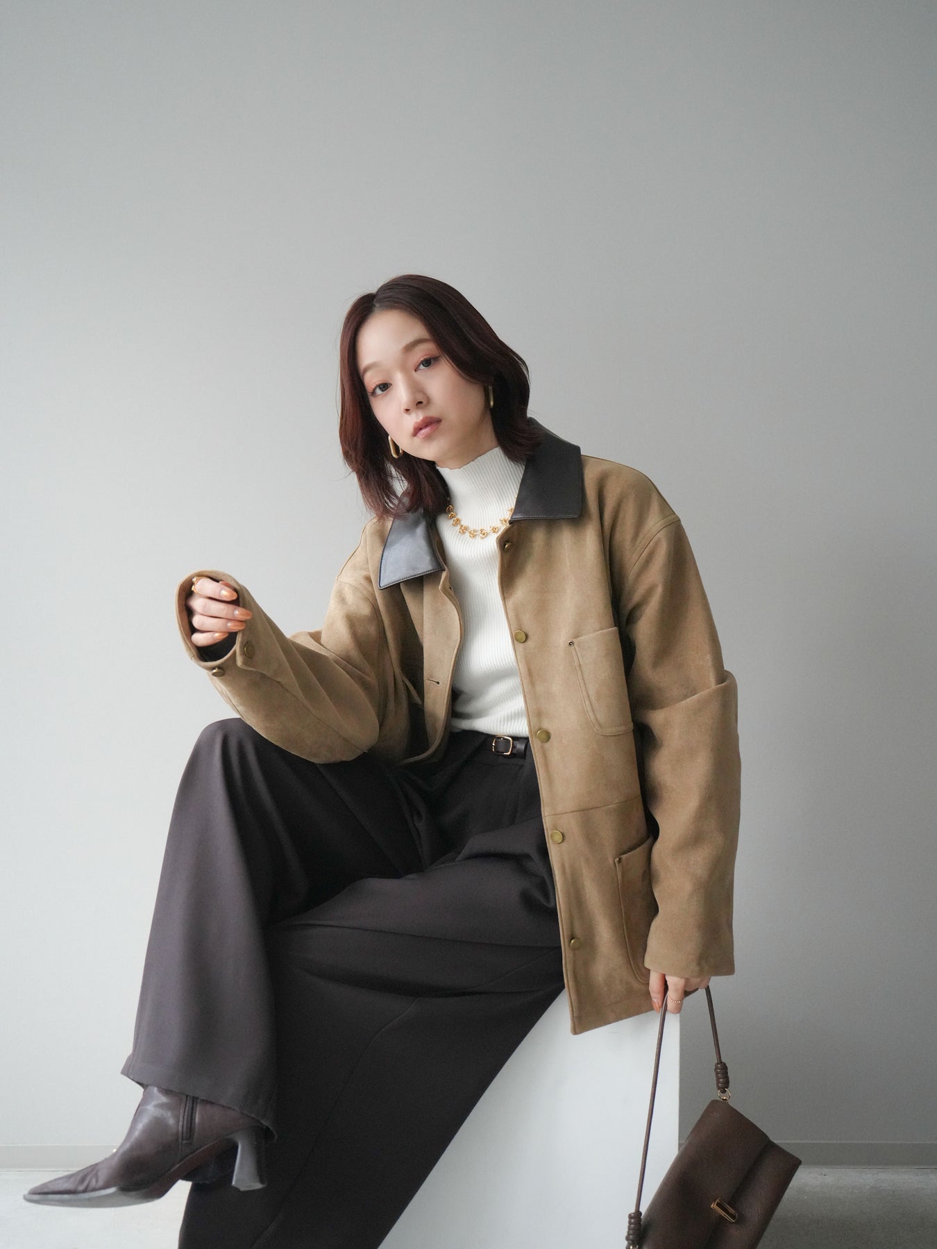 [SET]襟レザーステンカラースエードジャケット+袖ボタンボトルネックリブニットトップス+ベルトループデザインワイドパンツ(3set)