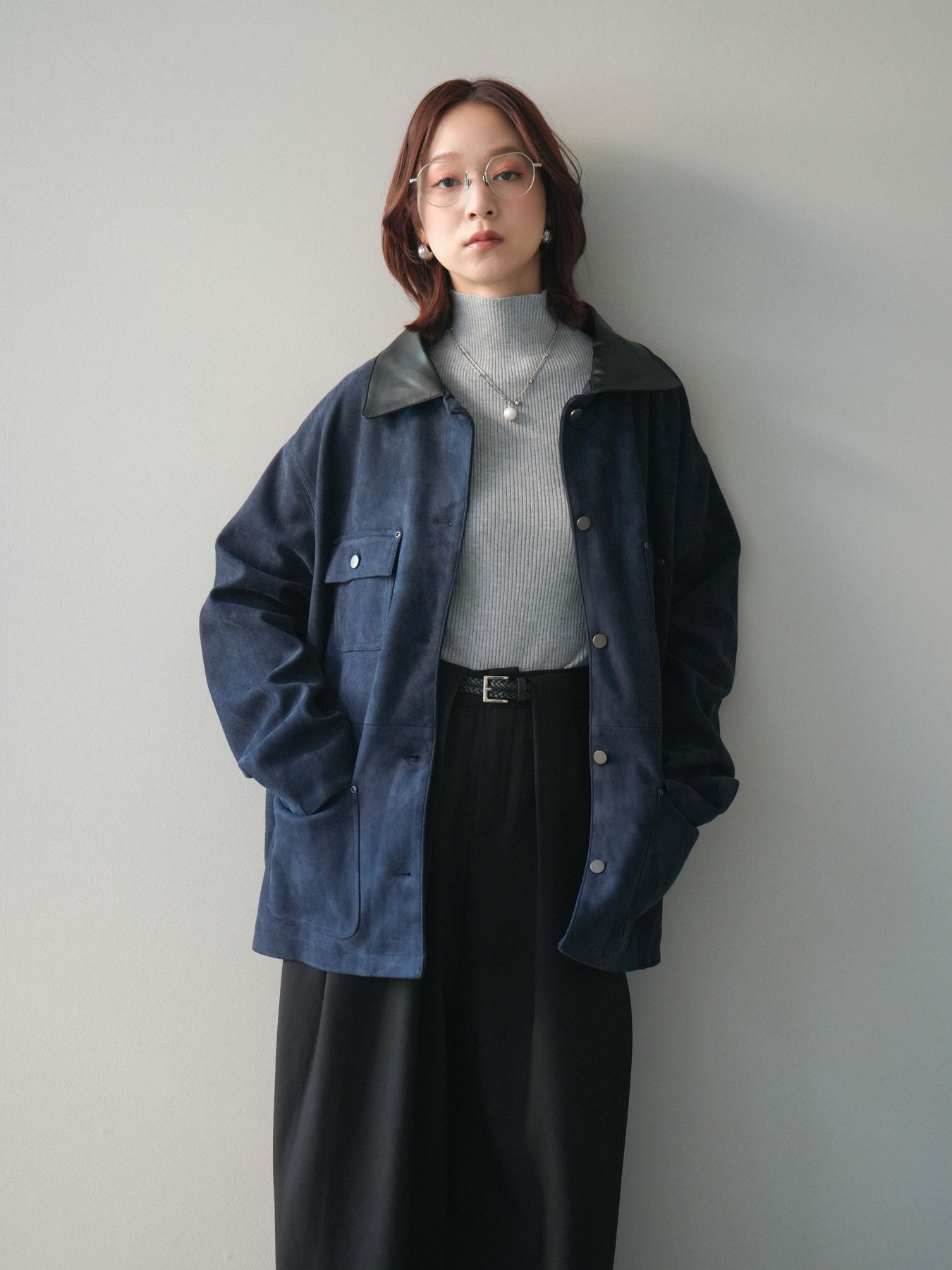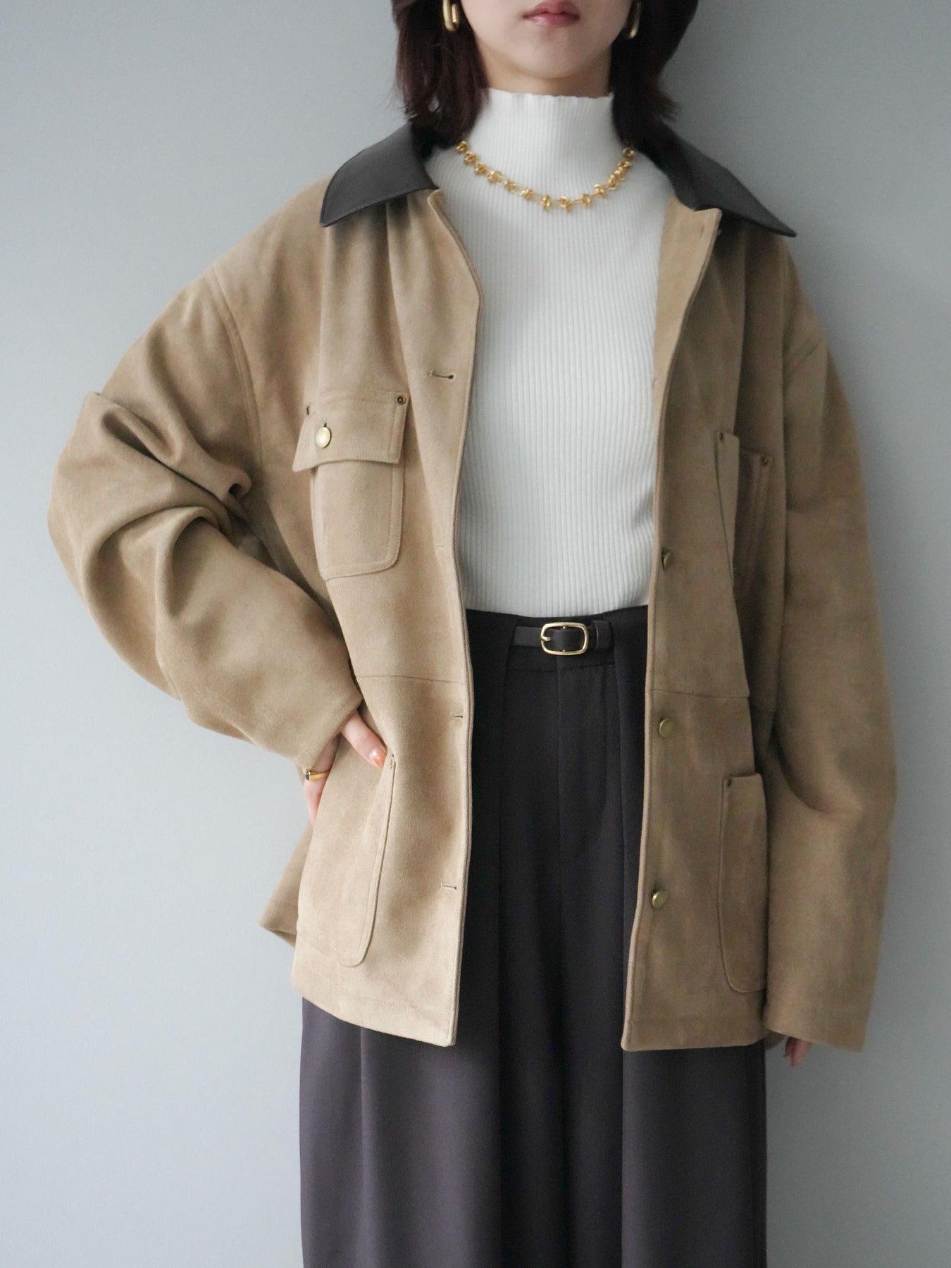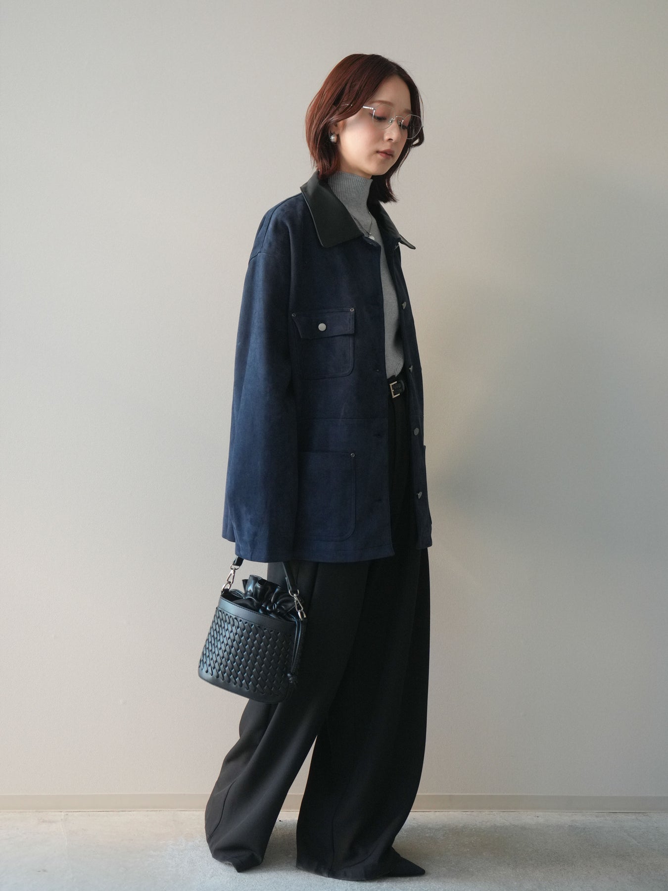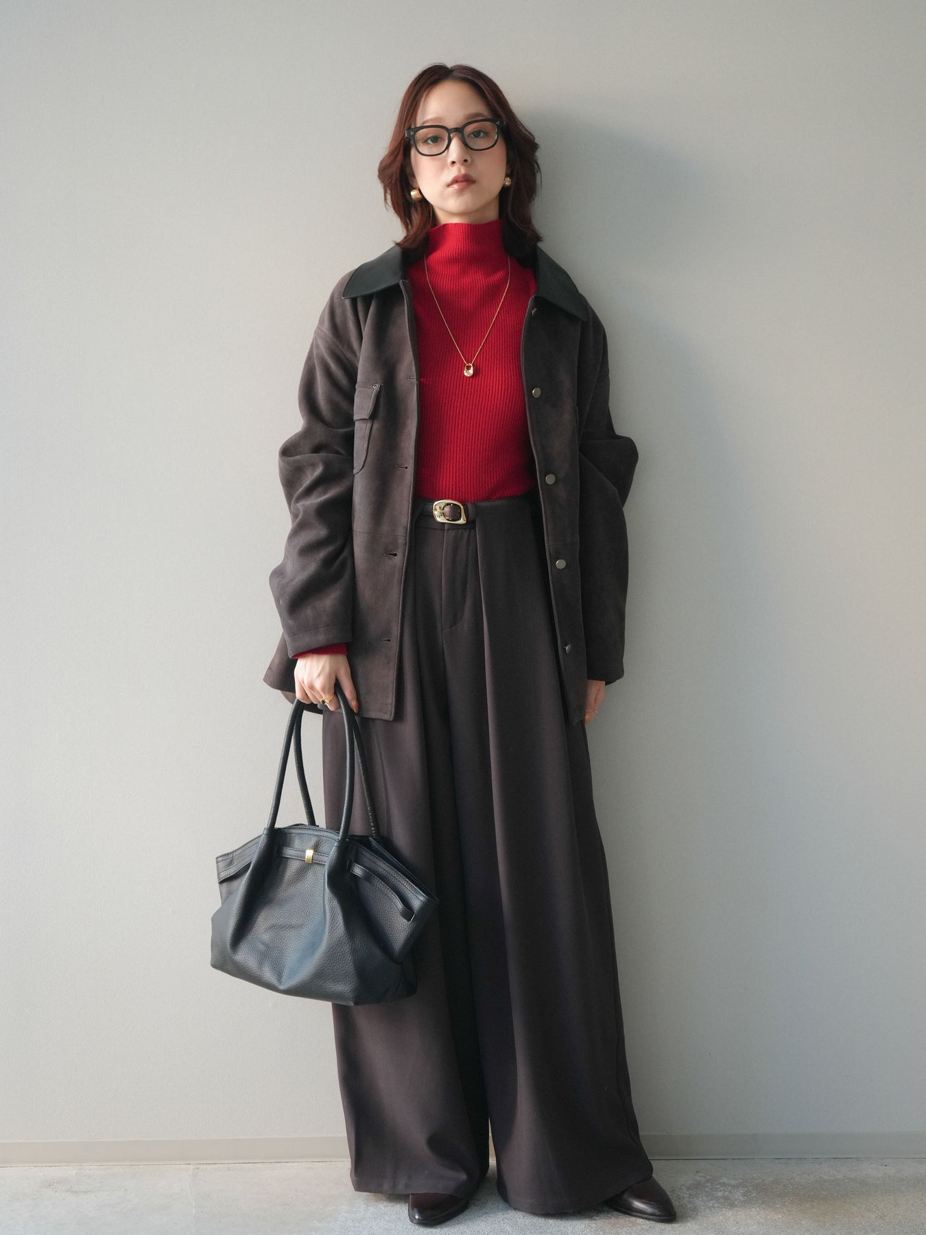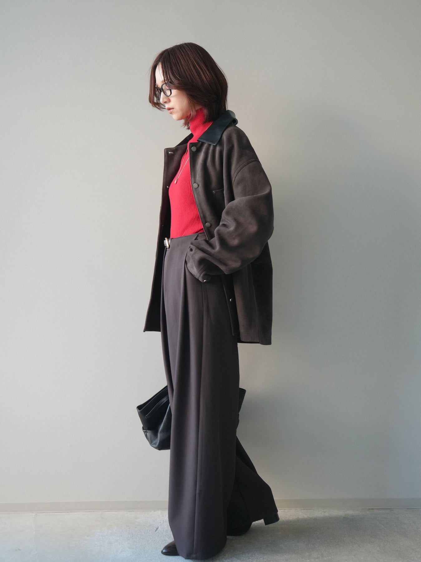 [SET]襟レザーステンカラースエードジャケット+袖ボタンボトルネックリブニットトップス+ベルトループデザインワイドパンツ(3set)