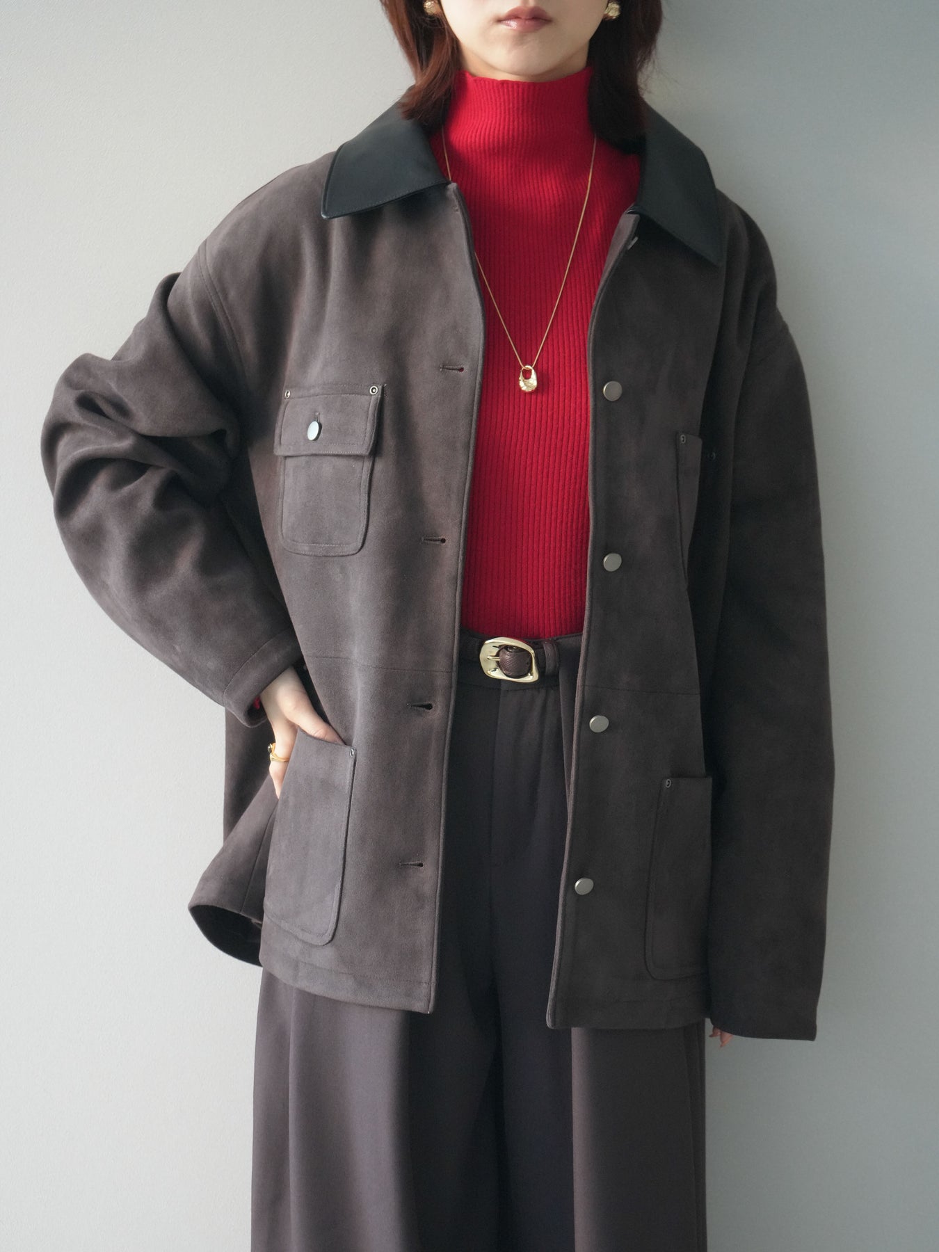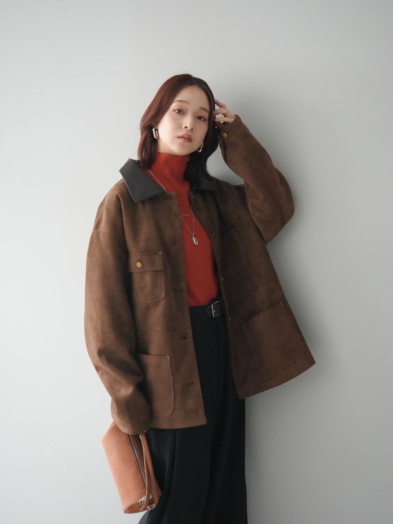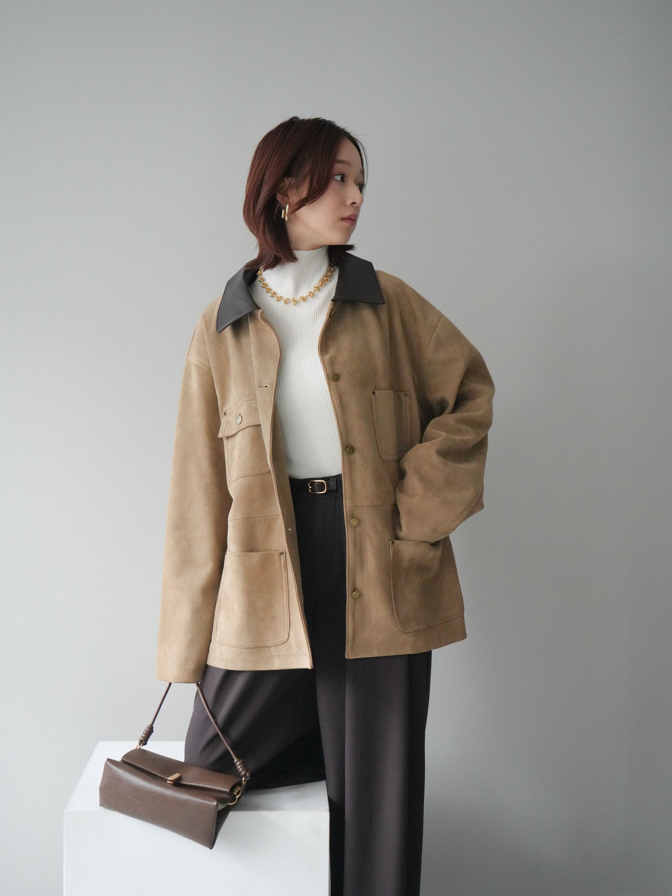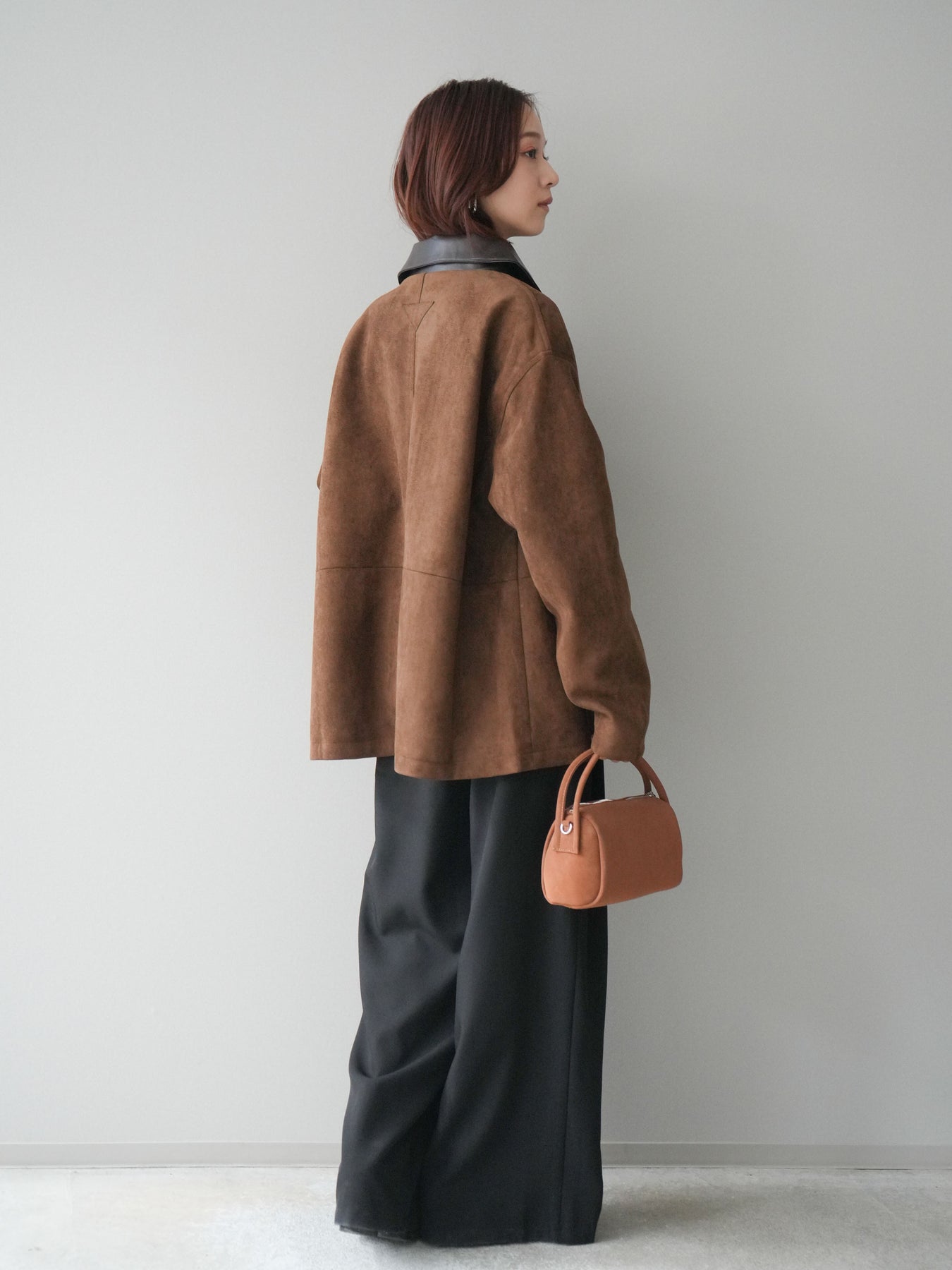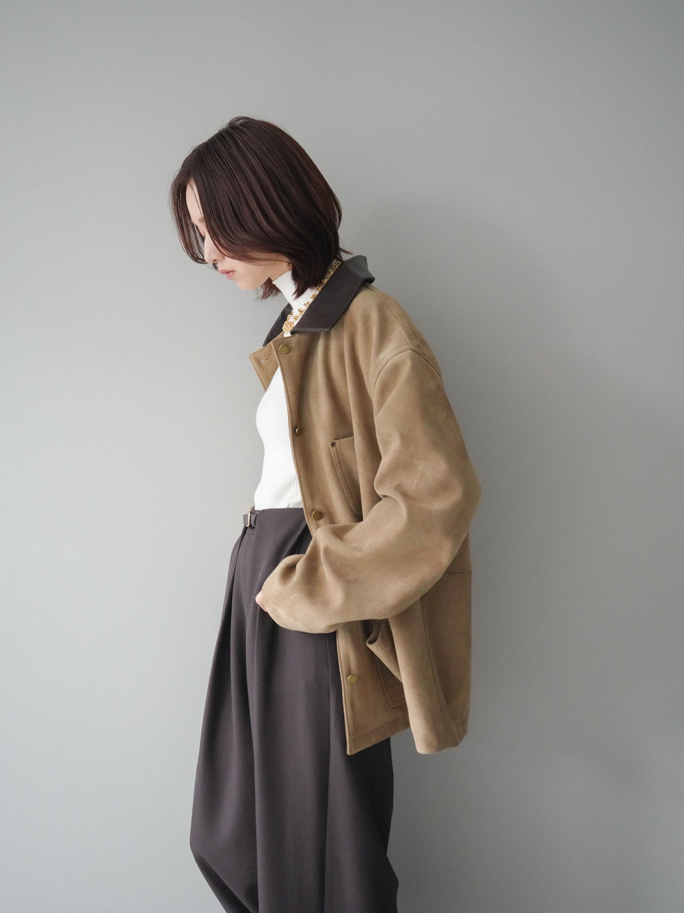 [SET]襟レザーステンカラースエードジャケット+袖ボタンボトルネックリブニットトップス+ベルトループデザインワイドパンツ(3set)