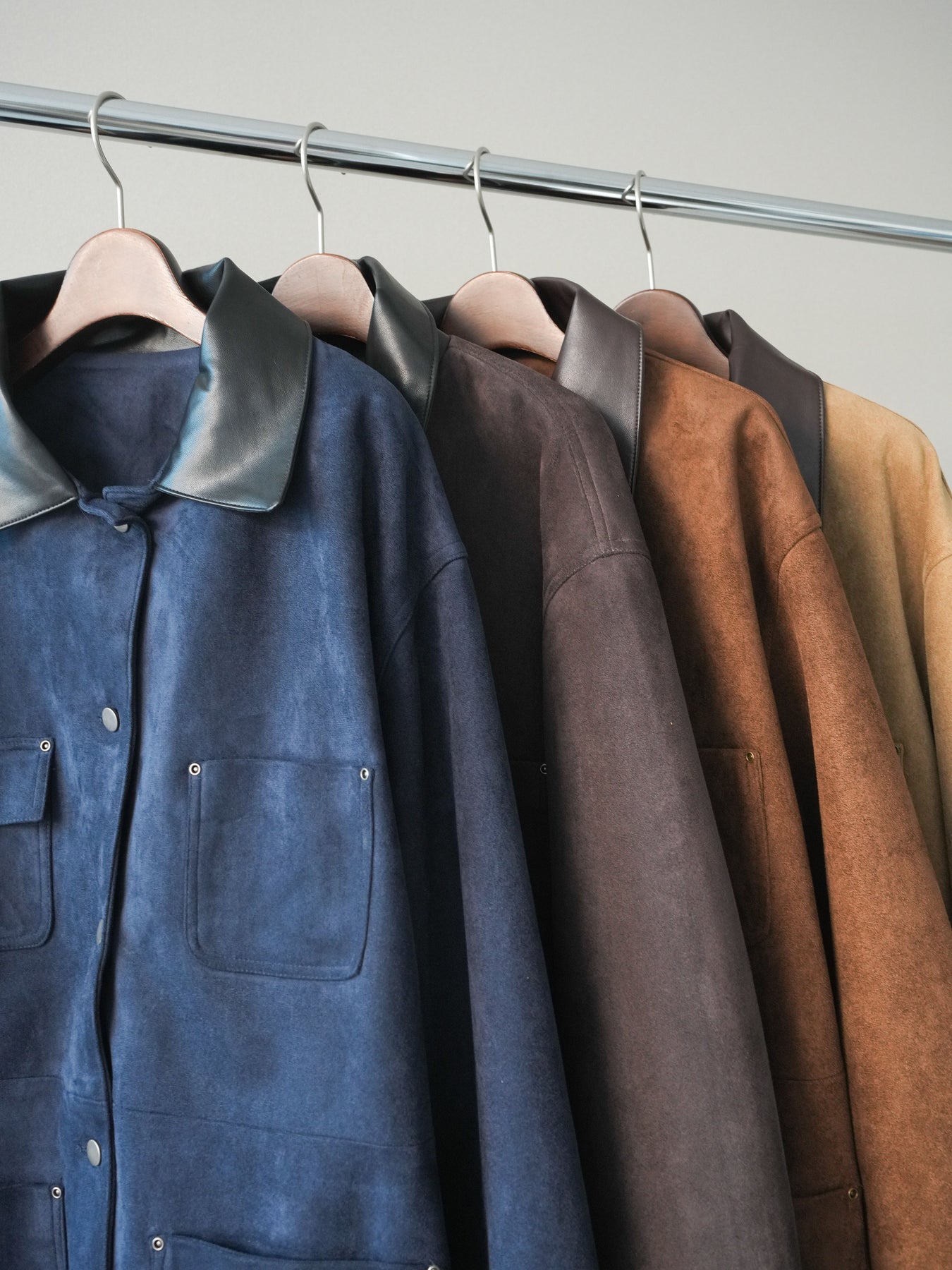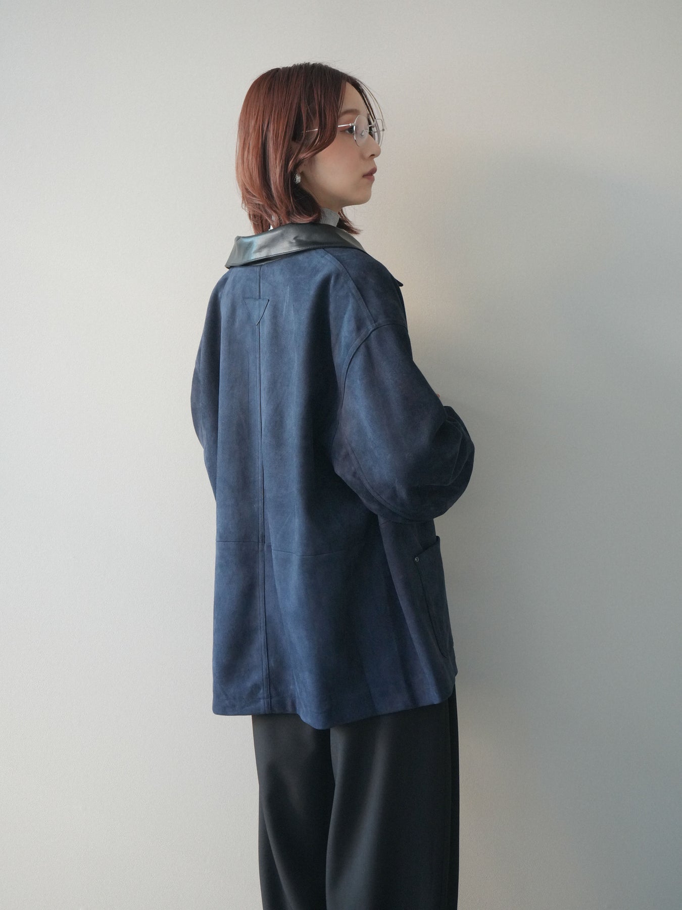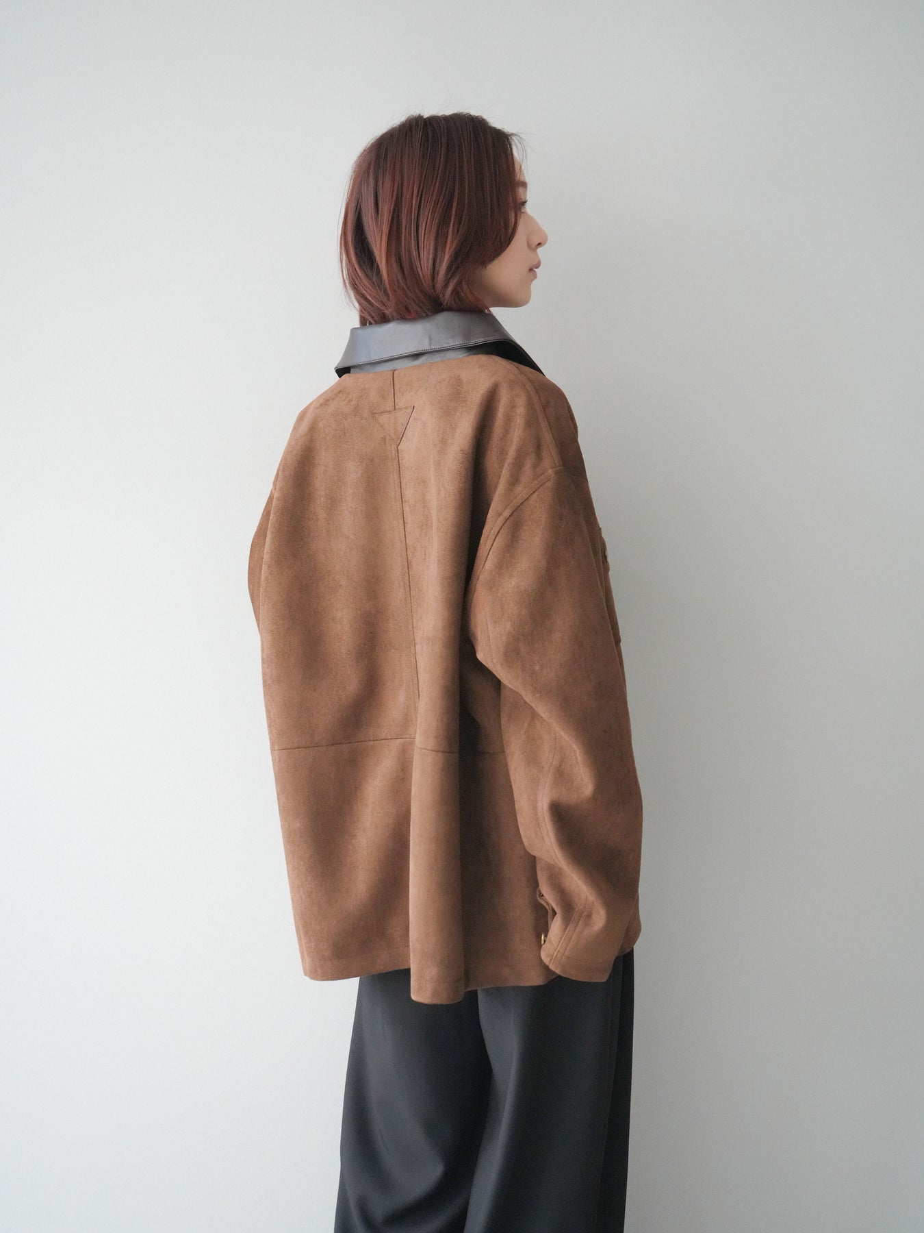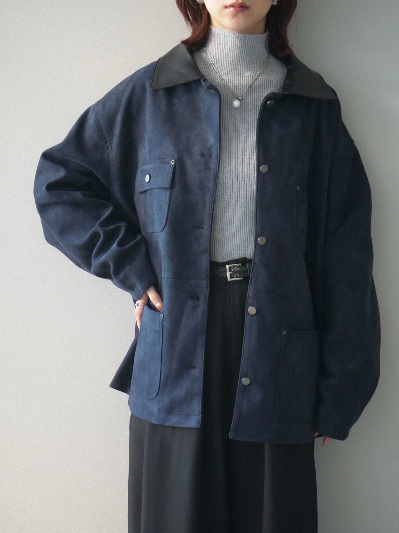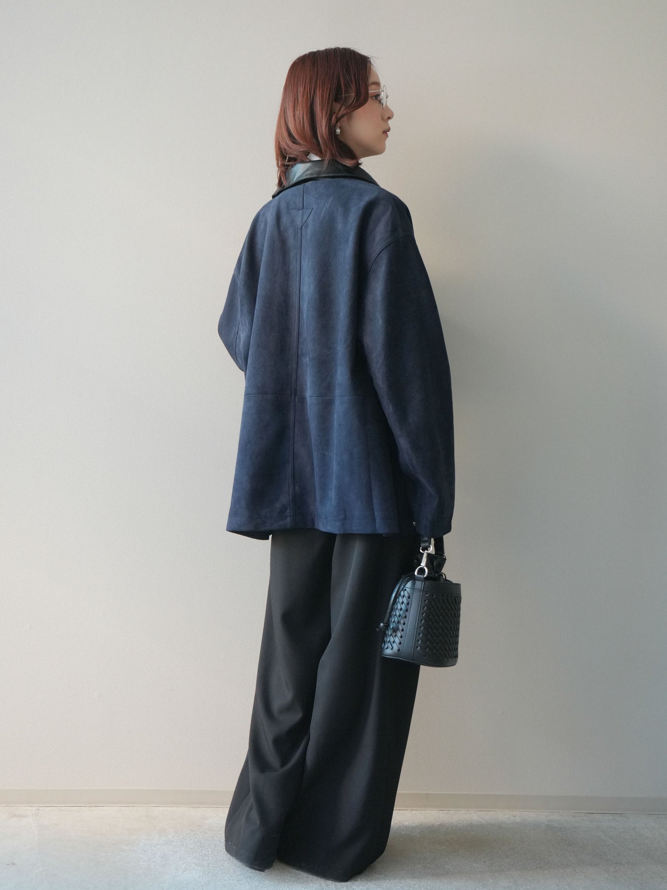 [SET]襟レザーステンカラースエードジャケット+袖ボタンボトルネックリブニットトップス+ベルトループデザインワイドパンツ(3set)