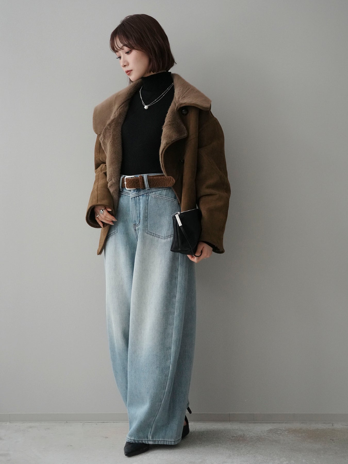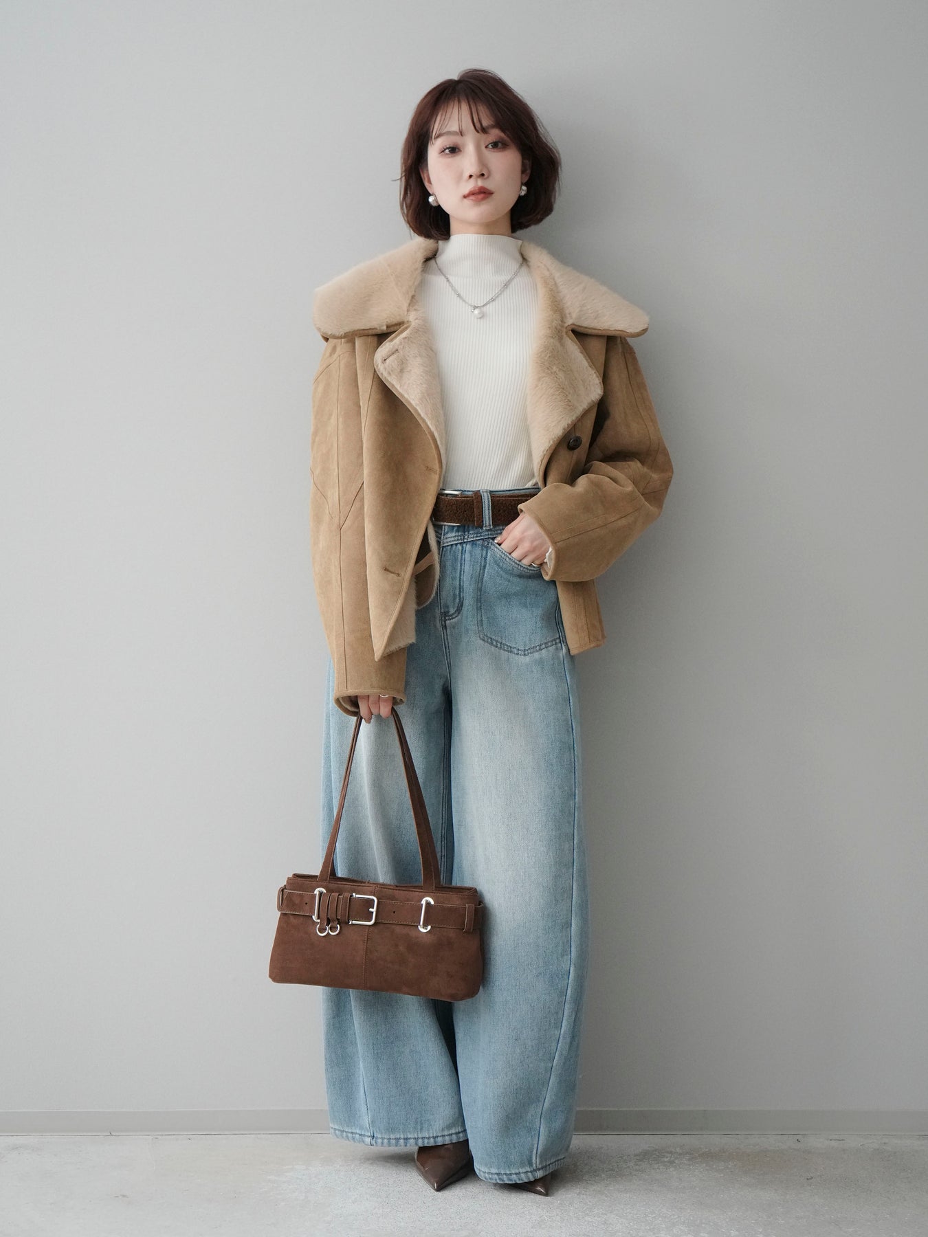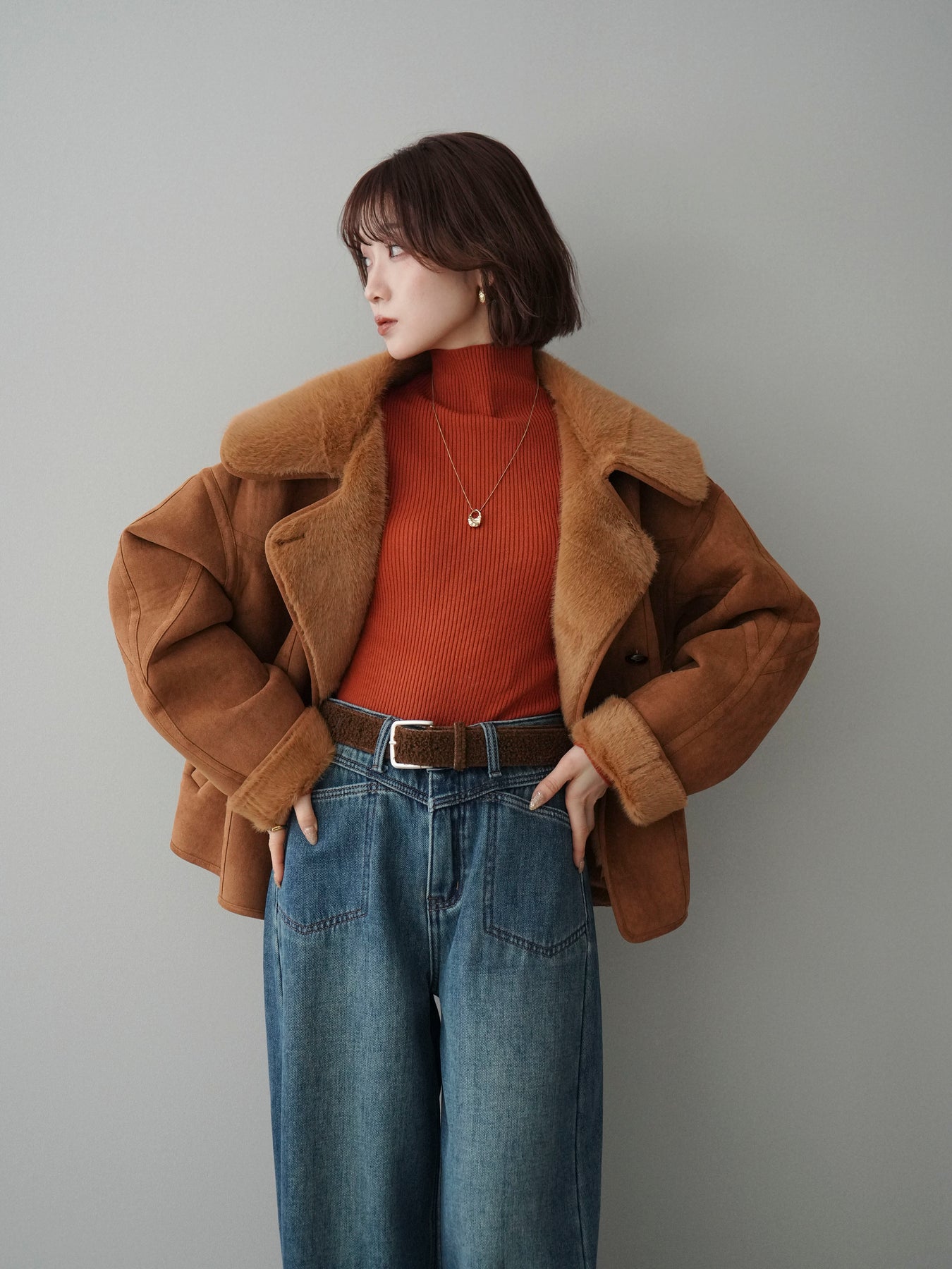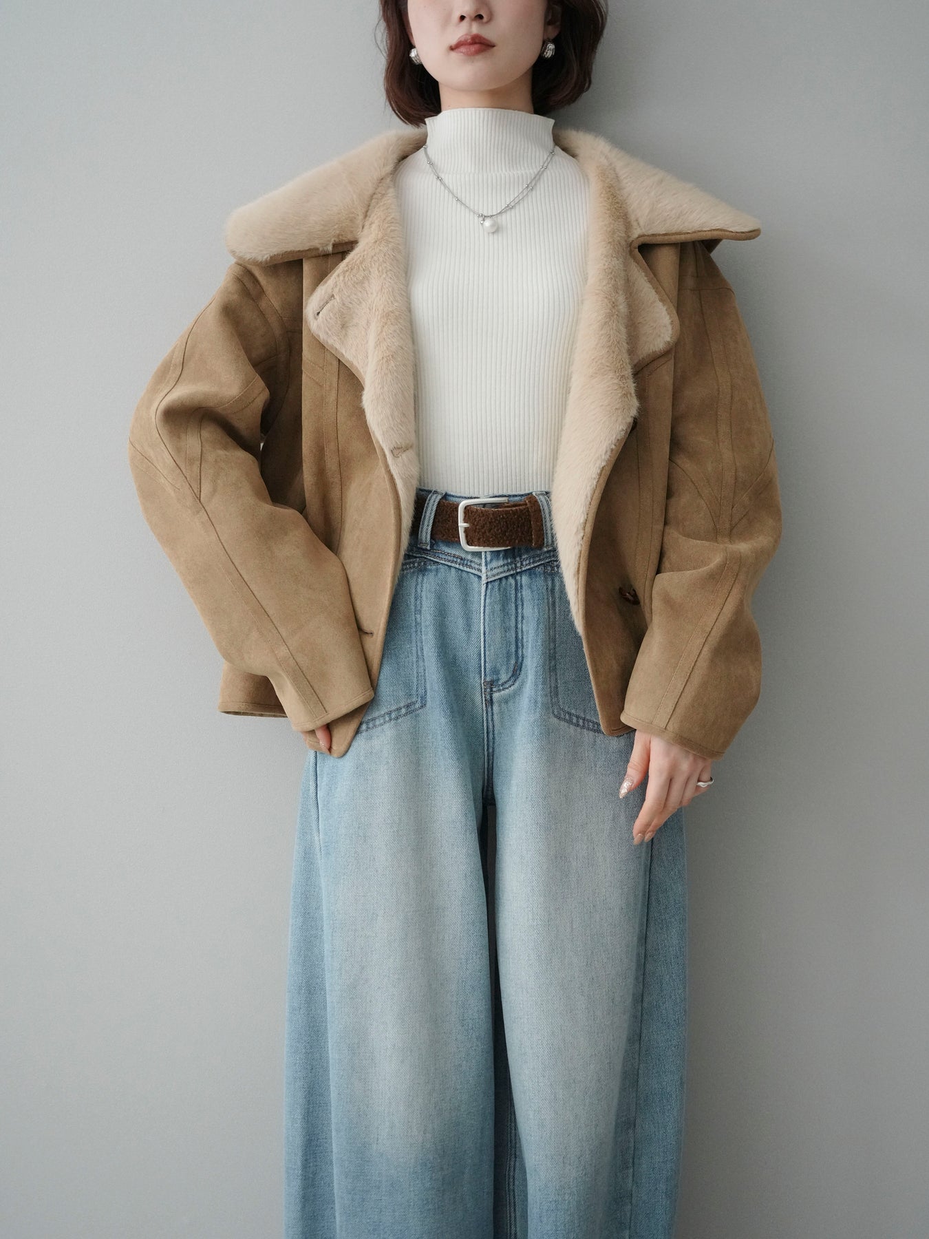 [SET]ムートンショートジャケット+袖ボタンボトルネックリブニットトップス+ベルト付裏起毛カーブデニムパンツ(3set)