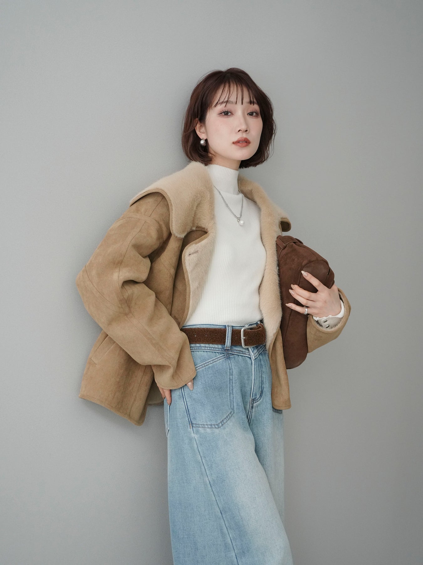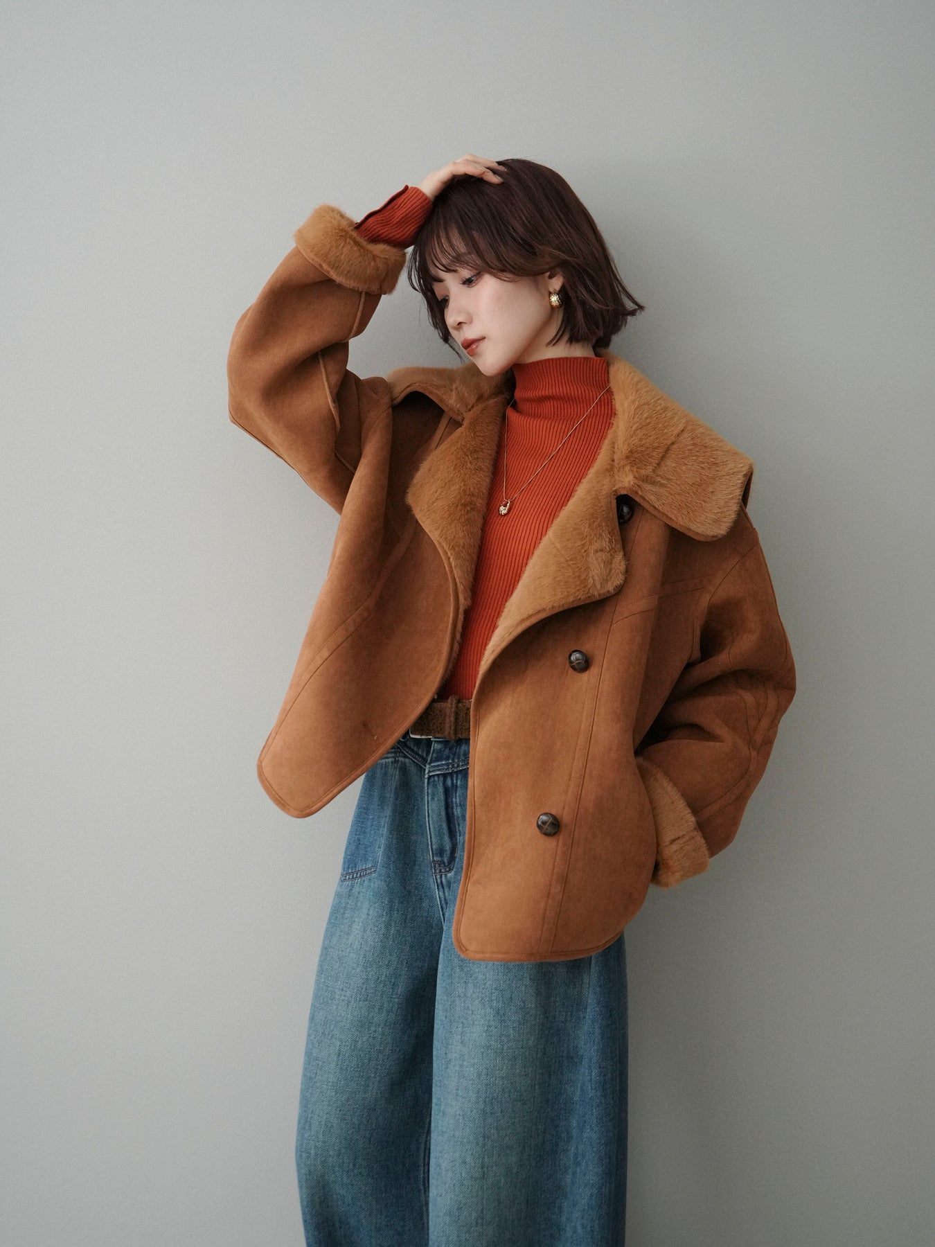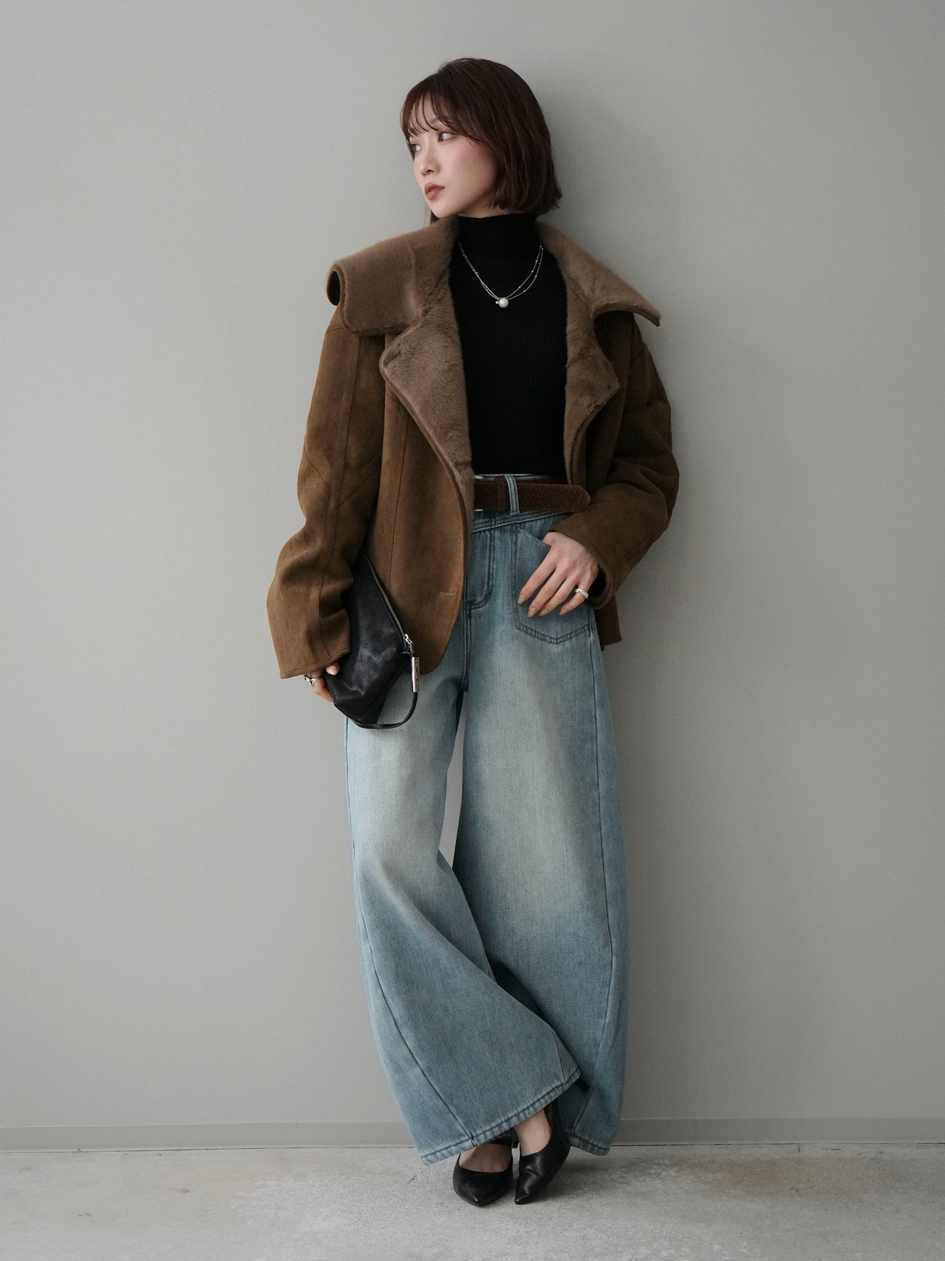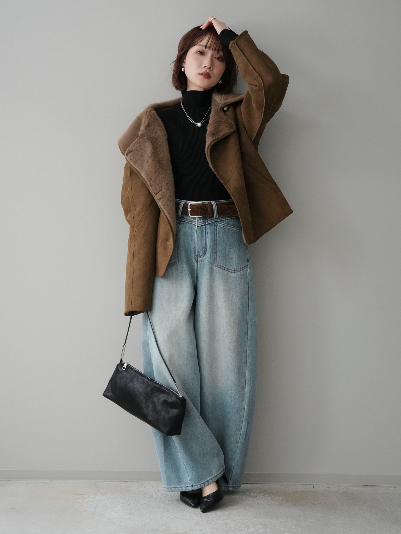 [SET]ムートンショートジャケット+袖ボタンボトルネックリブニットトップス+ベルト付裏起毛カーブデニムパンツ(3set)