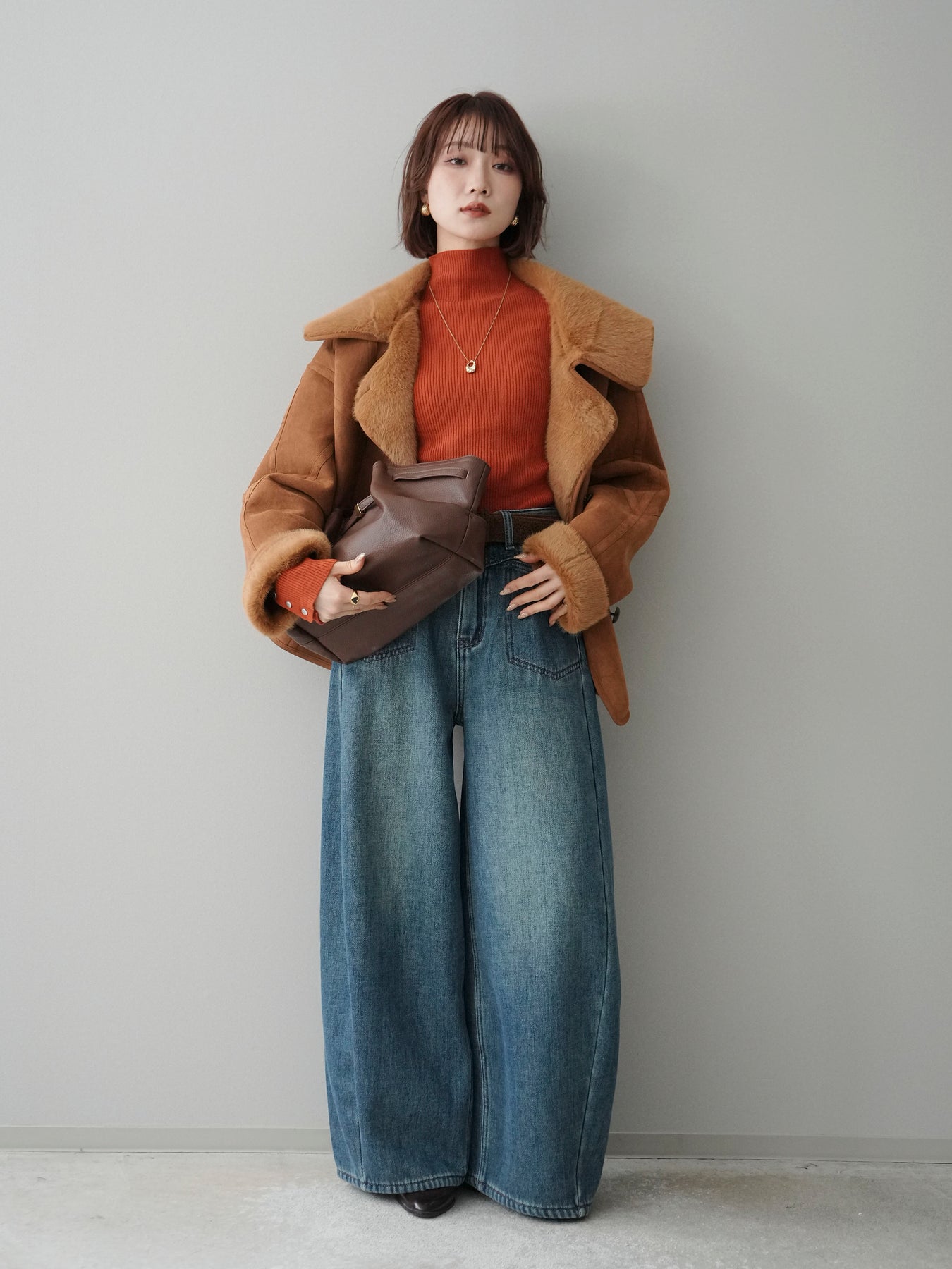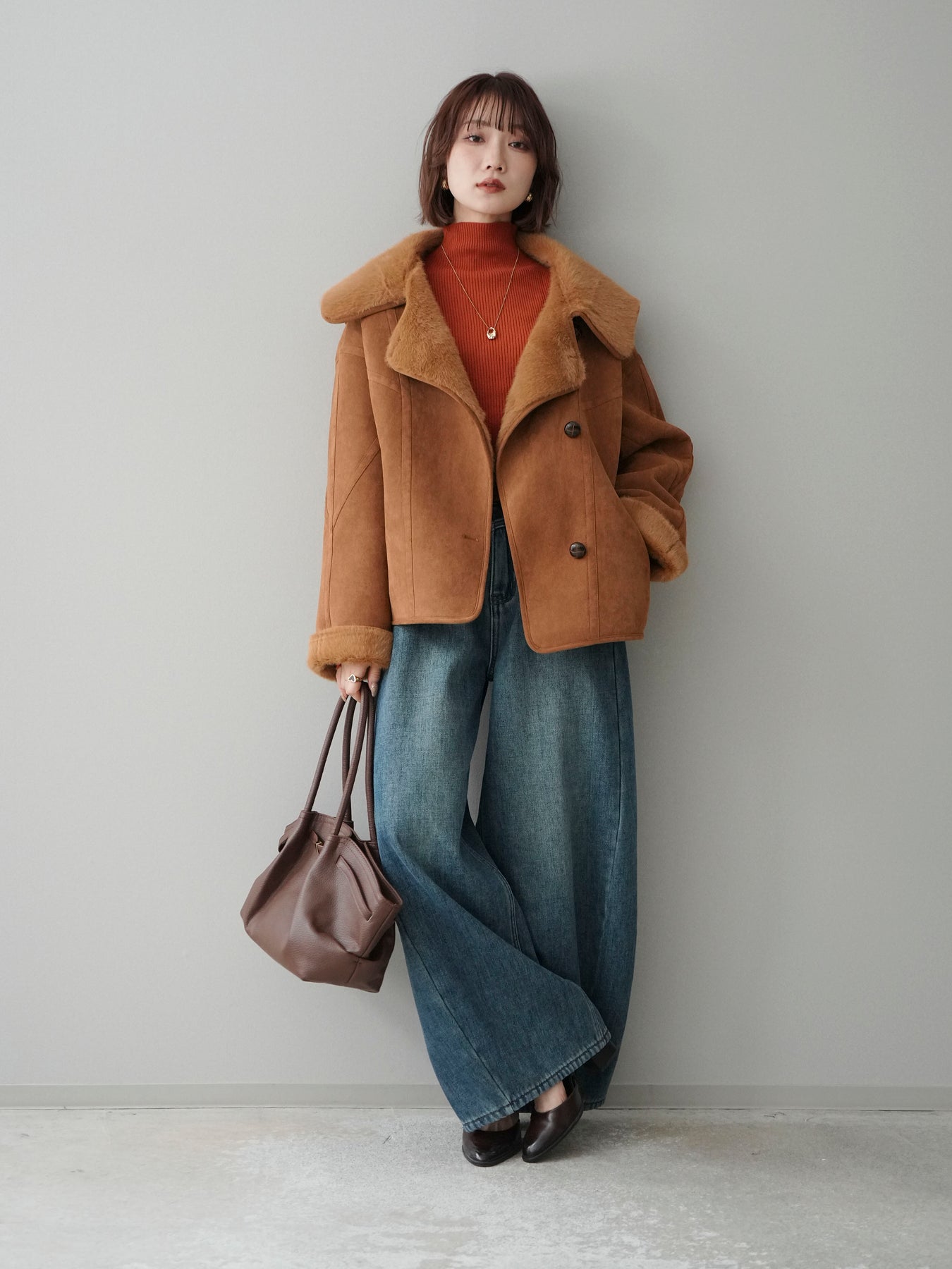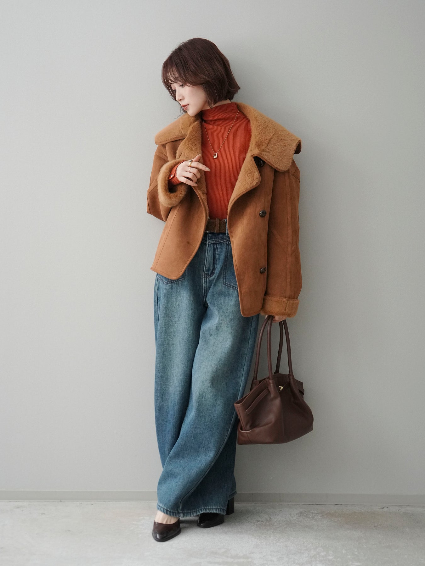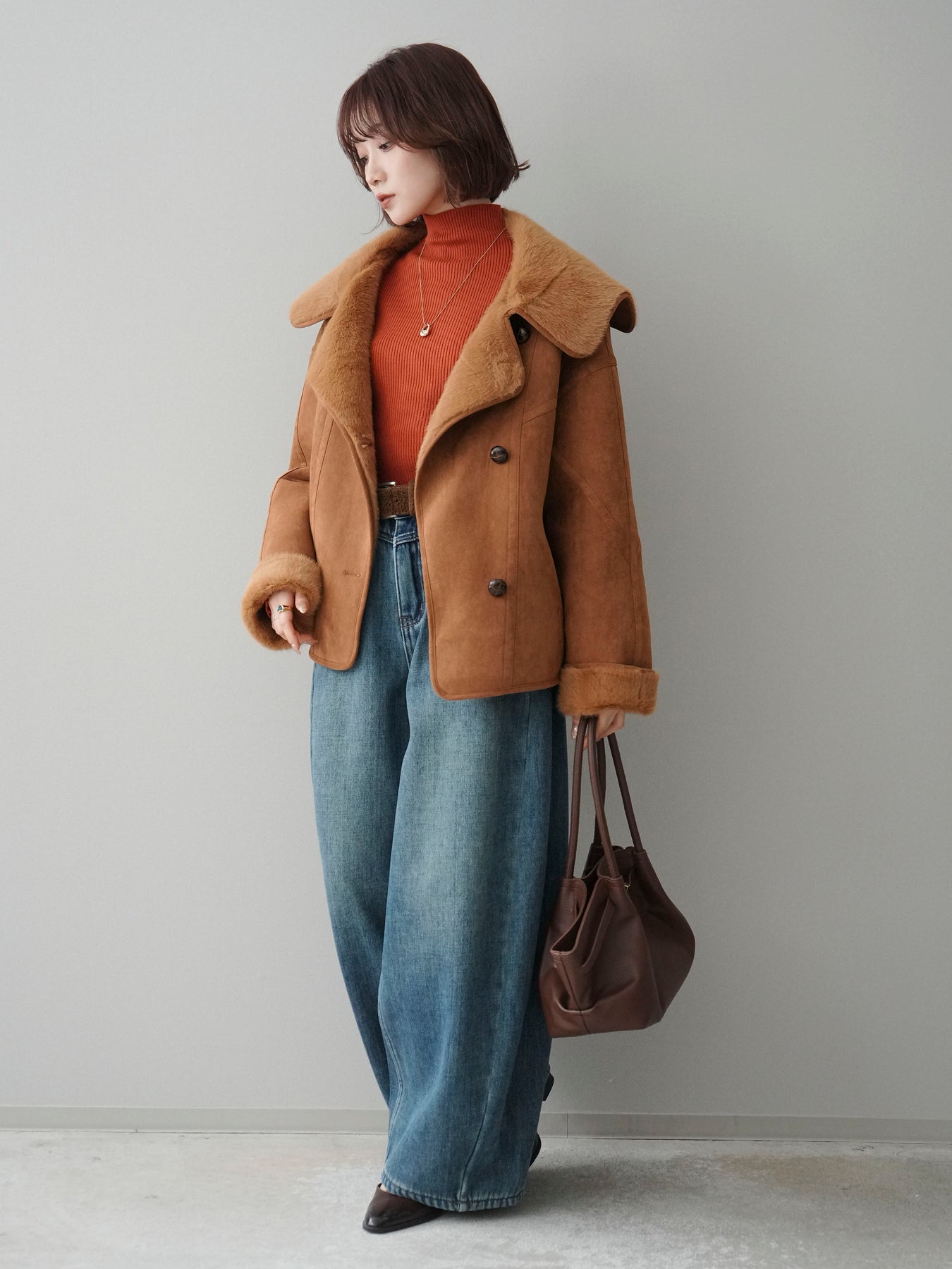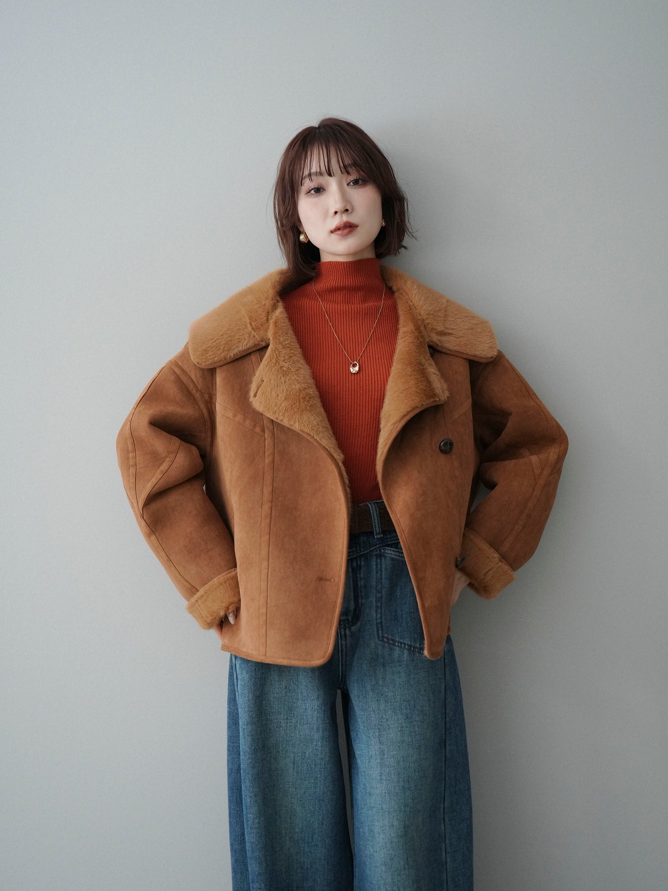 [SET]ムートンショートジャケット+袖ボタンボトルネックリブニットトップス+ベルト付裏起毛カーブデニムパンツ(3set)