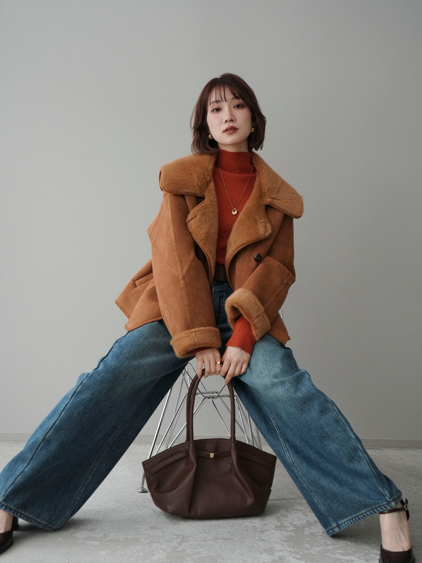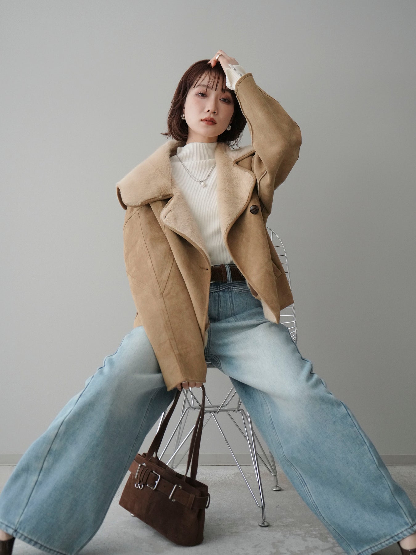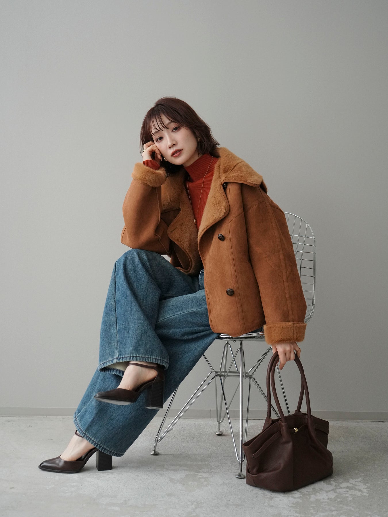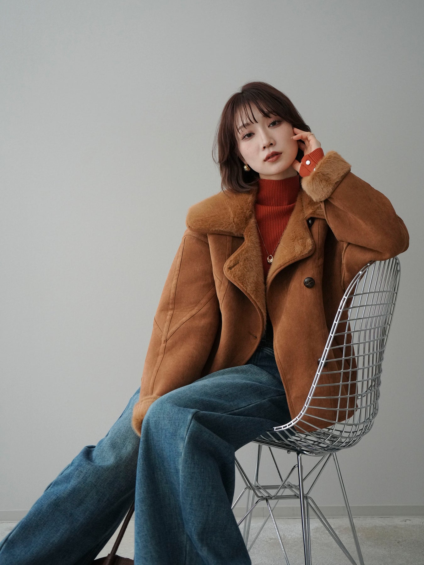 [SET]ムートンショートジャケット+袖ボタンボトルネックリブニットトップス+ベルト付裏起毛カーブデニムパンツ(3set)