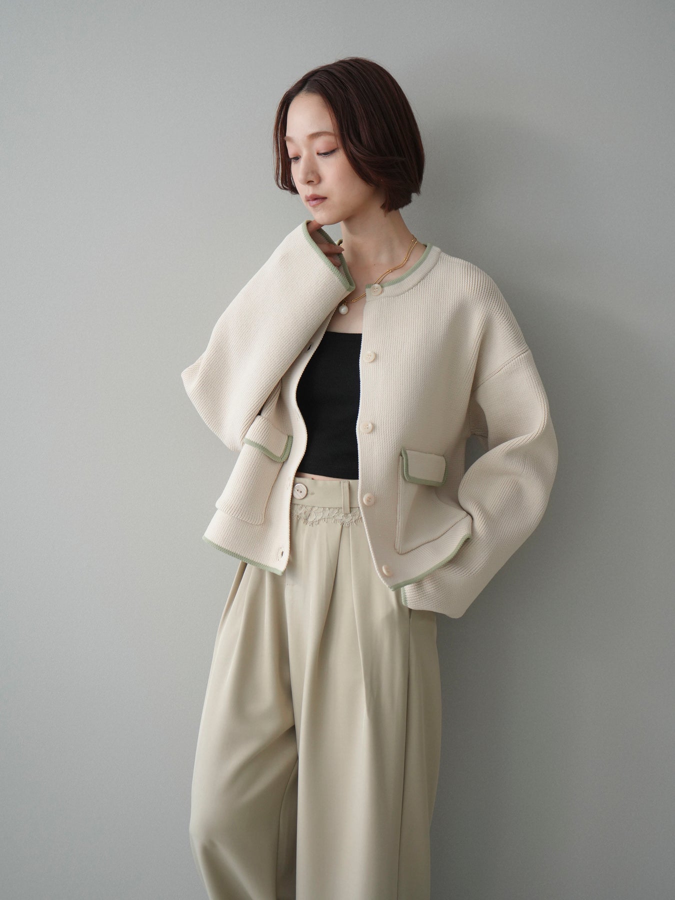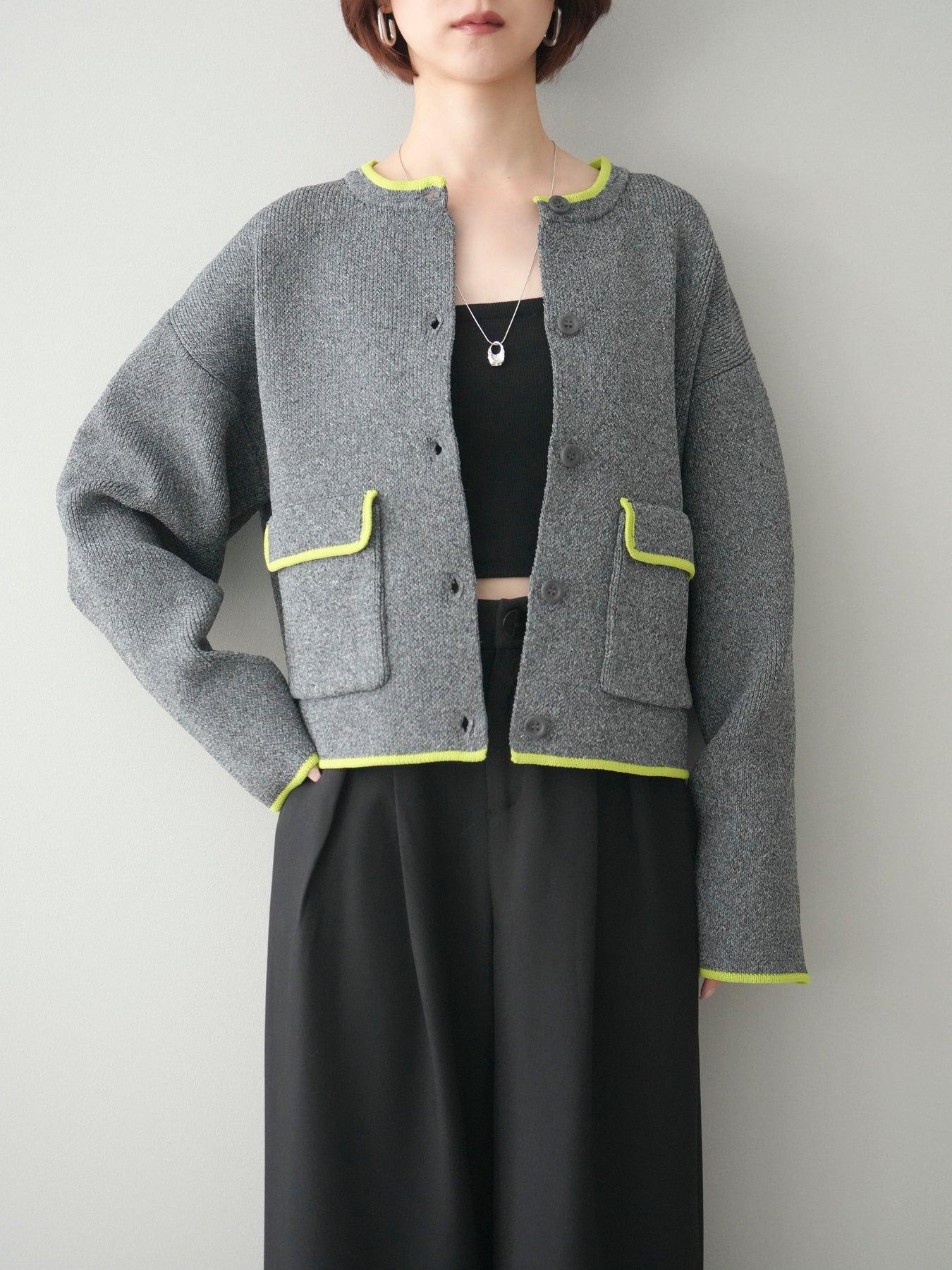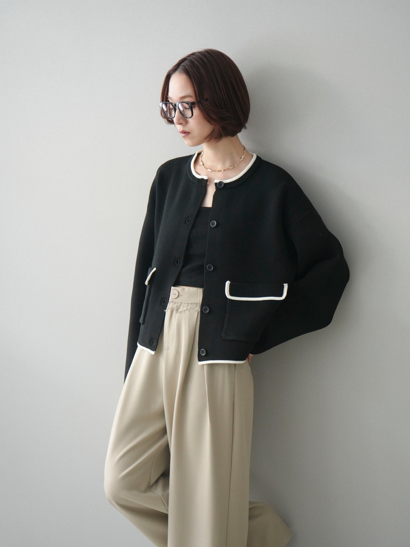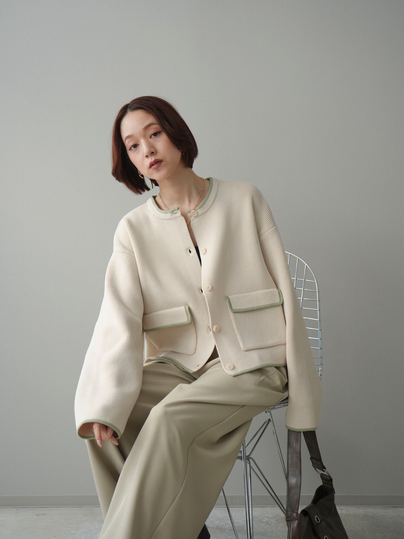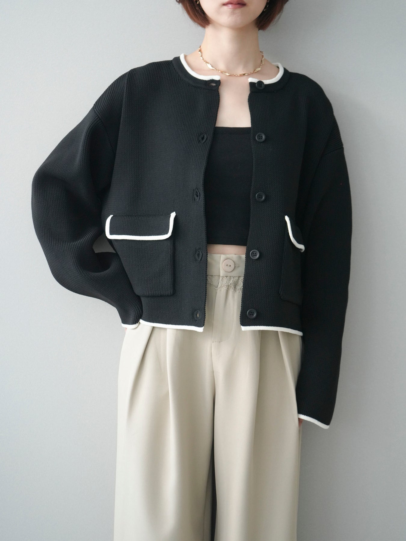 配色デザインをレイヤード風に取り入れたニットカーディガン。シンプルなシルエットに、襟元や裾、袖口から覗く配色がさりげないアクセントとなり、1枚で奥行きのあるスタイリングを叶えます。程よくゆとりのあるサイズ感で、前を閉じてトップスとしても、羽織りとしても着用可能。ベーシックながらも着映えするデザインで、カジュアルからきれいめまで幅広いコーディネートに取り入れやすい一着です。 ※ボトムス、キャミソール(インナー)以外の商品は一律でインナーは付属していません。