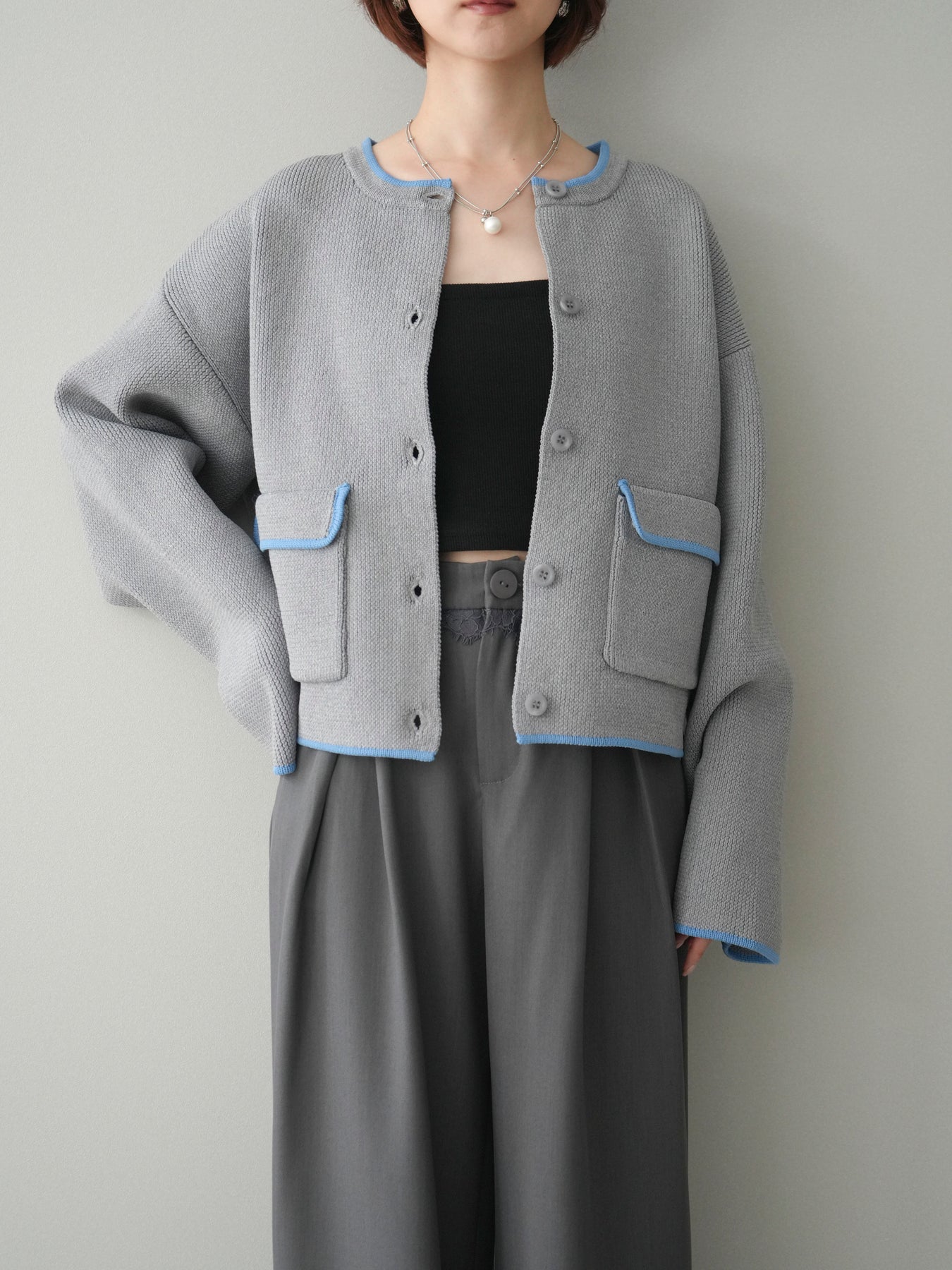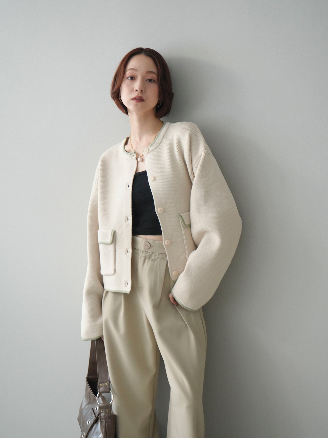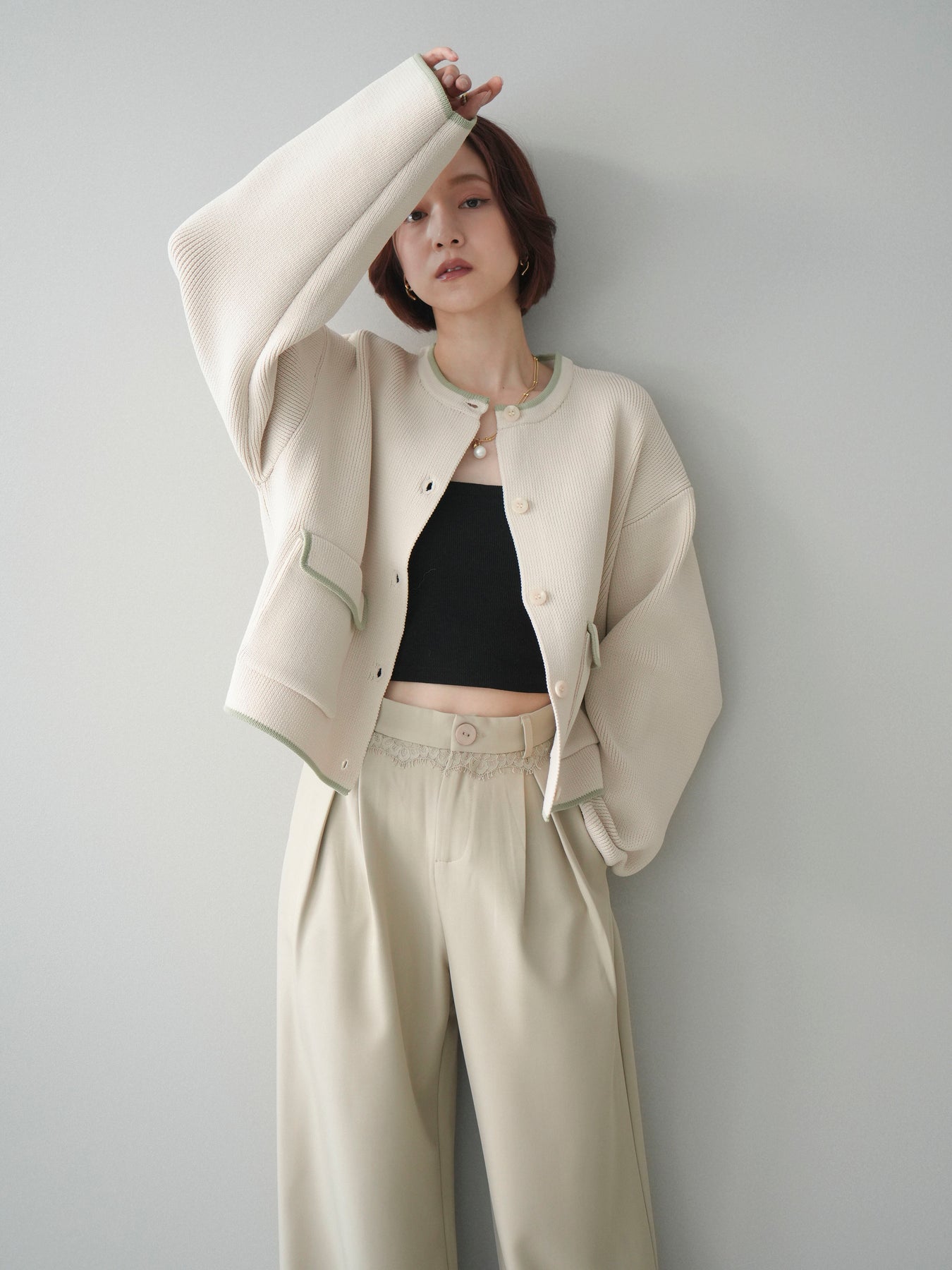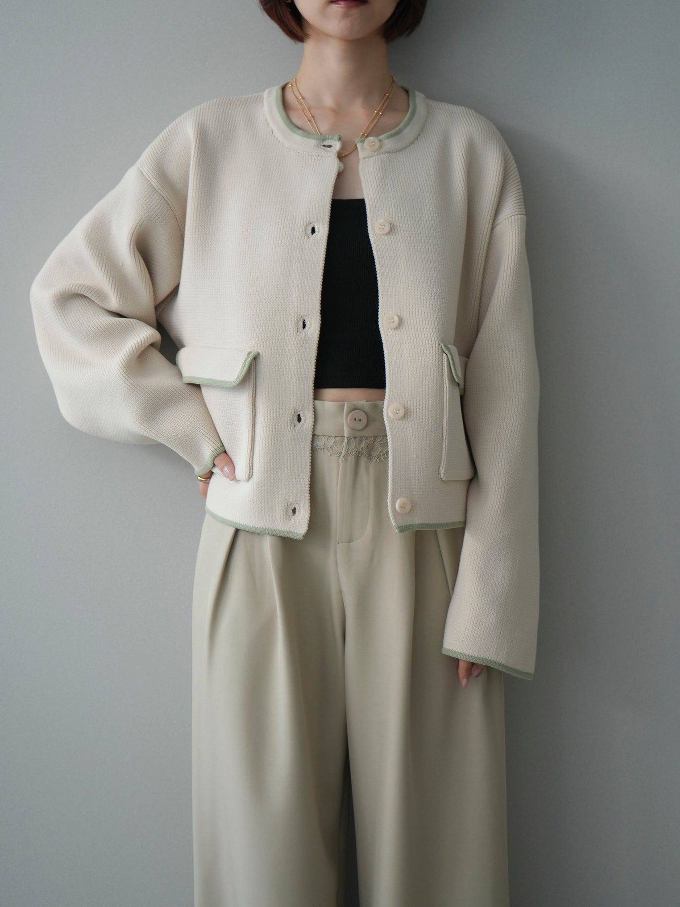 [SET]ポリエステル配色ニットカーディガン+ウエストレースタックワイドパンツ(2set)