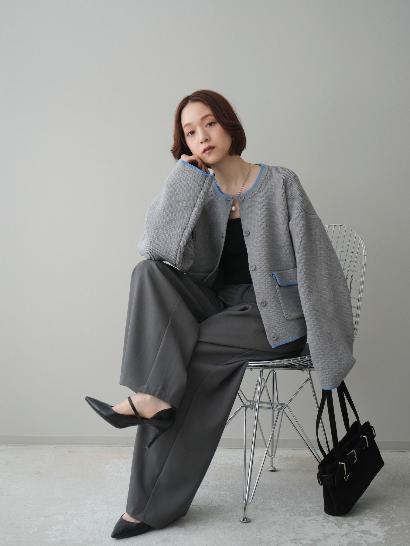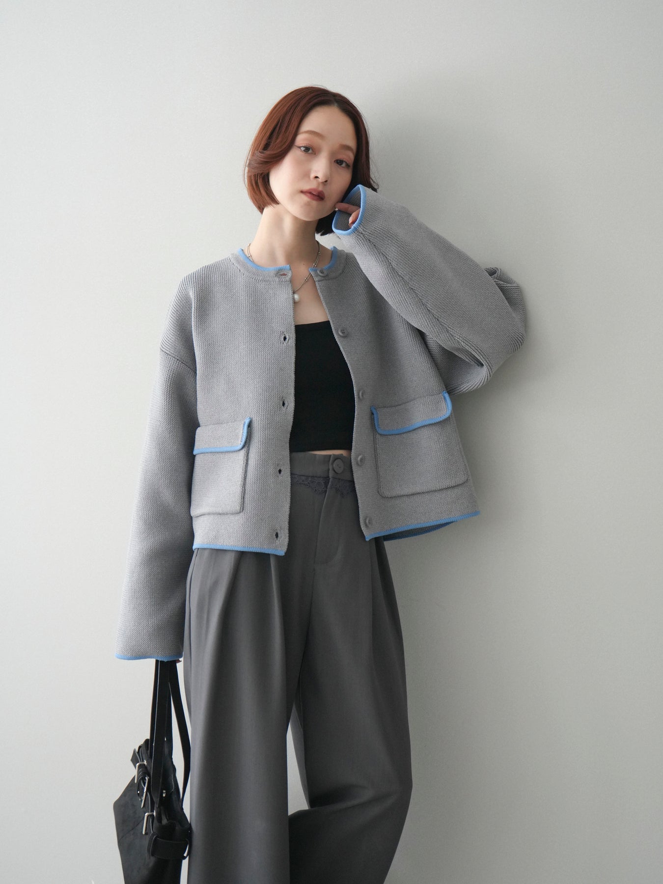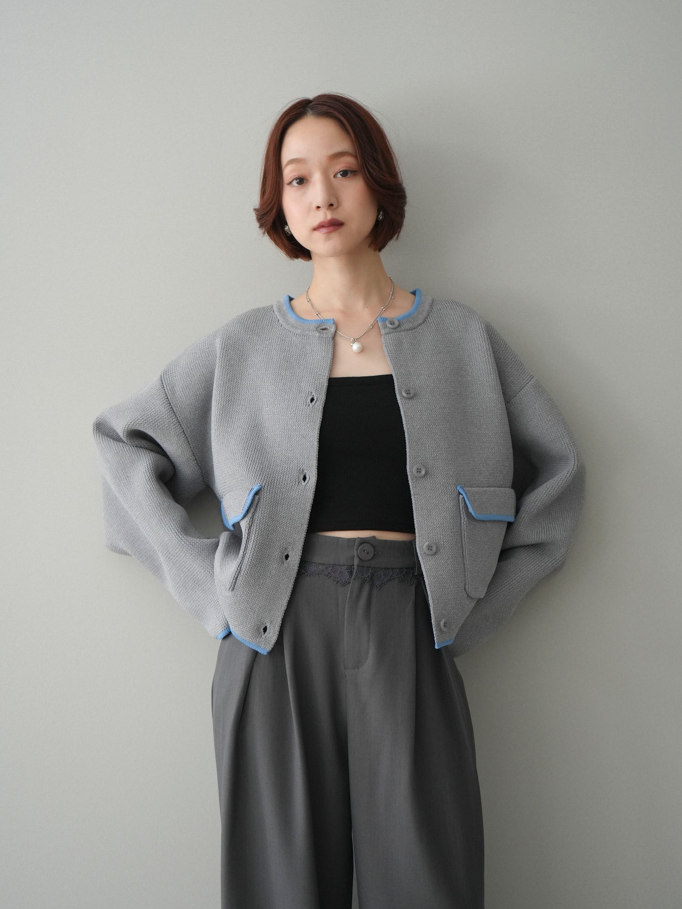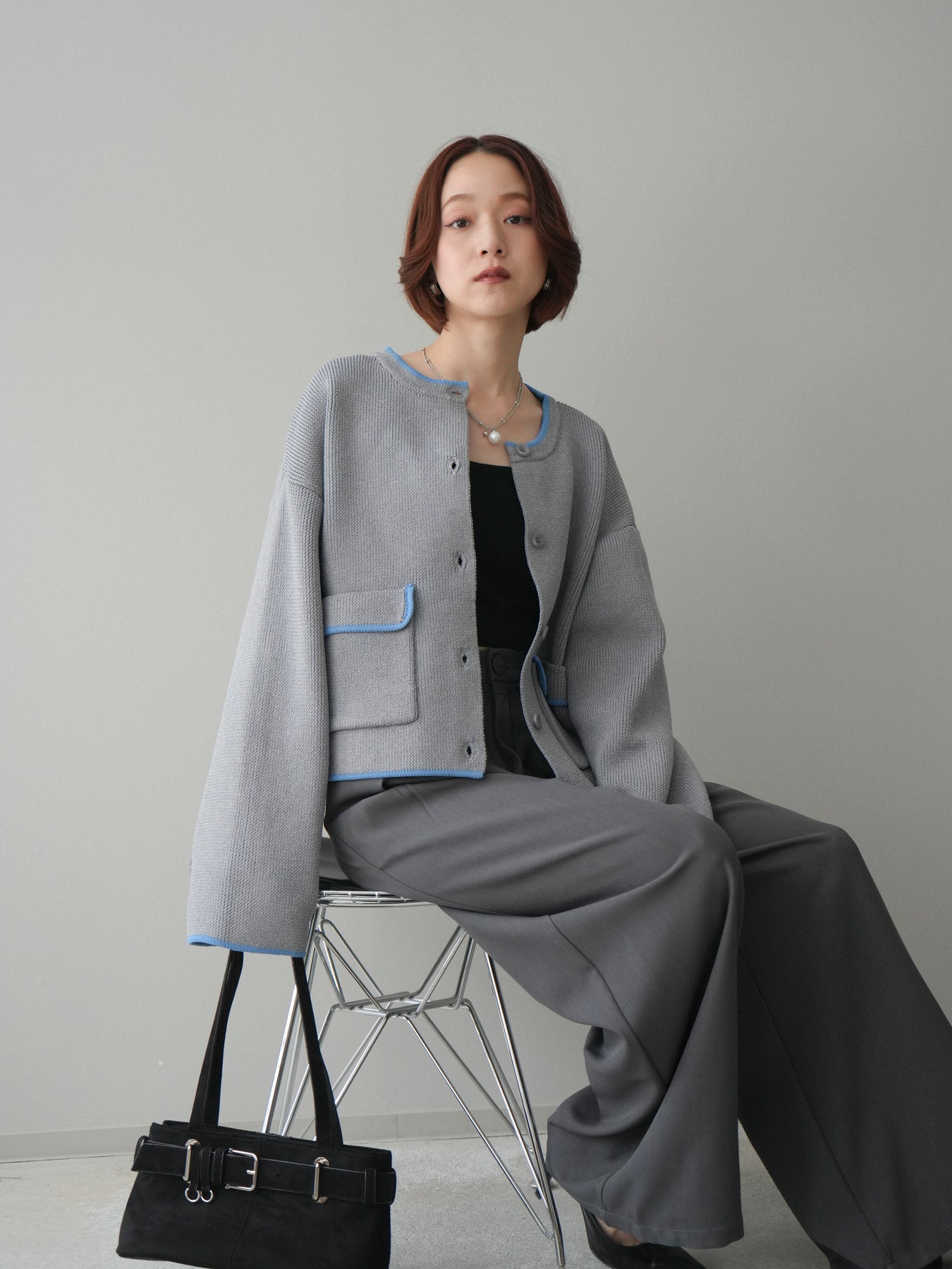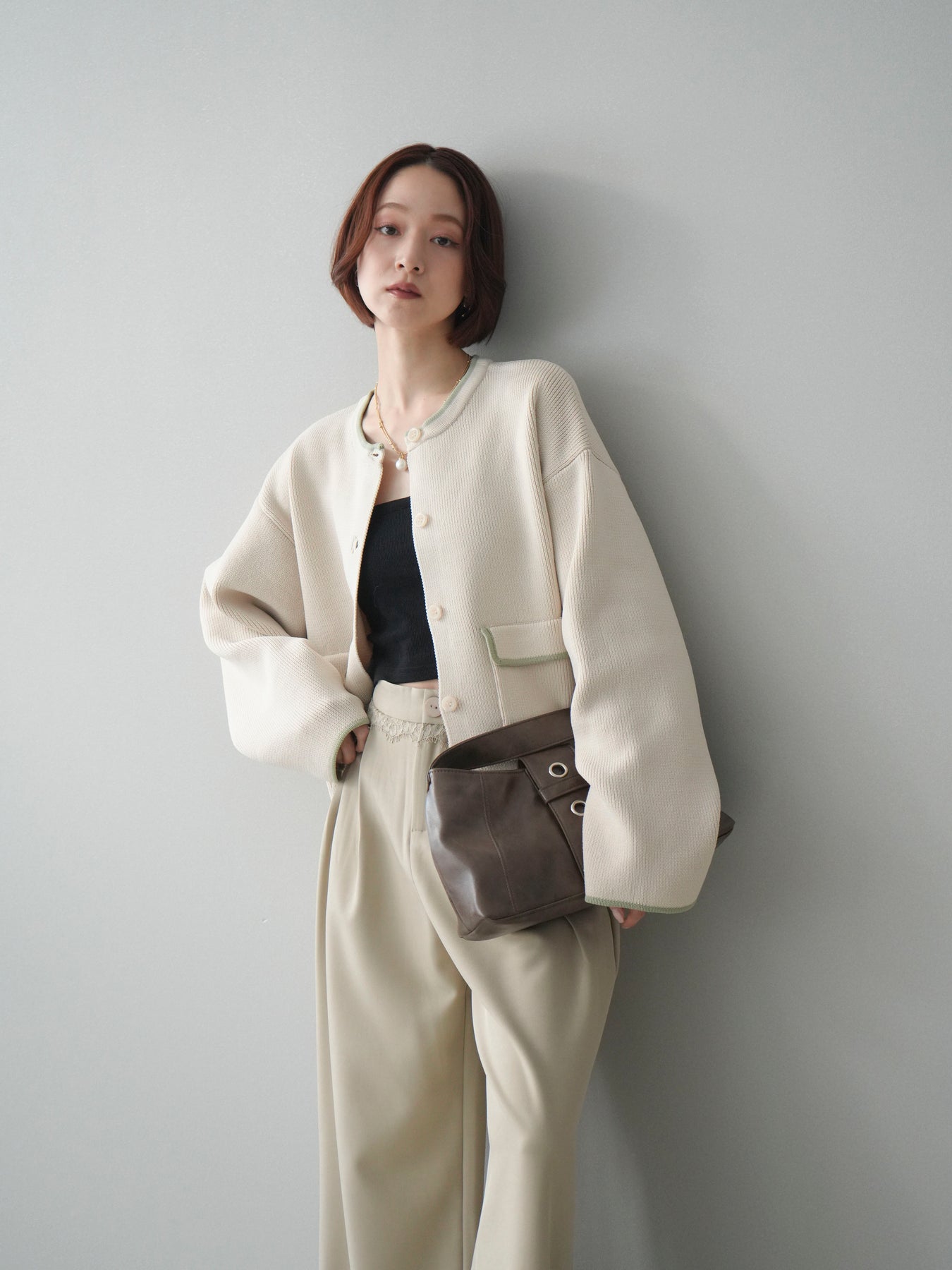 [SET]ポリエステル配色ニットカーディガン+ウエストレースタックワイドパンツ(2set)