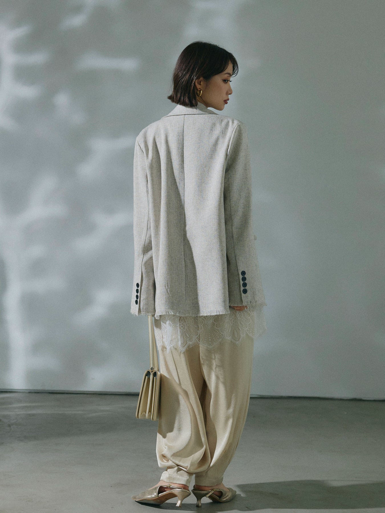 【Allure】[SET]スラブツイードフリンジテーラージャケット+裾レースポプリンシャツ+ワッシャーサテンタックジョガーパンツ(3set)