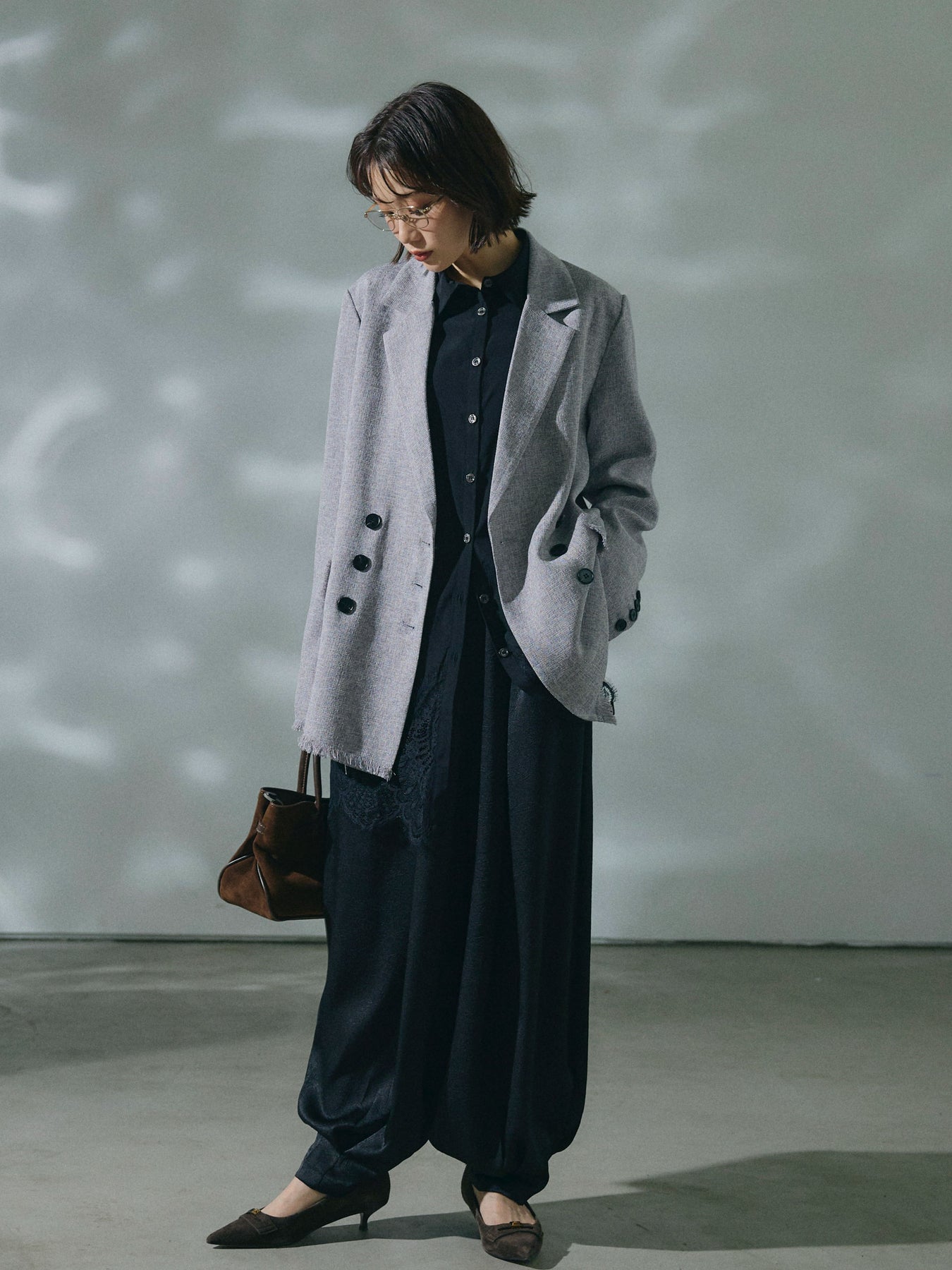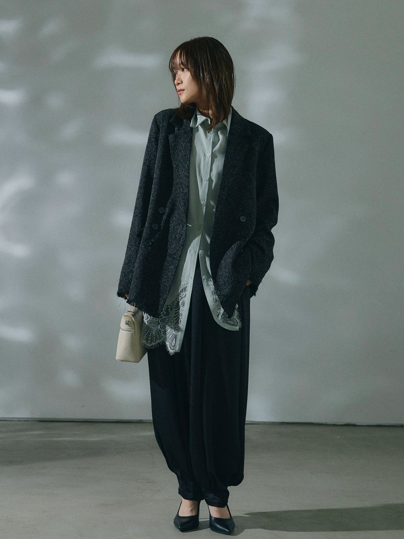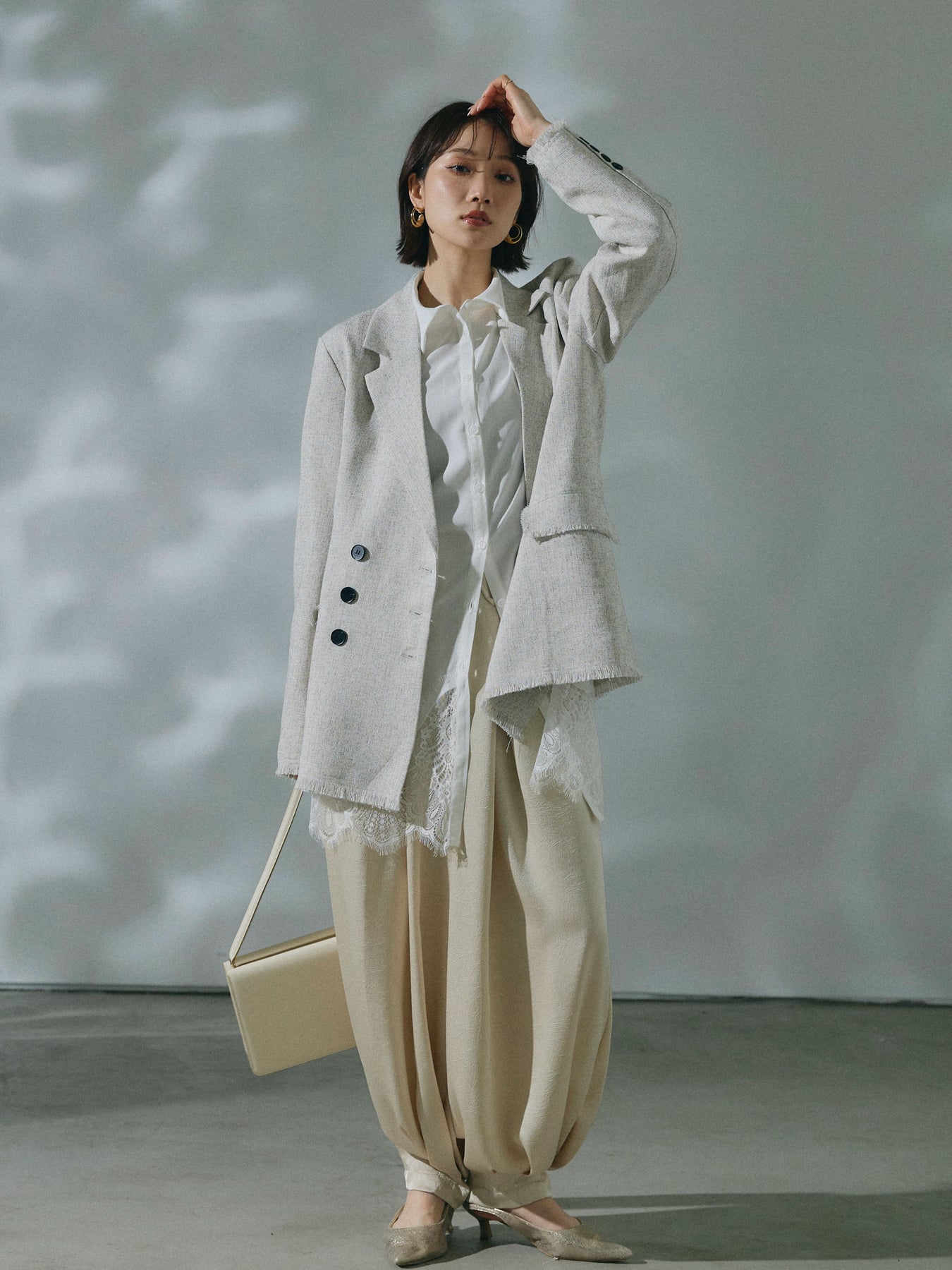 【Allure】[SET]スラブツイードフリンジテーラージャケット+ワッシャーサテンタックジョガーパンツ(2set)