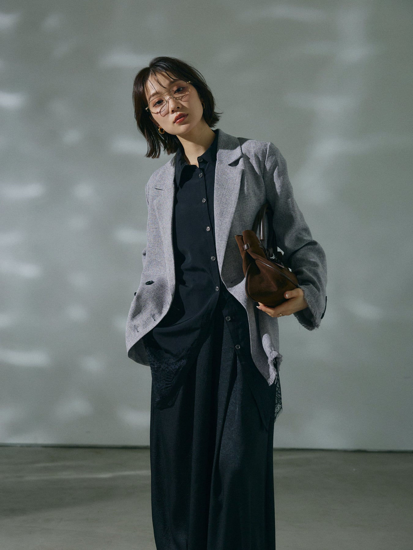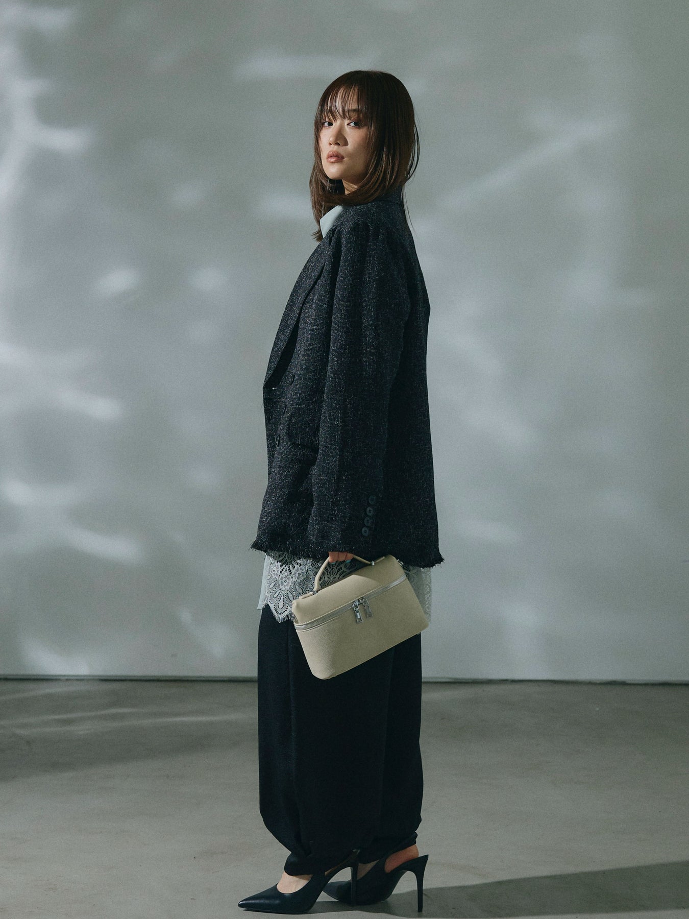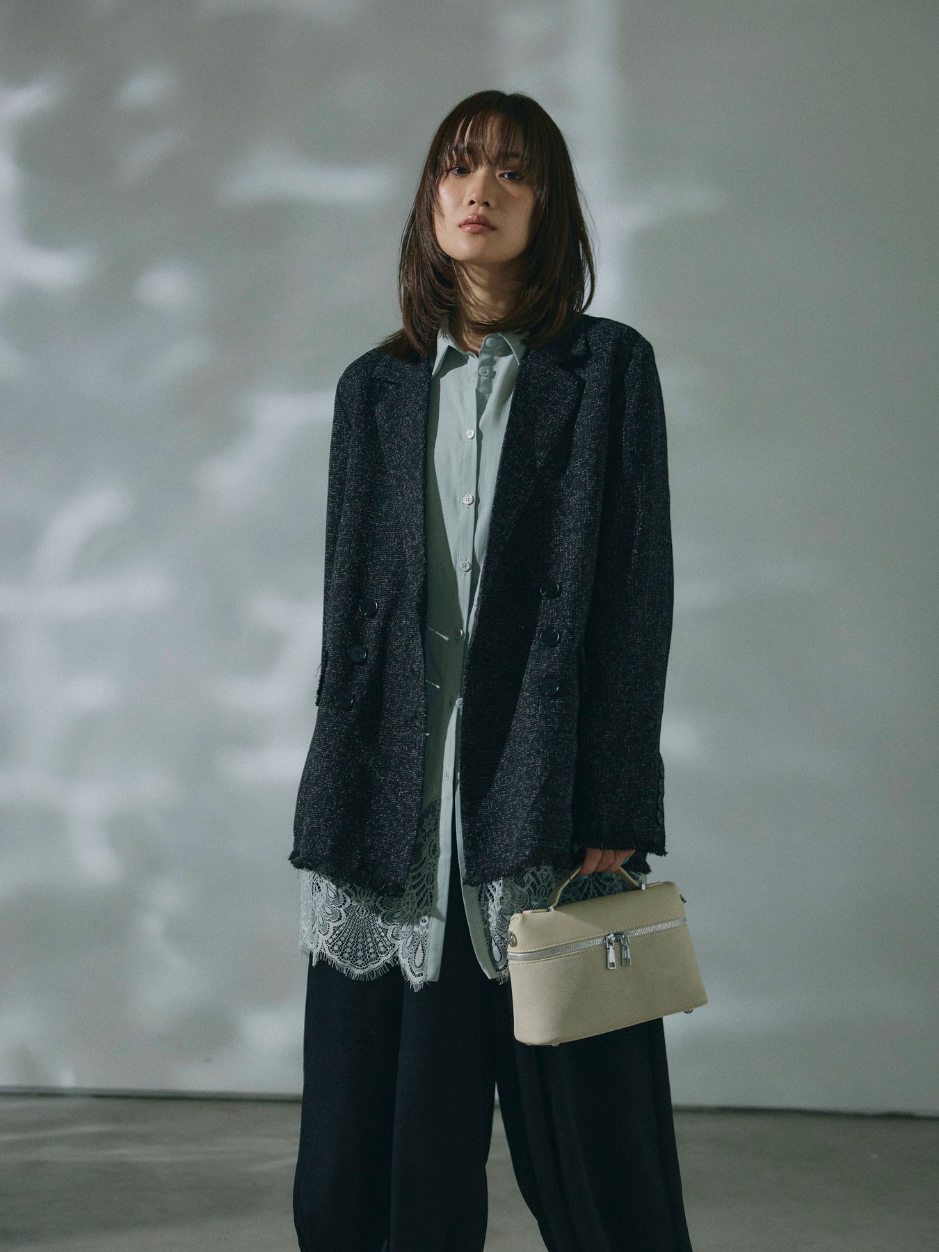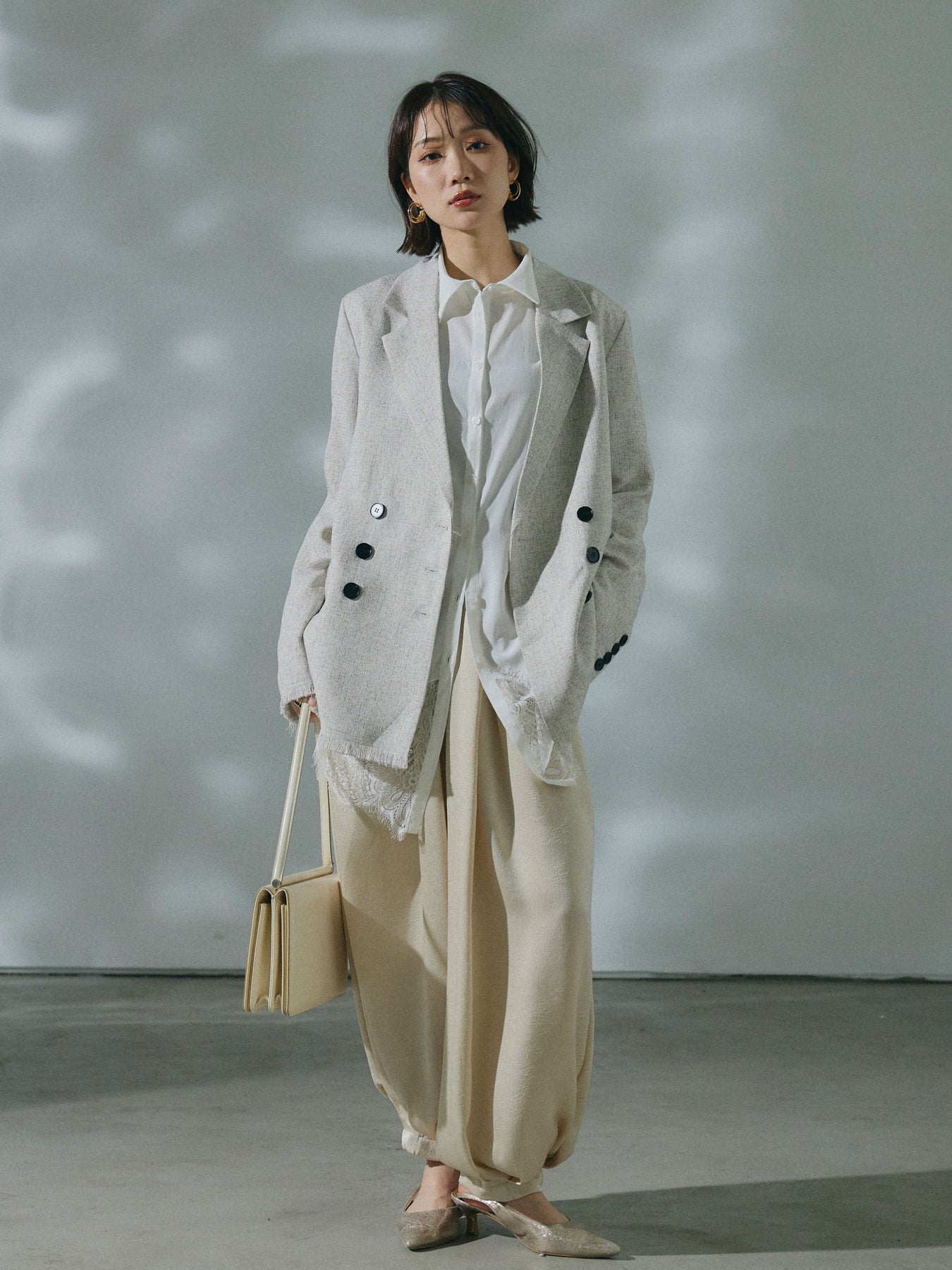 【Allure】[SET]スラブツイードフリンジテーラージャケット+ワッシャーサテンタックジョガーパンツ(2set)