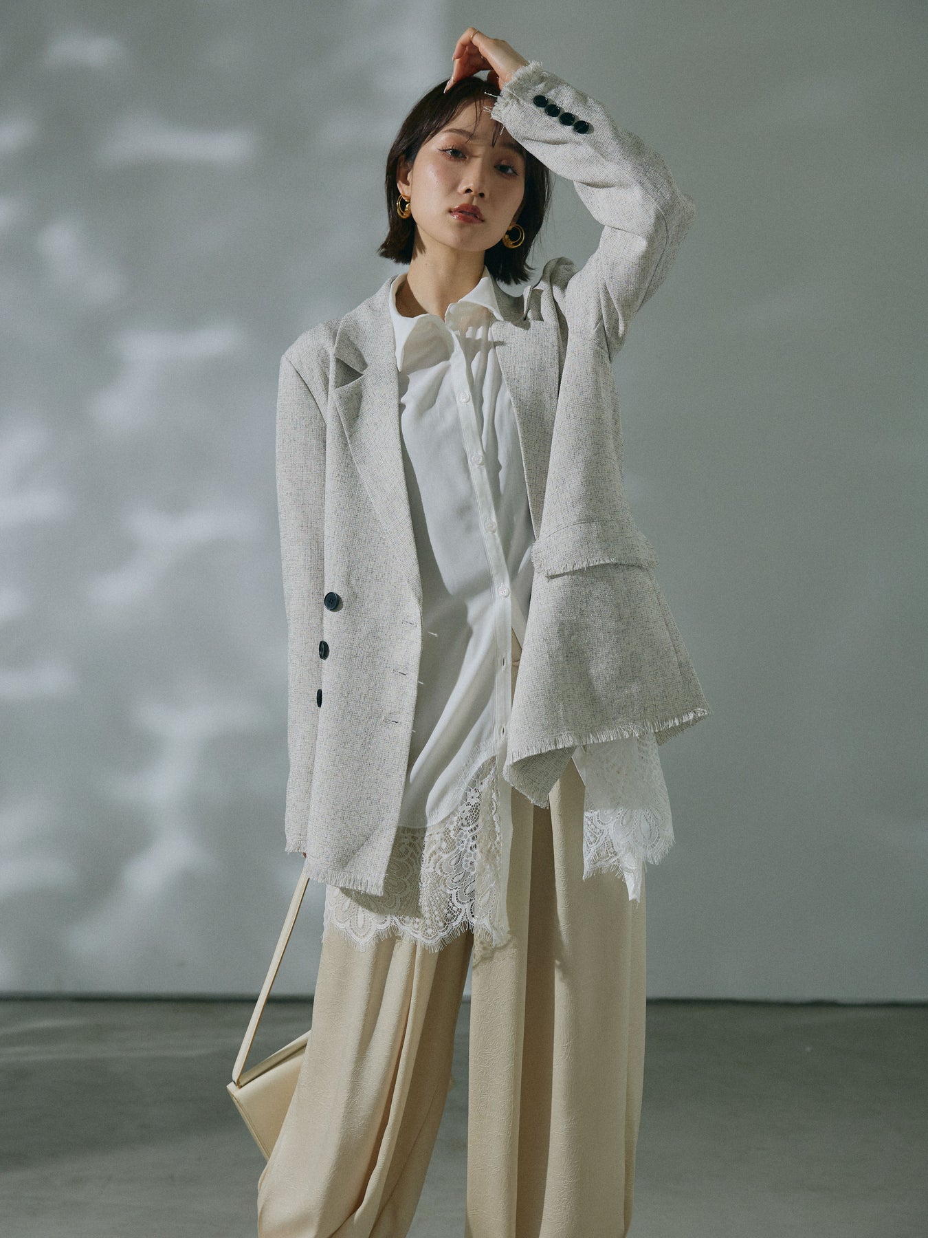 凹凸感のあるスラブツイード素材が印象的な、フリンジディテール入りテーラージャケット。程よくきちんと感のあるシルエットに、裾や袖口のフリンジが抜け感をプラスし、羽織るだけでこなれたスタイリングが完成します。デニムなどのカジュアルアイテムからきれいめボトムスまで合わせやすく、オンオフ問わず活躍する一着です。