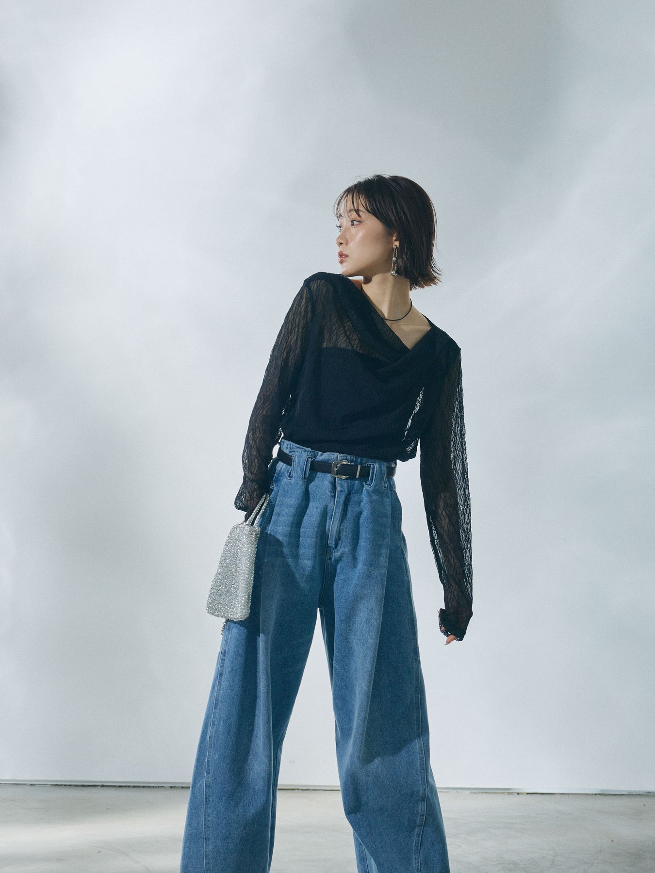 【Allure】[SET]ストレッチレースドレープトップス+ハイウエストベルトループデザインデニムパンツ(2set)
