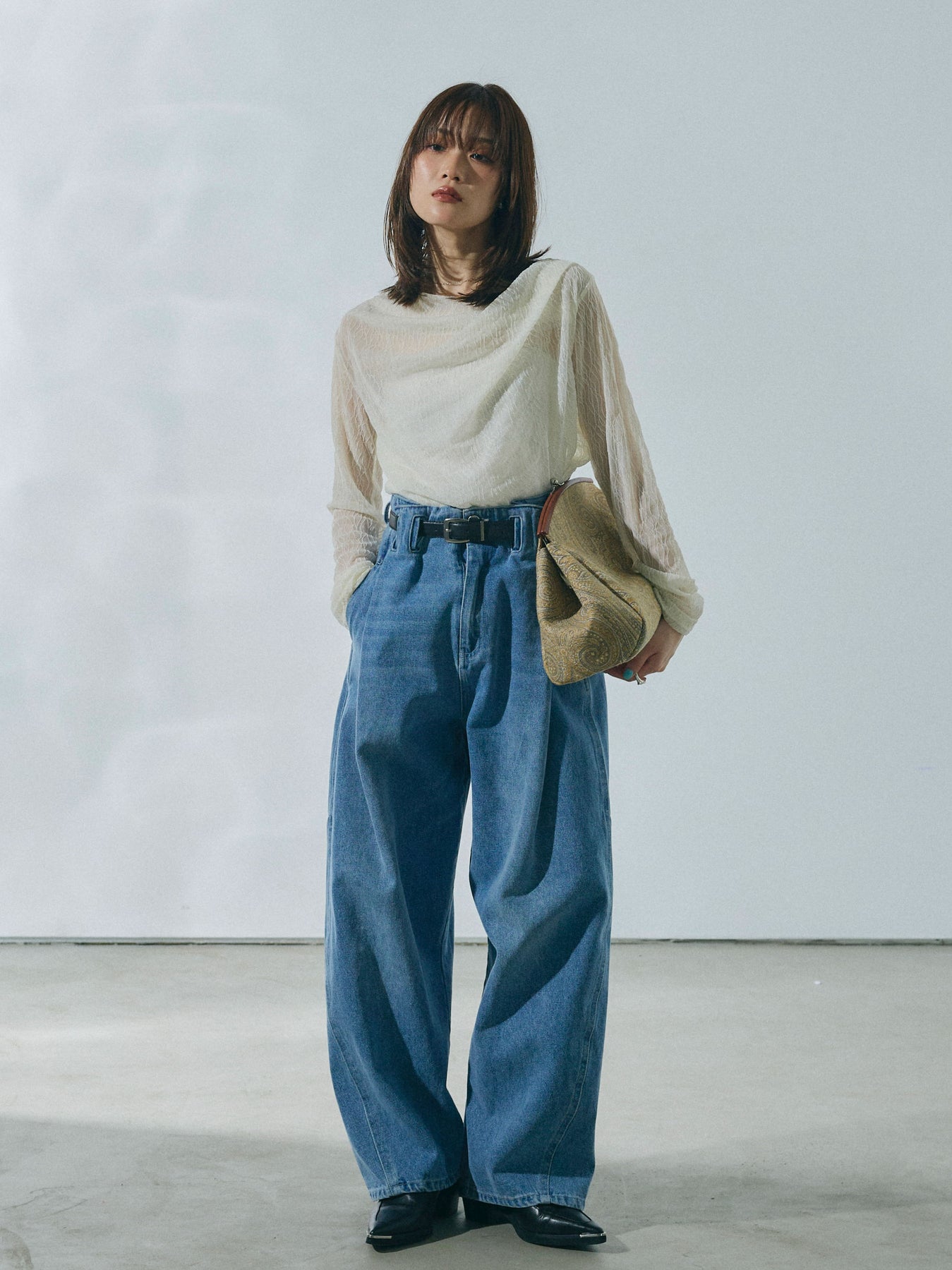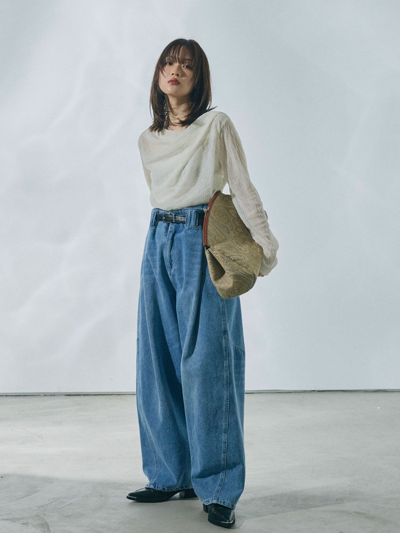 程よく存在感のあるシルエットが魅力の、ハイウエストデザインデニムパンツ。 腰位置を高く見せる設計に加え、タック感のあるラインが自然な立体感を生み出し、穿くだけで全体のバランスが整う一本です。ウエストまわりはすっきりとしつつ、脚のラインを拾いすぎないシルエットで、日常使いしやすい仕上がりになっています。 特徴的なベルトループデザインがさりげないアクセントとなり、トップスをインしたスタイリングでも表情のある印象に。シンプルなニットやシャツはもちろん、コンパクトなトップスからボリューム感のあるアイテムまで幅広く合わせやすく、着こなしの幅を広げてくれます。 シーズンを問わず取り入れやすく、ワードローブの定番として活躍するデニムパンツ。予約アイテムとして押さえておきたい、汎用性の高い一本です。 ※ウォッシュ加工によりファスナー部分に黒ずみがございますがデザインの仕様となります。 ※ボトムス、キャミソール(インナー)以外の商品は一律でインナーは付属していません。
