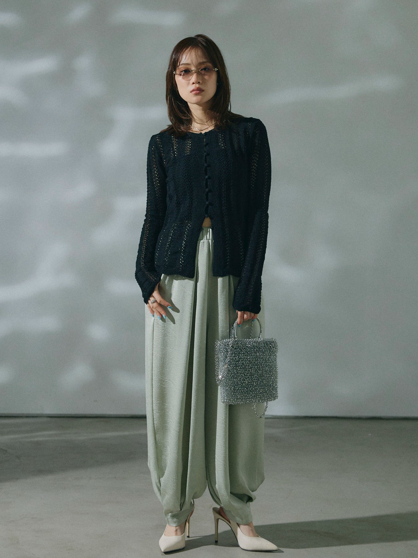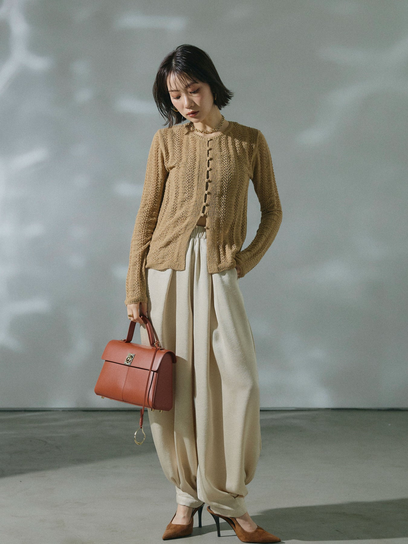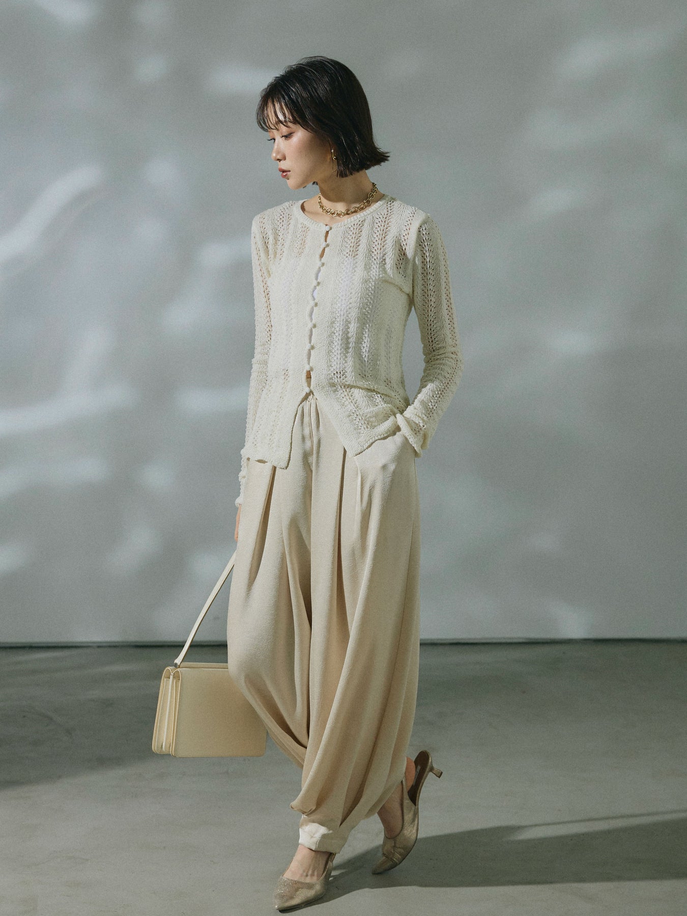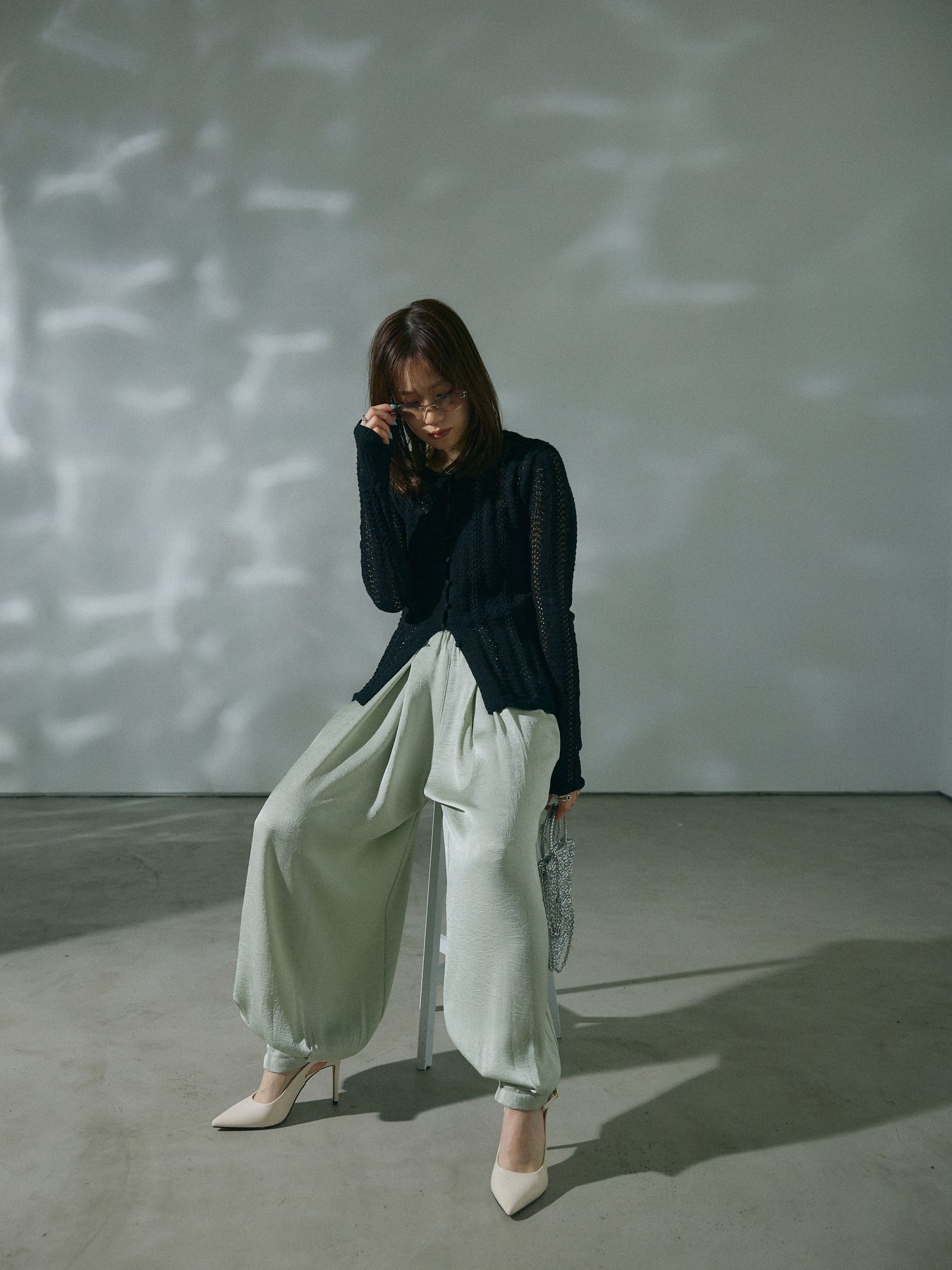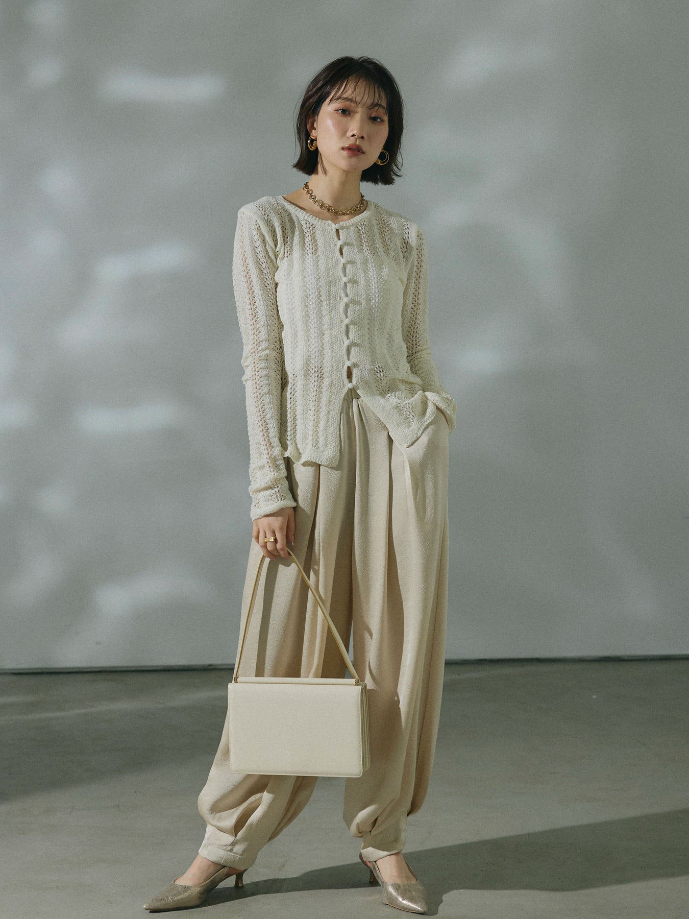 【Allure】[SET]透かし編みニットカーディガントップス+ワッシャーサテンタックジョガーパンツ(2set)