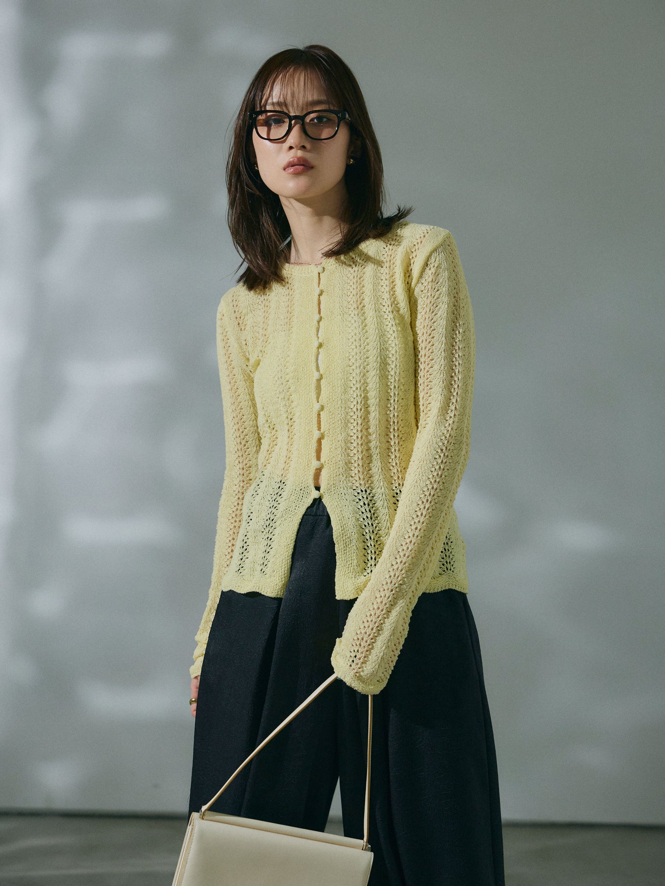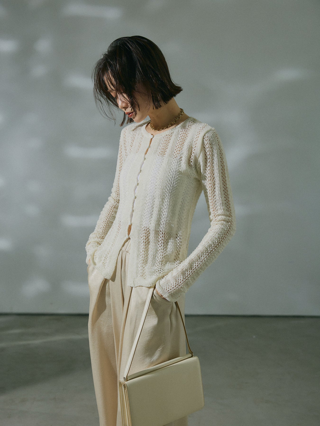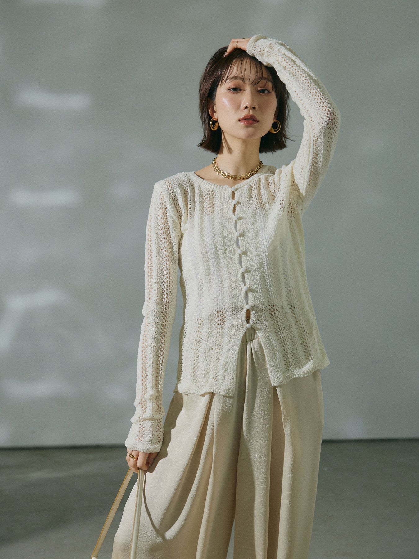 透かし編みデザインが軽やかな印象を与えるニットカーディガントップス。程よい透け感がスタイリングに抜けをプラスし、羽織りとしてもトップスとしても活躍します。レイヤードしやすいシルエットで、季節の変わり目にも取り入れやすい一着です。