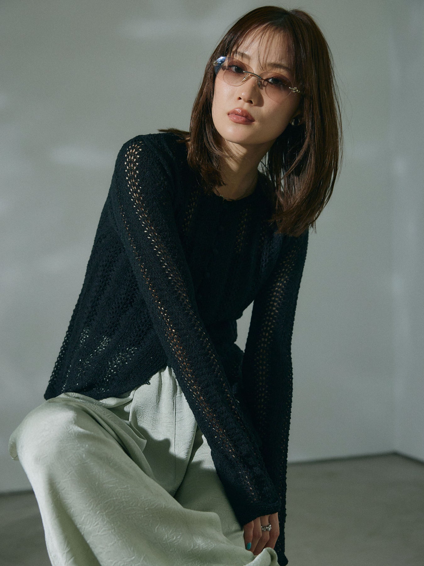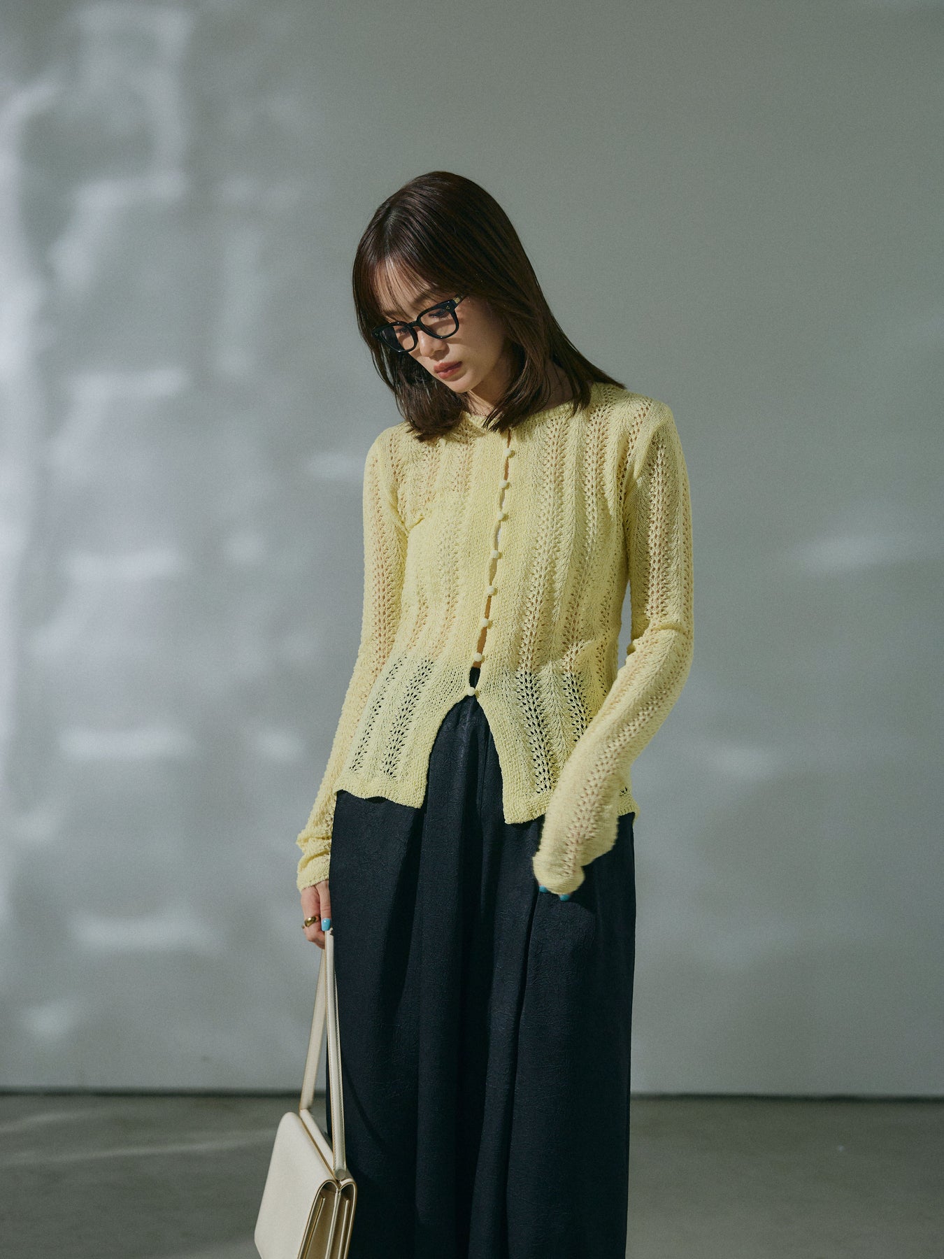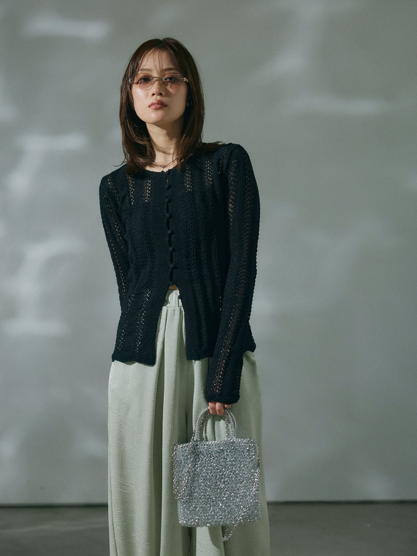 透かし編みデザインが軽やかな印象を与えるニットカーディガントップス。程よい透け感がスタイリングに抜けをプラスし、羽織りとしてもトップスとしても活躍します。レイヤードしやすいシルエットで、季節の変わり目にも取り入れやすい一着です。