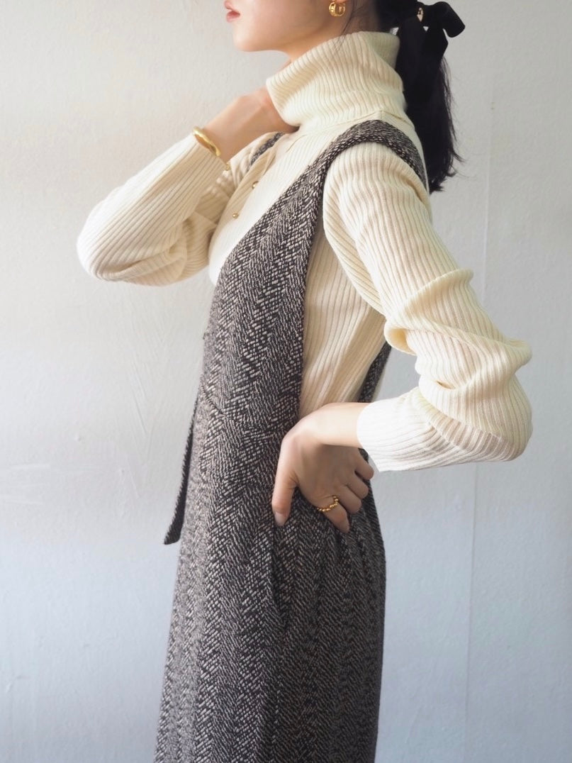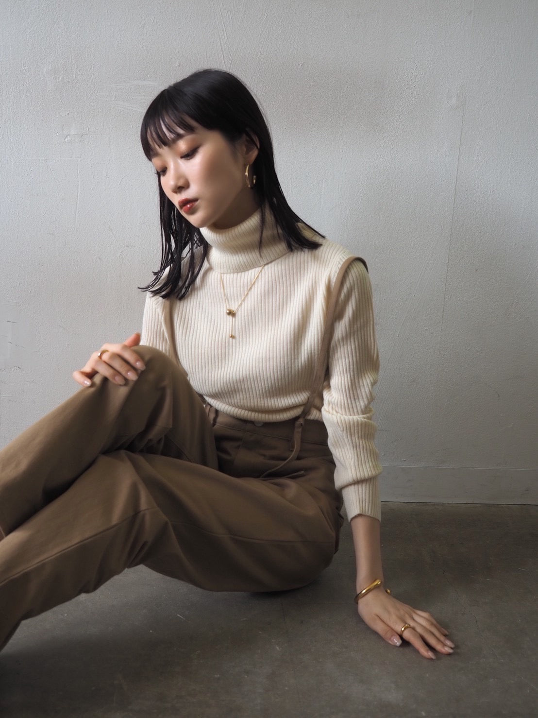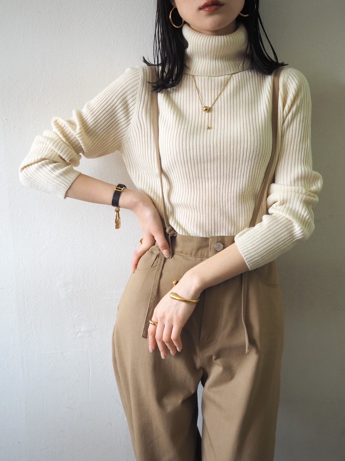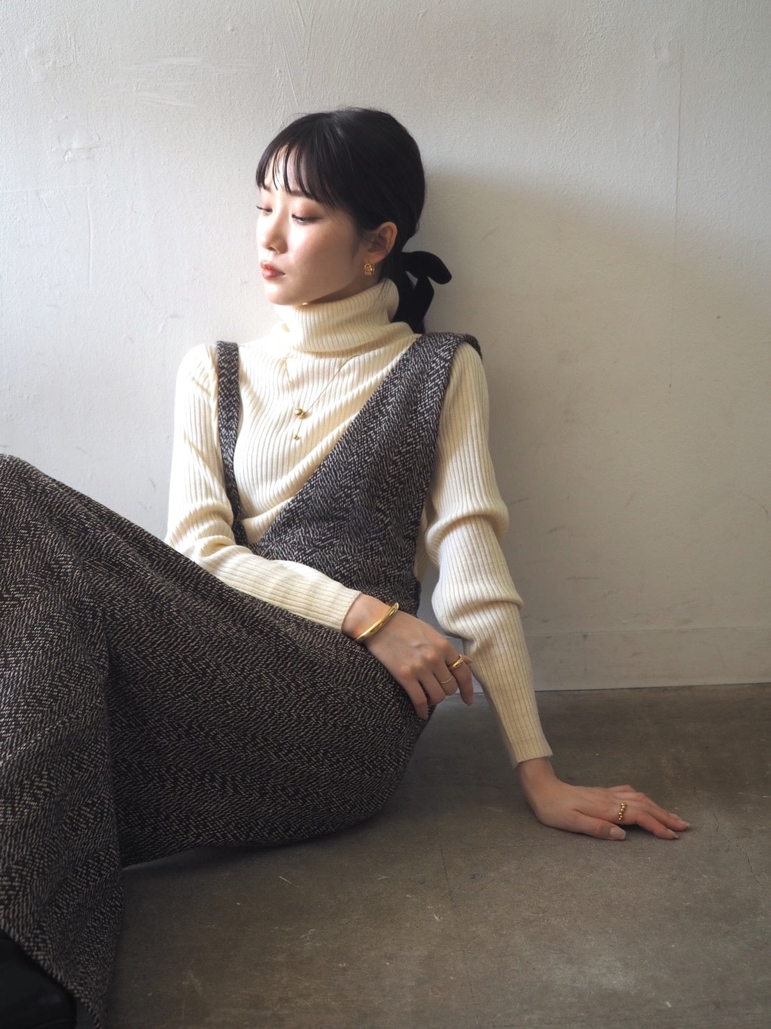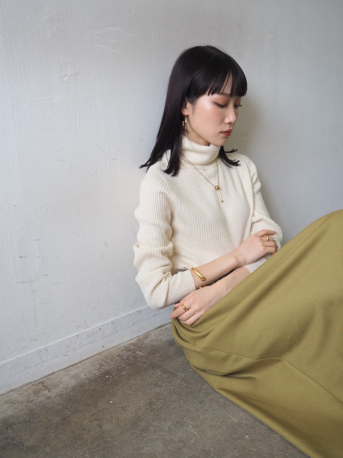 秋冬のスタイリングに欠かせないリブタートルネックニットは、スタンダードなデザインで着回し力に優れた一着です。ネック部分は折り返しを大きくしたボリュームが出る仕様で、クシュクシュと弛ませるなど、印象変えができます。そのままではもちろん、ベストやカーディガン、ジャンスカのインナーとしても重宝し、シーンレスに取り入れていただけます。