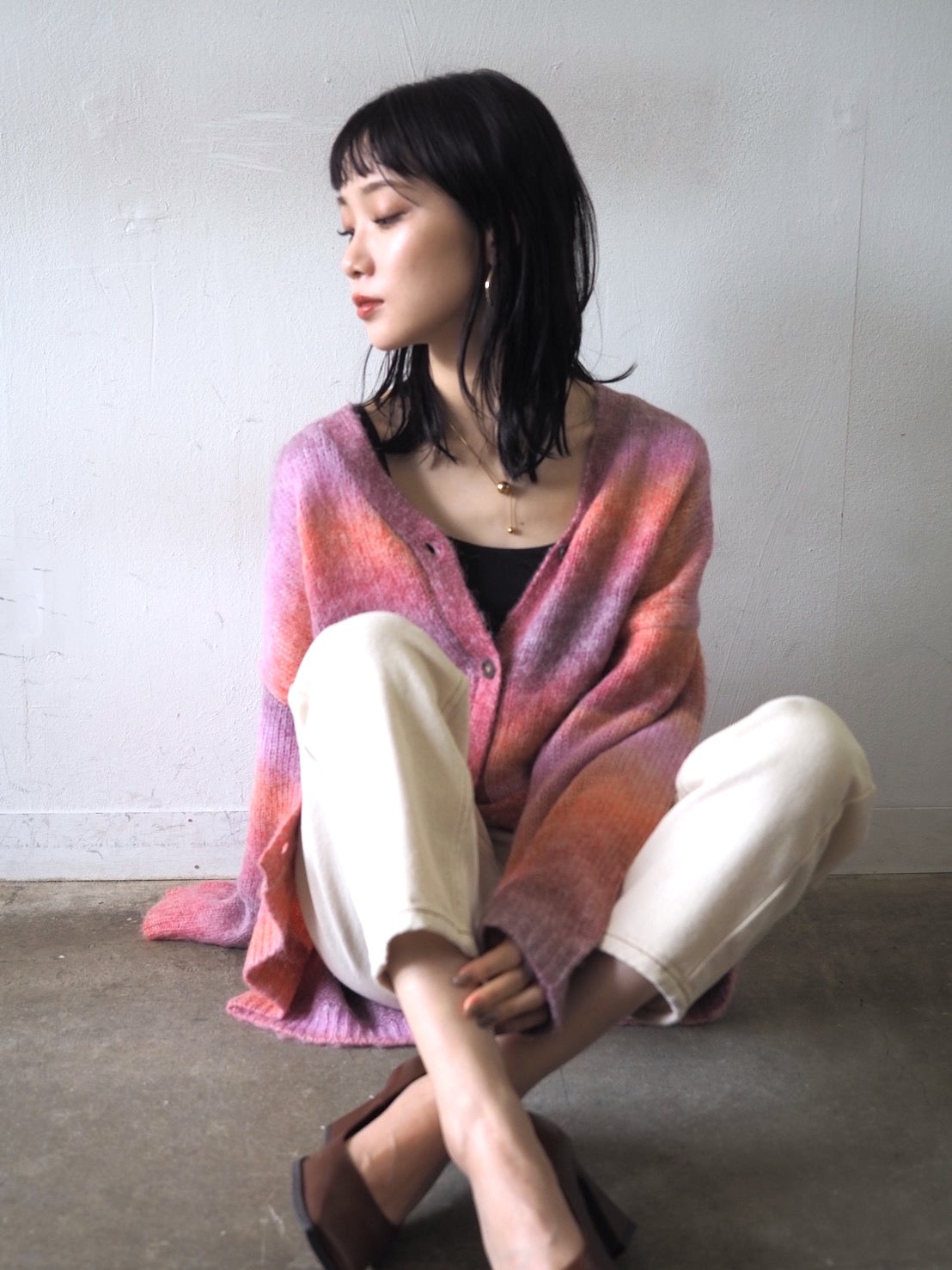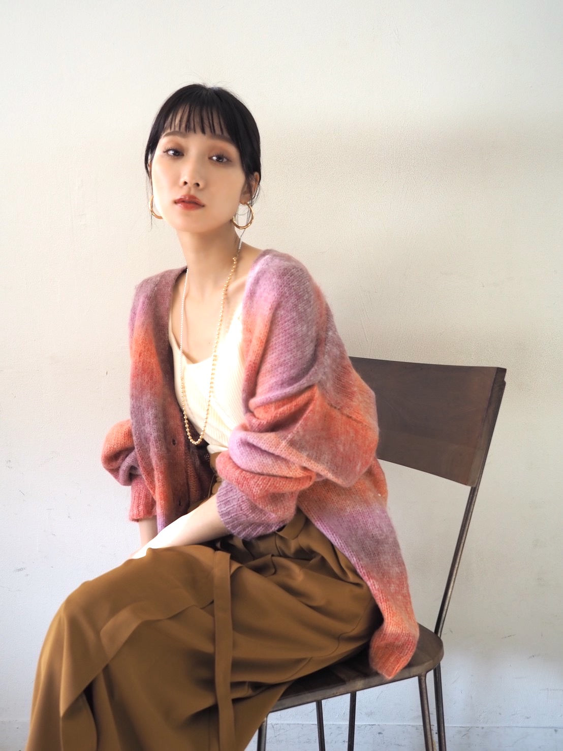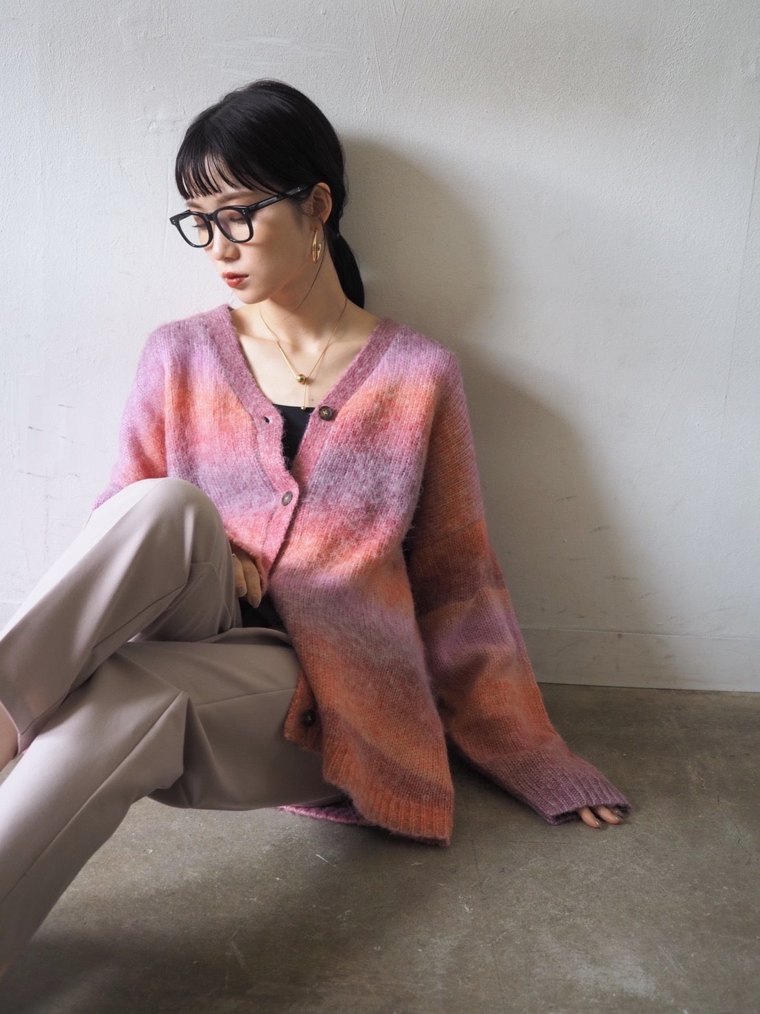 グラデーションカラーが目を惹くニットカーディガンは、あたたかく肌触りが良いシャギー素材です。オーバーサイズながらもドロップショルダーですっきり見え、軽く着崩すことでこなれ感も出ます。開き過ぎないVネックなのでプルオーバーとしても着用しやすいのがポイント。ヒップが隠れるレングスで安心感があり、着映えするためシンプルなアイテムを合わせるだけでもおしゃれに決まります。