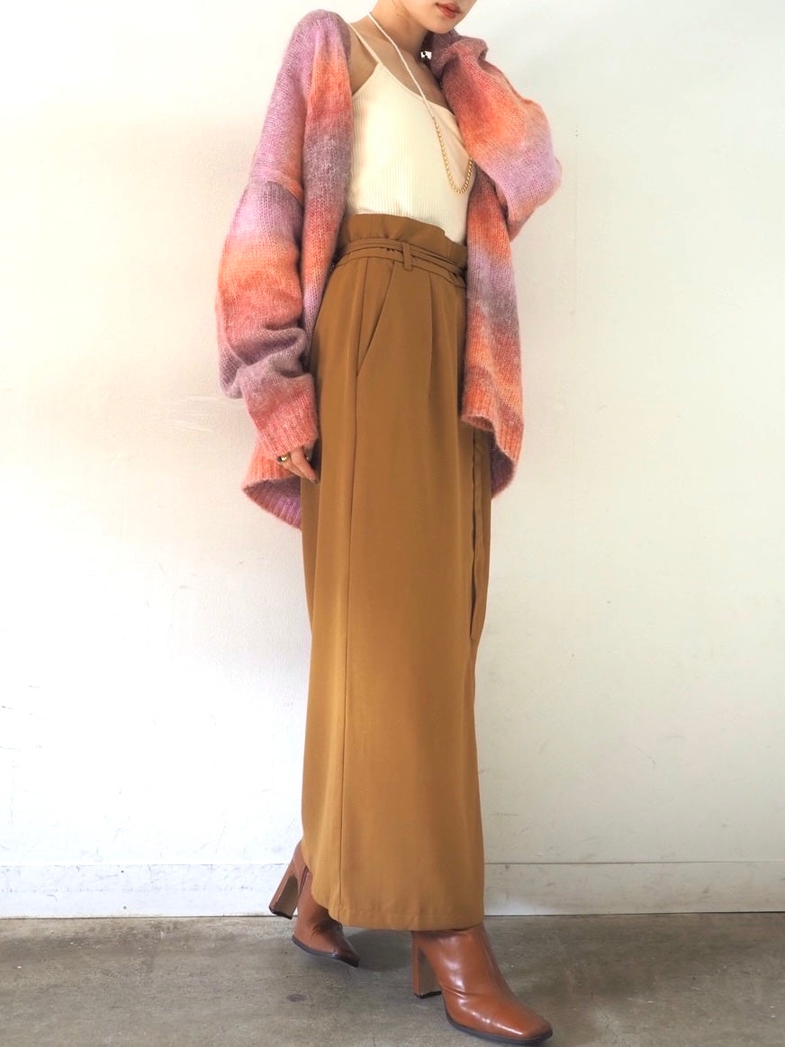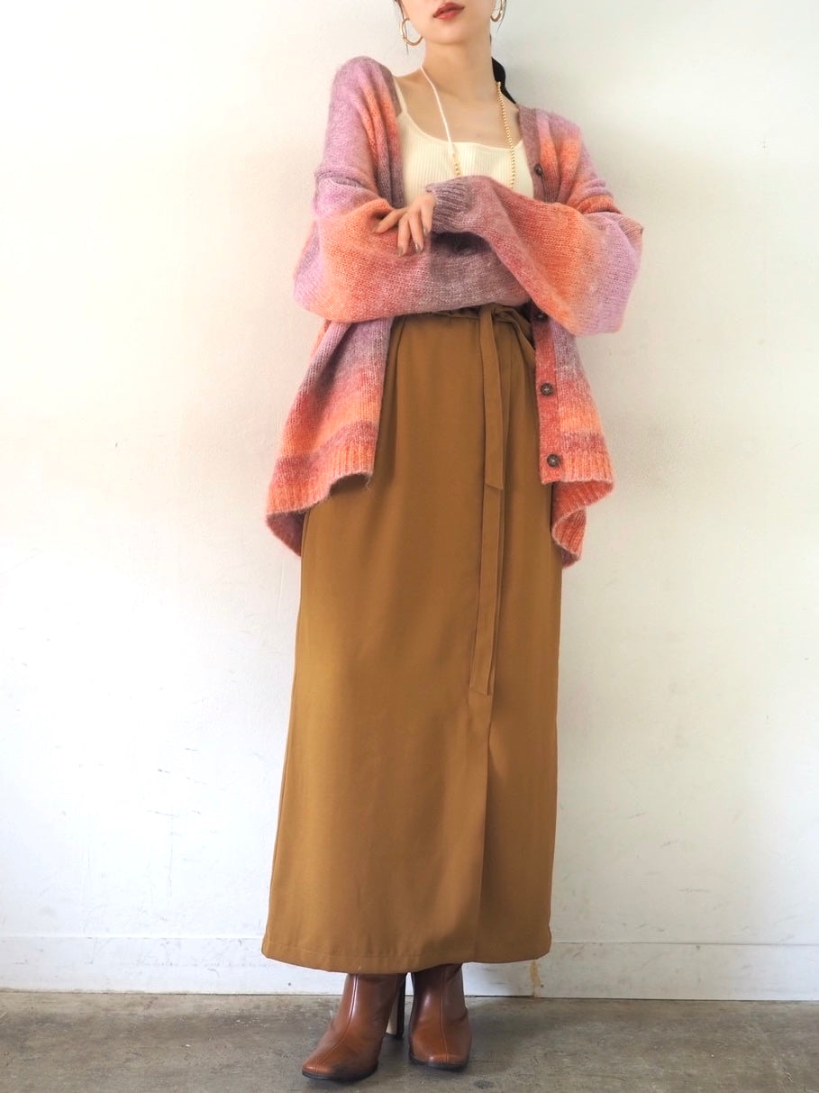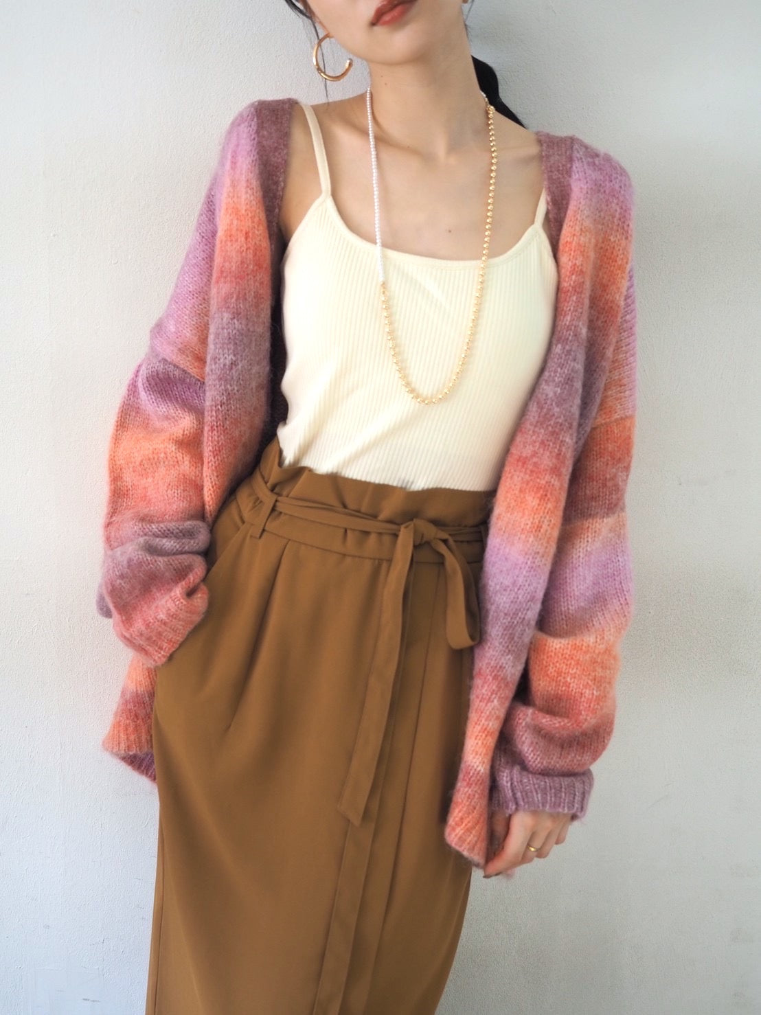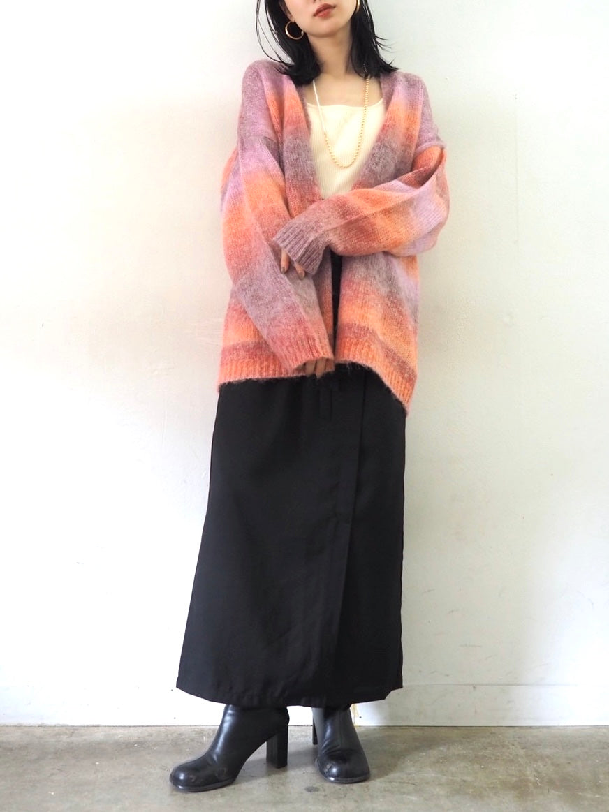 グラデーションカラーが目を惹くニットカーディガンは、あたたかく肌触りが良いシャギー素材です。オーバーサイズながらもドロップショルダーですっきり見え、軽く着崩すことでこなれ感も出ます。開き過ぎないVネックなのでプルオーバーとしても着用しやすいのがポイント。ヒップが隠れるレングスで安心感があり、着映えするためシンプルなアイテムを合わせるだけでもおしゃれに決まります。
