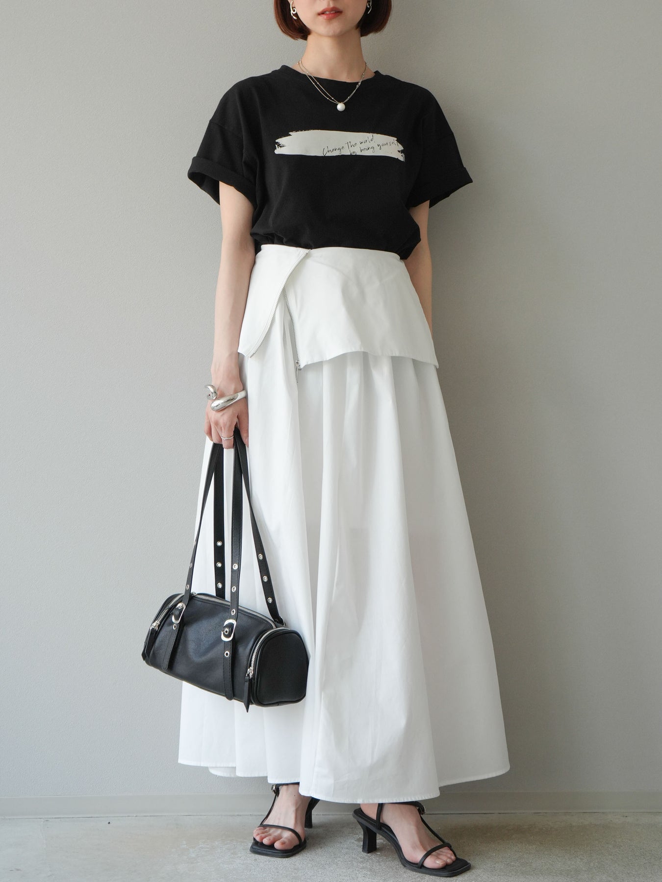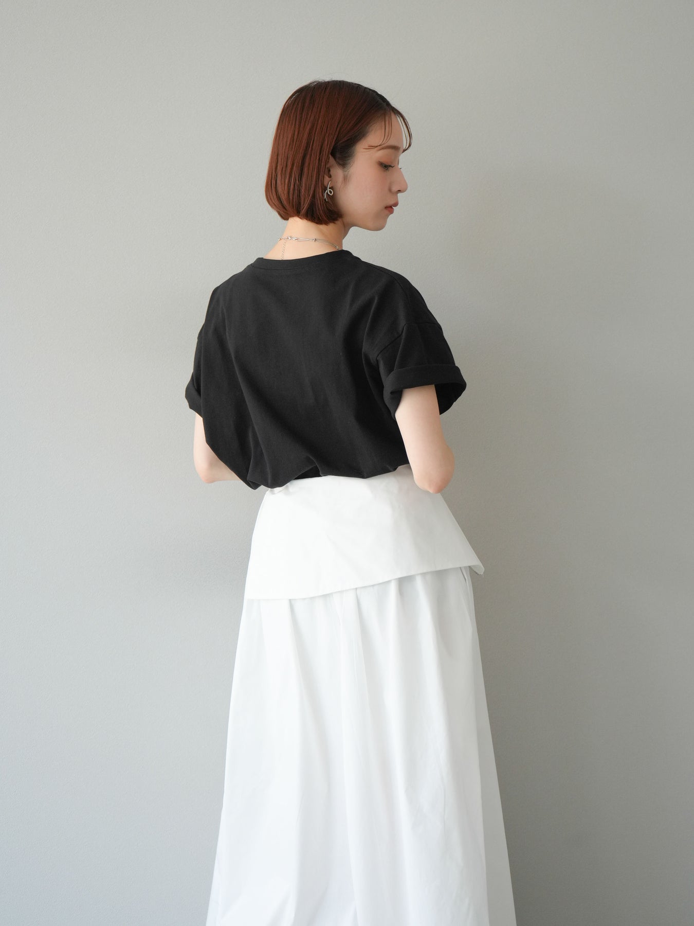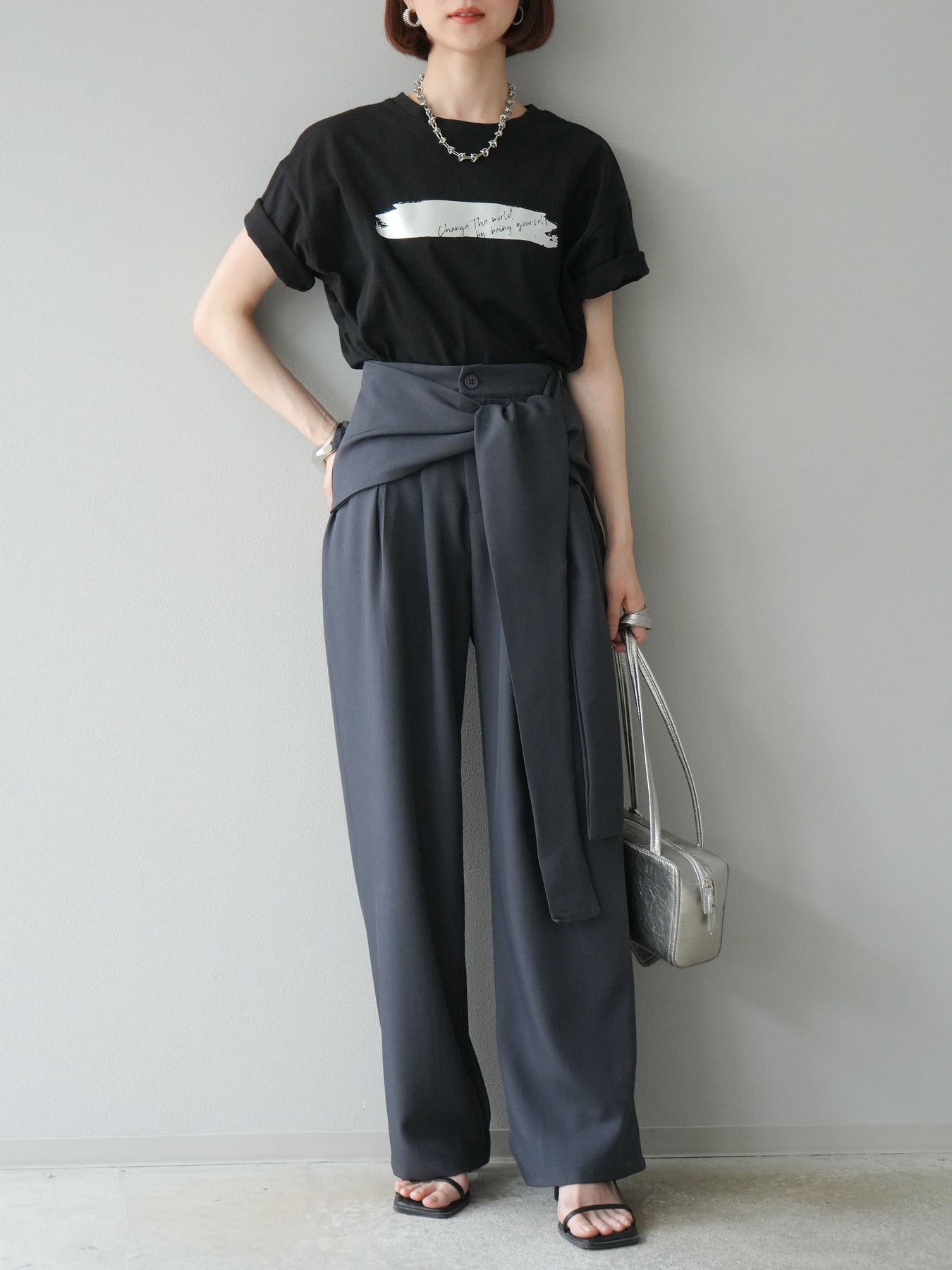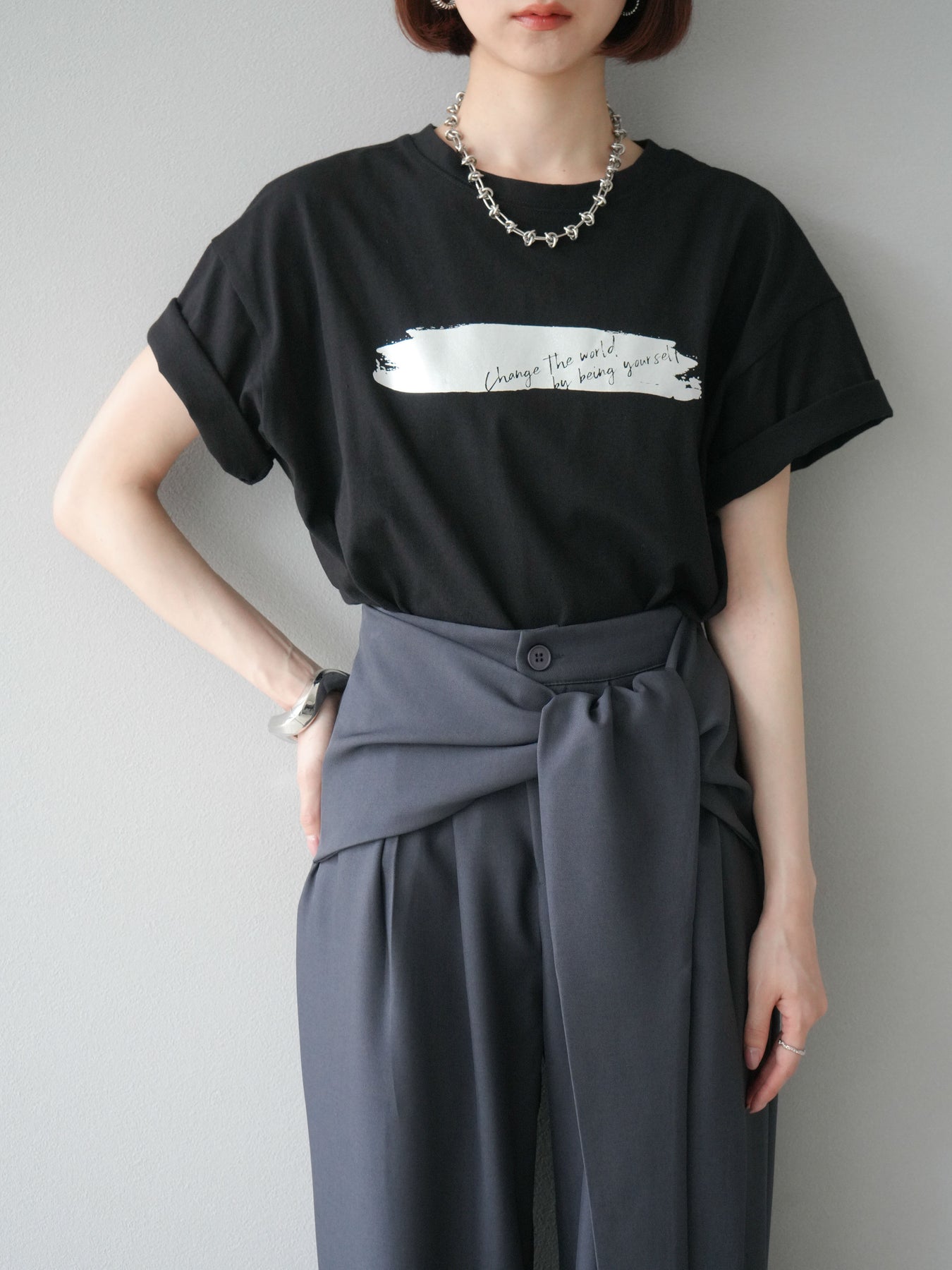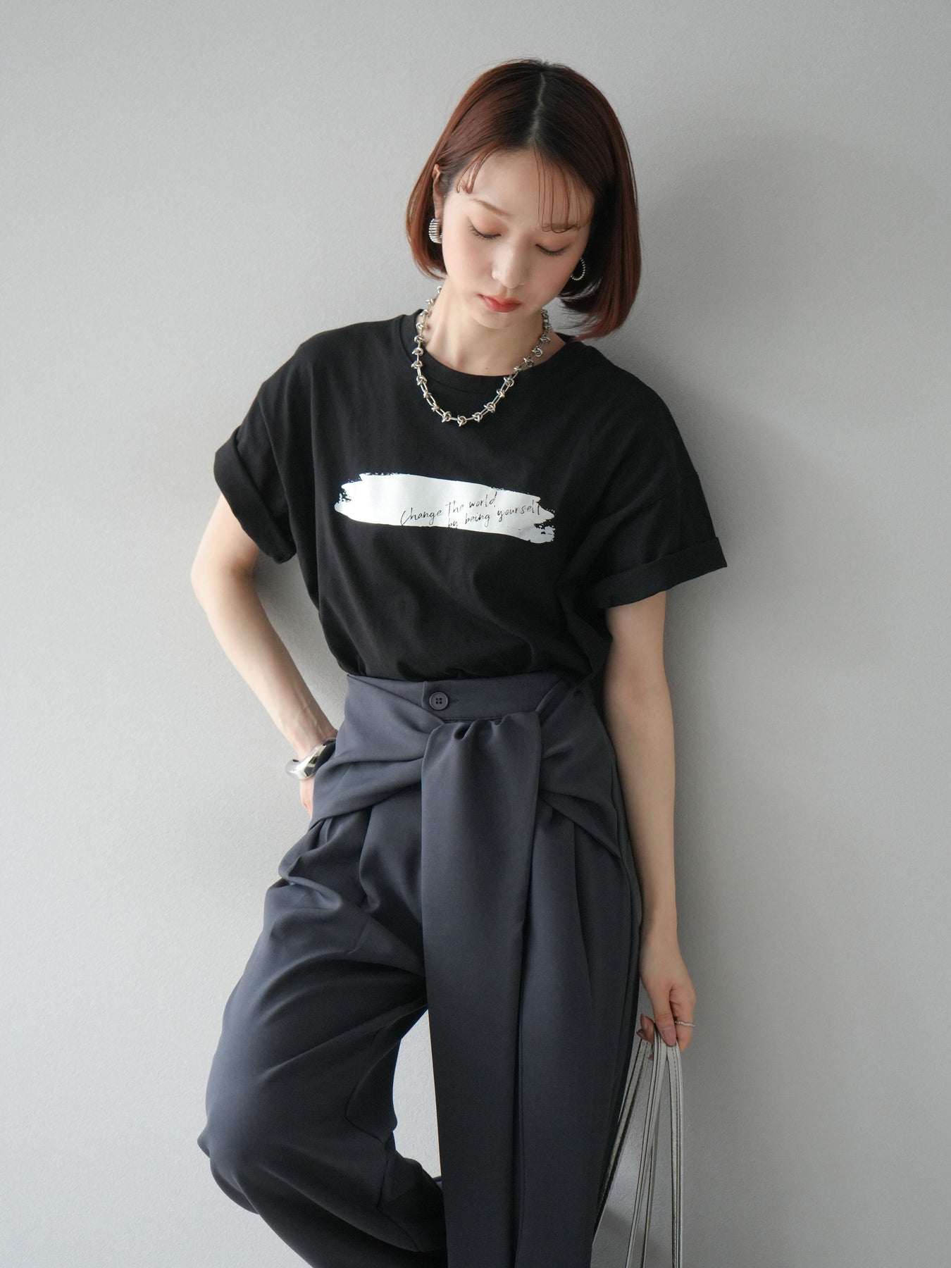 シンプルなデザインに箔プリントがアクセントとなったTシャツ。胸元に施された箔プリントがスタイリッシュな印象を与え、シンプルながらも存在感のある一枚です。ゆったりとしたシルエットでリラックス感のある着心地を提供し、カジュアルなコーディネートにぴったりです。 ※ボトムス、キャミソール(インナー)以外の商品は一律でインナーは付属していません