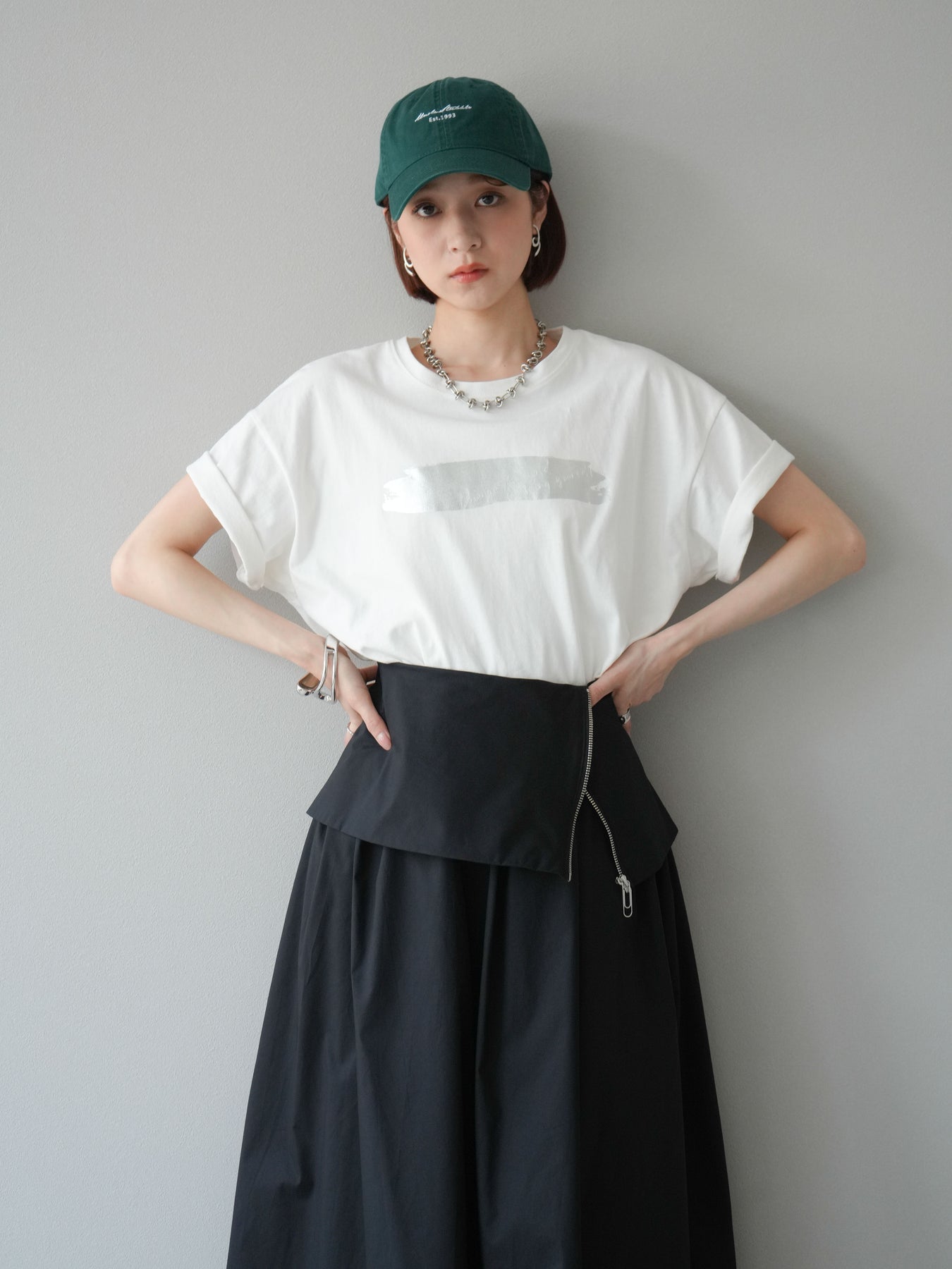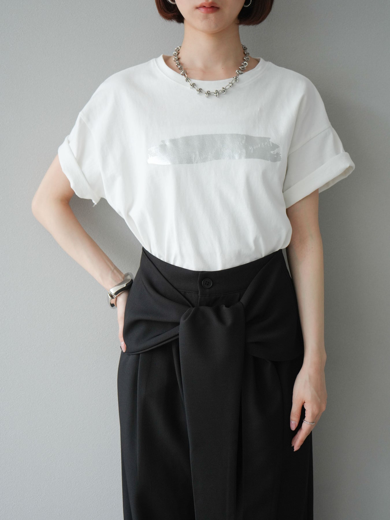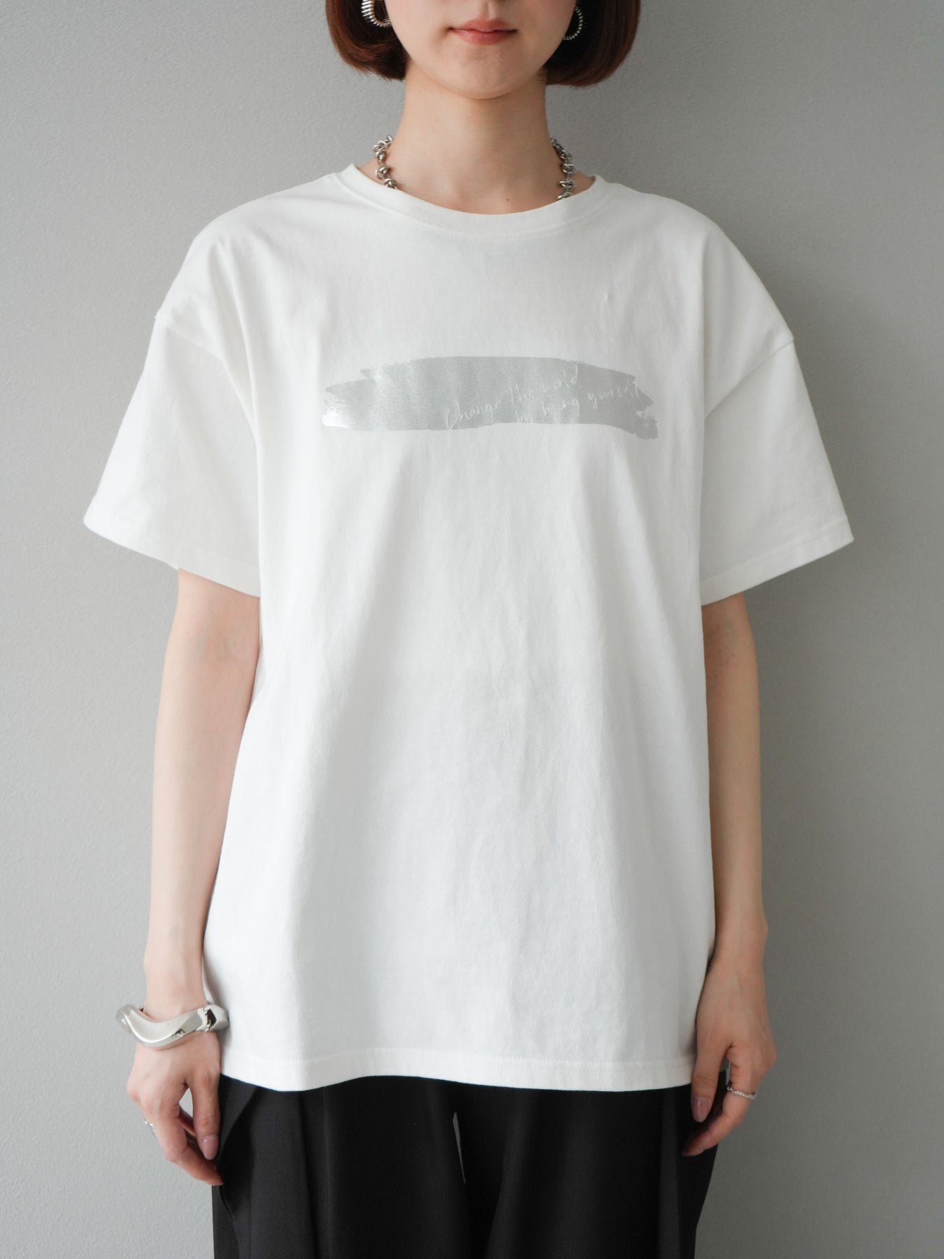 シンプルなデザインに箔プリントがアクセントとなったTシャツ。胸元に施された箔プリントがスタイリッシュな印象を与え、シンプルながらも存在感のある一枚です。ゆったりとしたシルエットでリラックス感のある着心地を提供し、カジュアルなコーディネートにぴったりです。 ※ボトムス、キャミソール(インナー)以外の商品は一律でインナーは付属していません