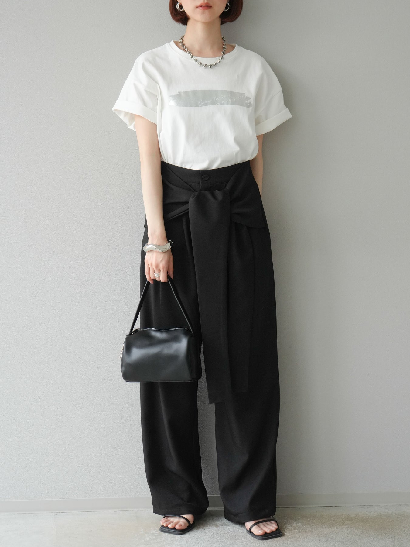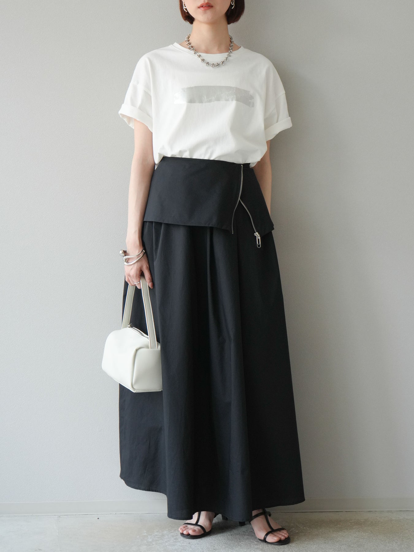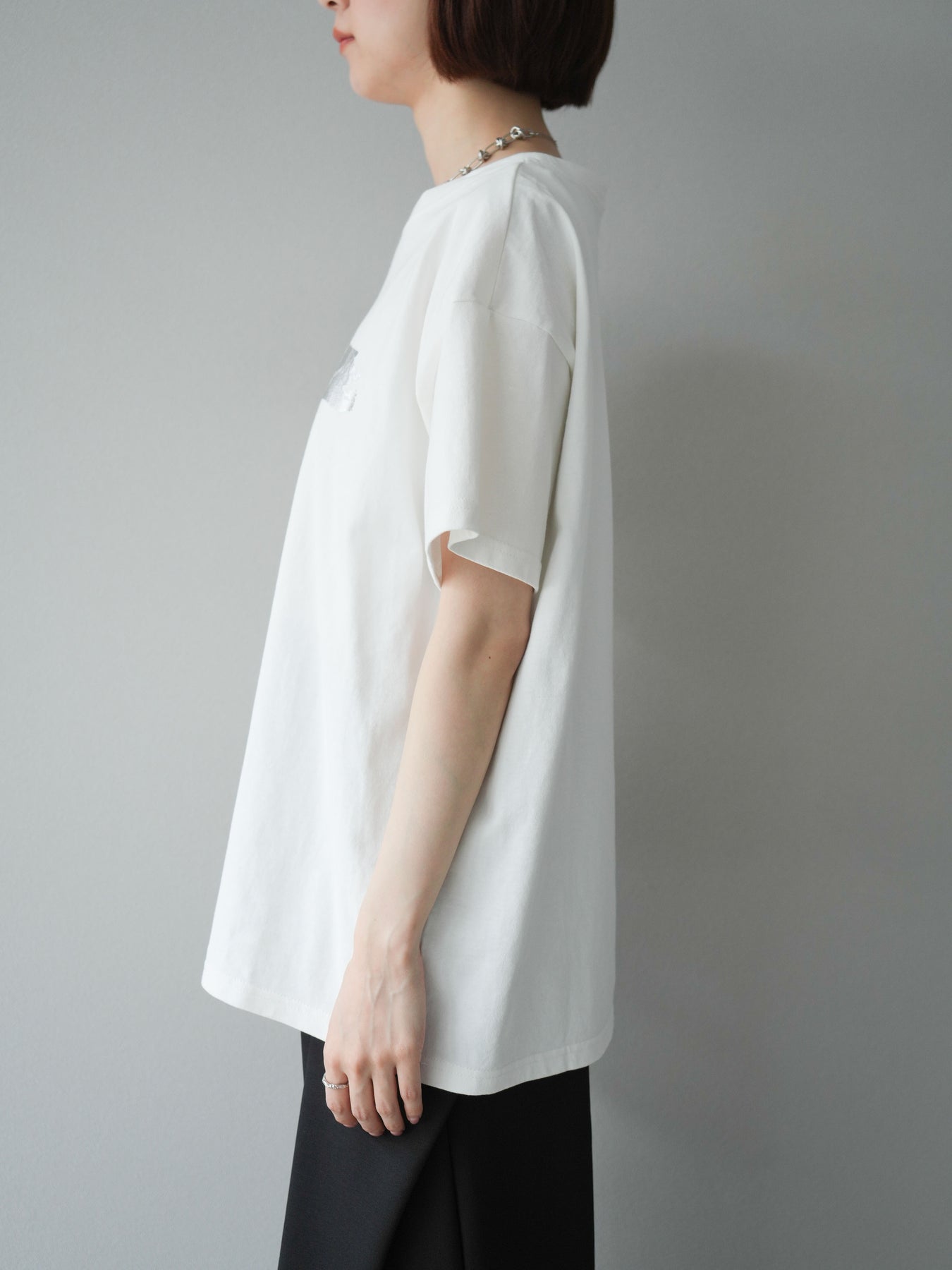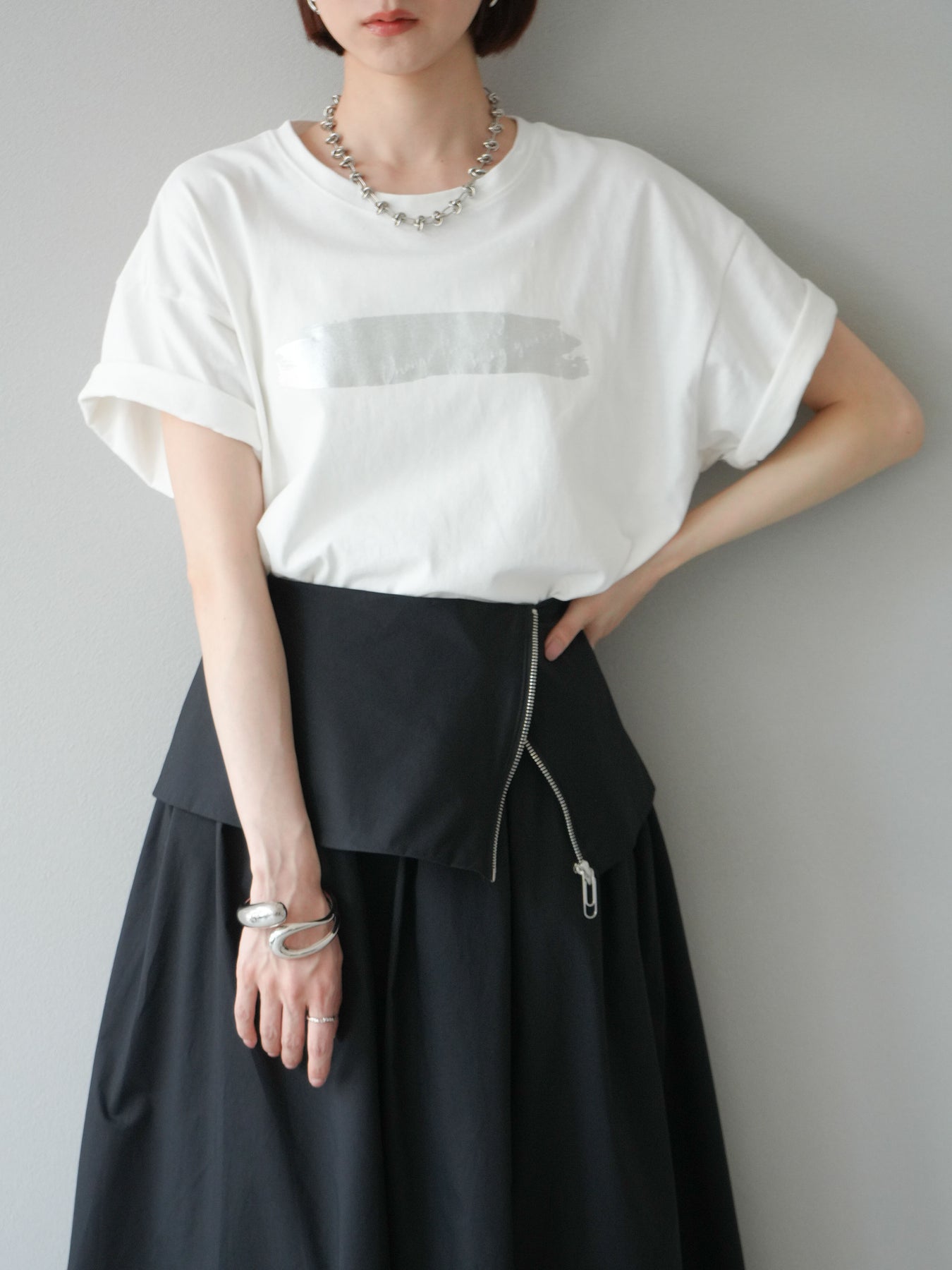 シンプルなデザインに箔プリントがアクセントとなったTシャツ。胸元に施された箔プリントがスタイリッシュな印象を与え、シンプルながらも存在感のある一枚です。ゆったりとしたシルエットでリラックス感のある着心地を提供し、カジュアルなコーディネートにぴったりです。 ※ボトムス、キャミソール(インナー)以外の商品は一律でインナーは付属していません