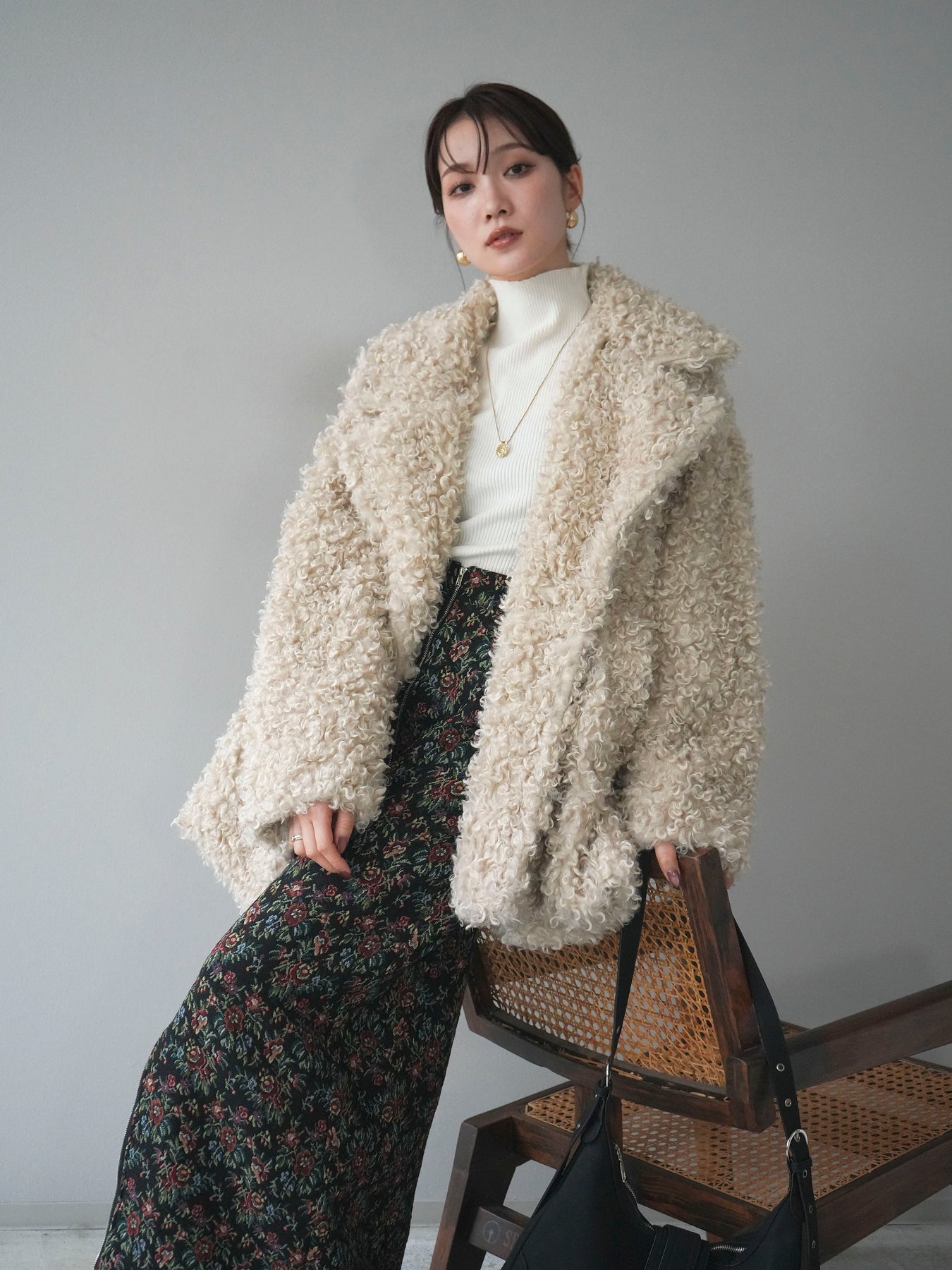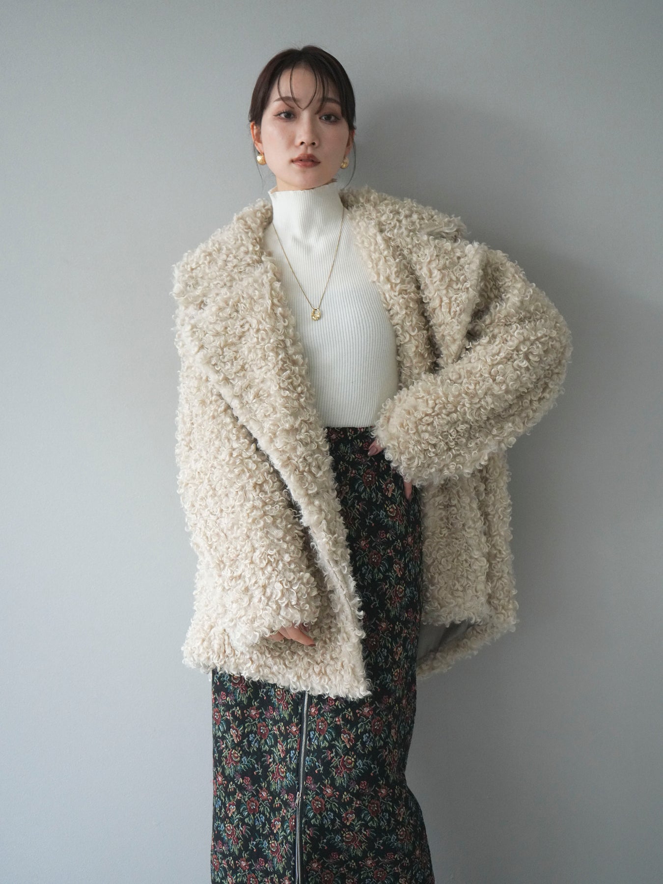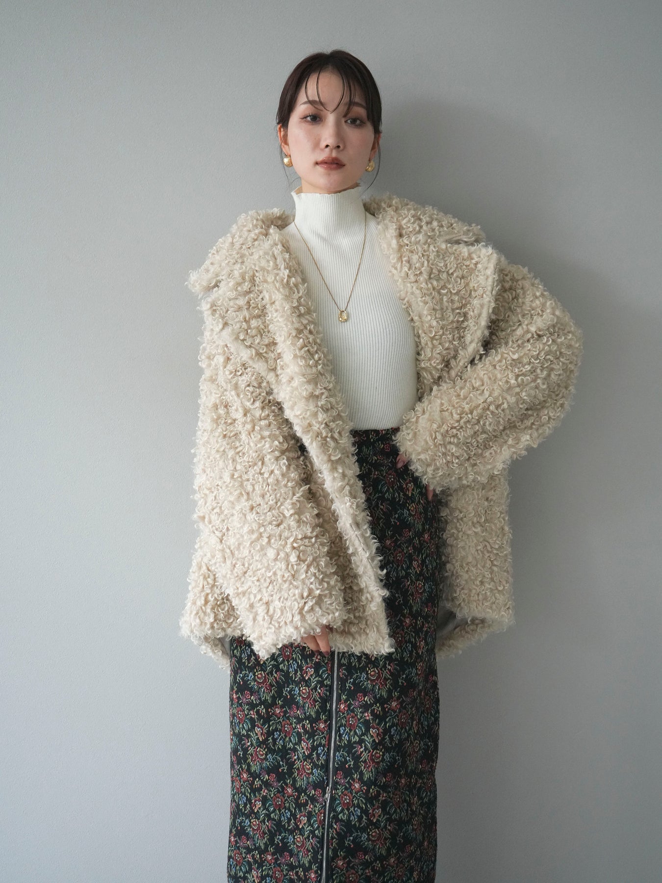 ふんわりとしたプードルファー素材が魅力のダブルミドルコート。 柔らかな質感と程よいボリュームが、シーズンムードを一気に高めてくれます。 ダブルボタン仕様でクラシカルな印象を与えつつ、軽やかな着心地も叶えた一枚。 ミドル丈のバランスが取りやすく、ワイドパンツやスカートとも相性抜群です。 羽織るだけで華やかさと上品さを兼ね備えた、冬の定番アウターとして活躍します。 ※ボトムス、キャミソール(インナー)以外の商品は一律でインナーは付属していません。