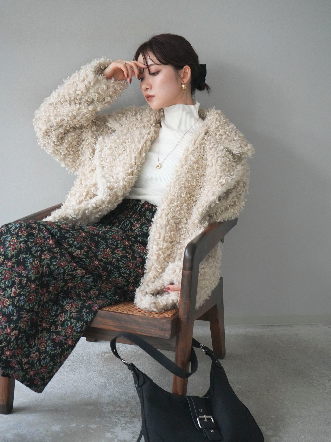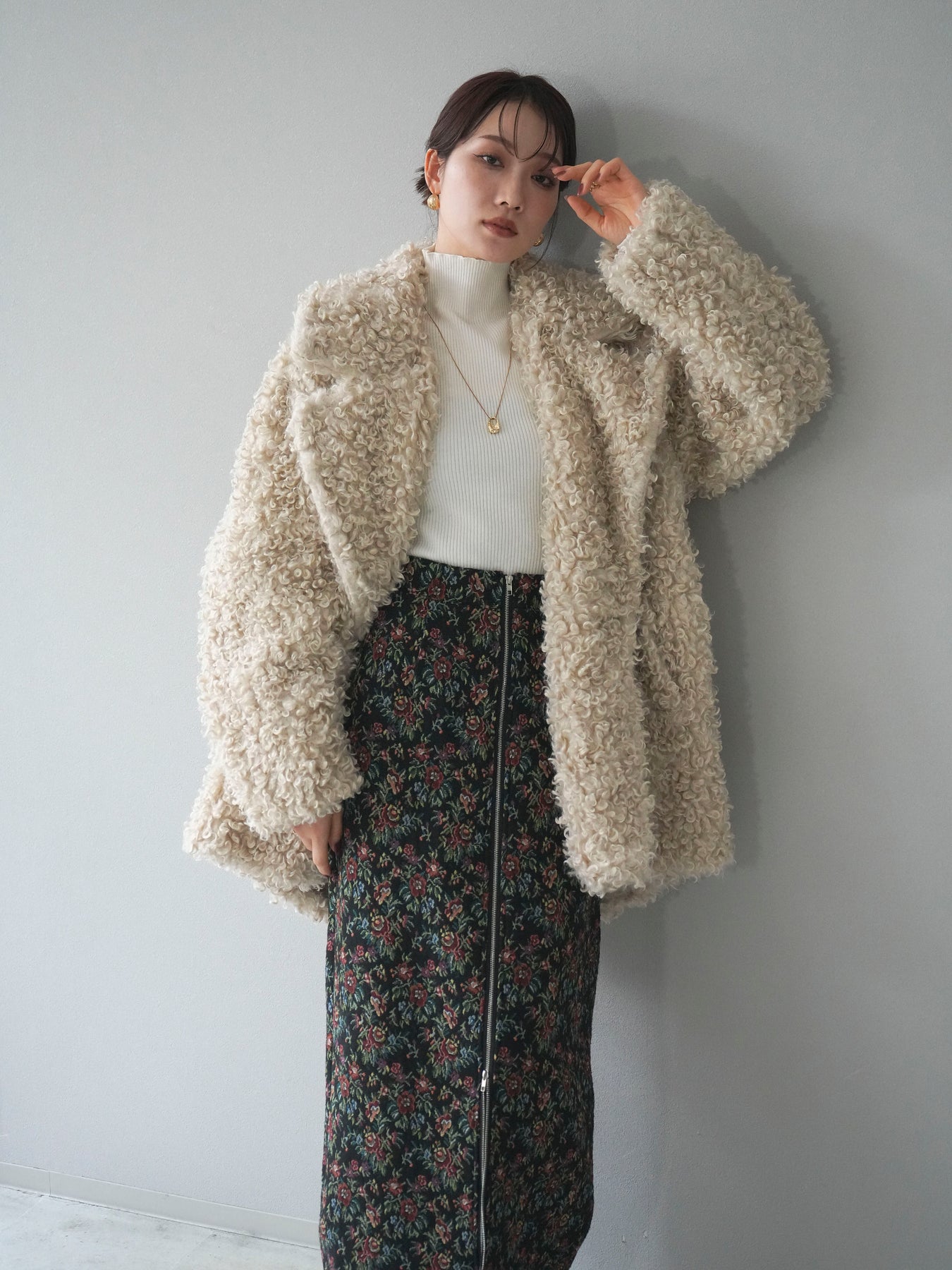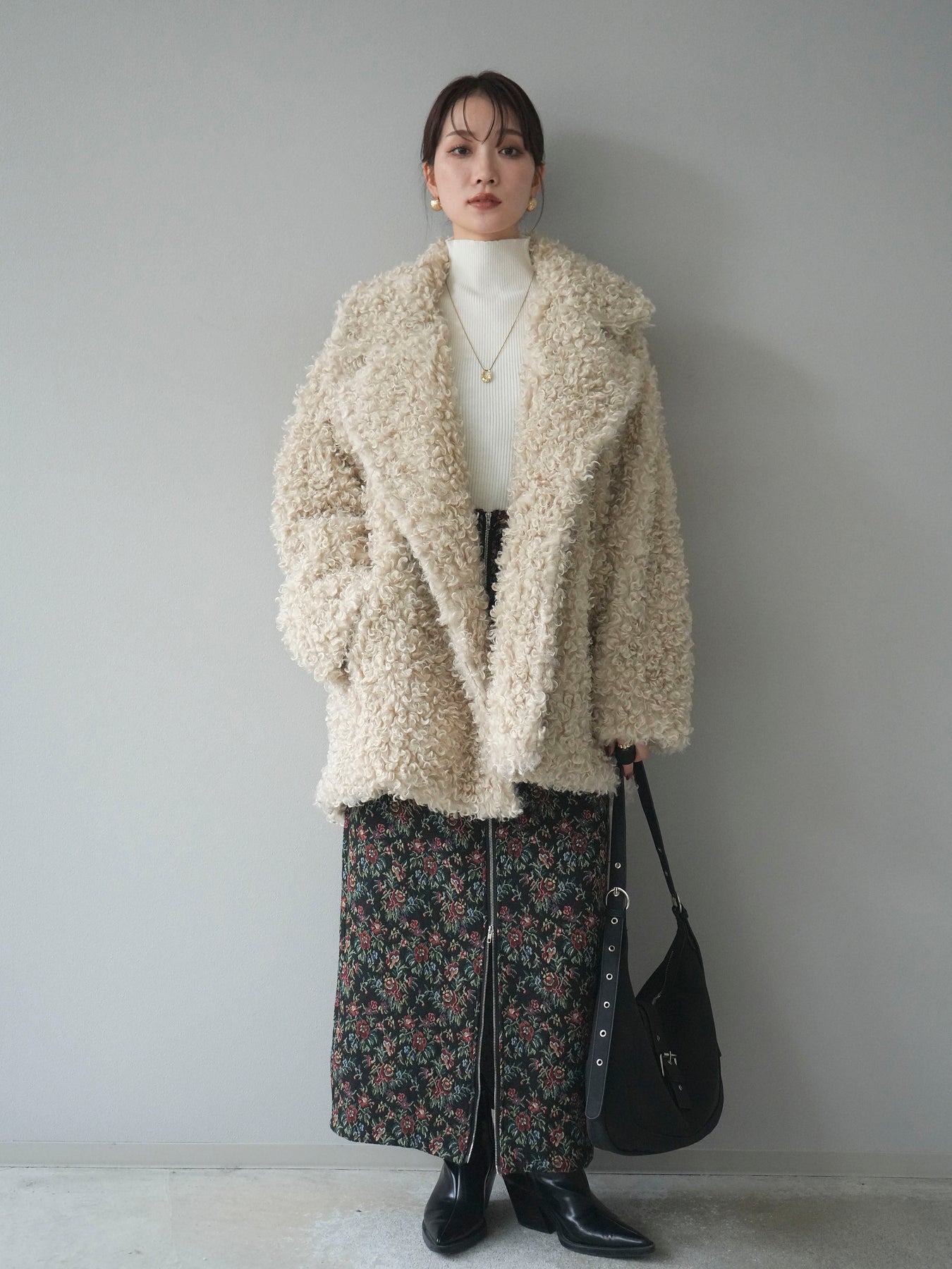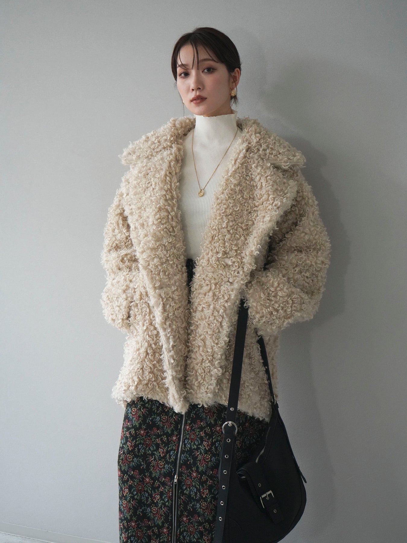 ふんわりとしたプードルファー素材が魅力のダブルミドルコート。 柔らかな質感と程よいボリュームが、シーズンムードを一気に高めてくれます。 ダブルボタン仕様でクラシカルな印象を与えつつ、軽やかな着心地も叶えた一枚。 ミドル丈のバランスが取りやすく、ワイドパンツやスカートとも相性抜群です。 羽織るだけで華やかさと上品さを兼ね備えた、冬の定番アウターとして活躍します。 ※ボトムス、キャミソール(インナー)以外の商品は一律でインナーは付属していません。