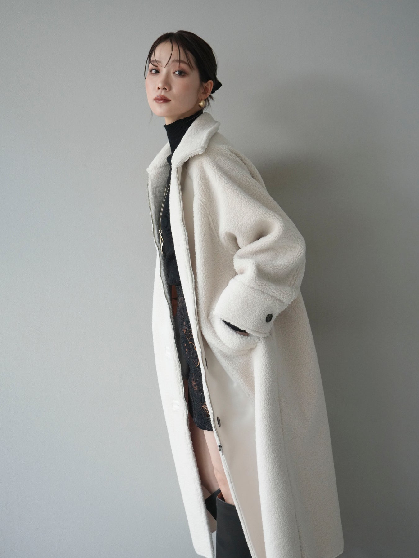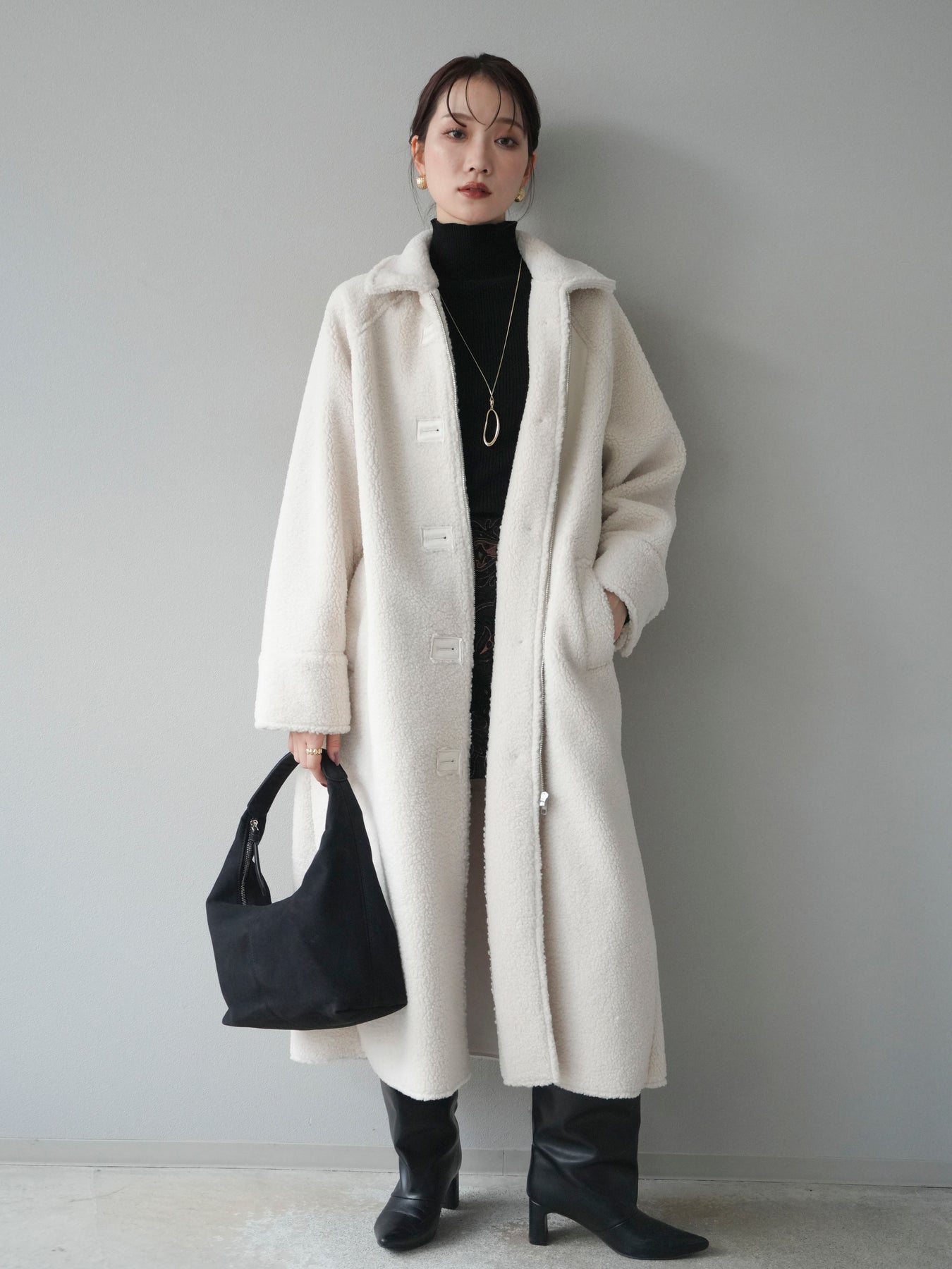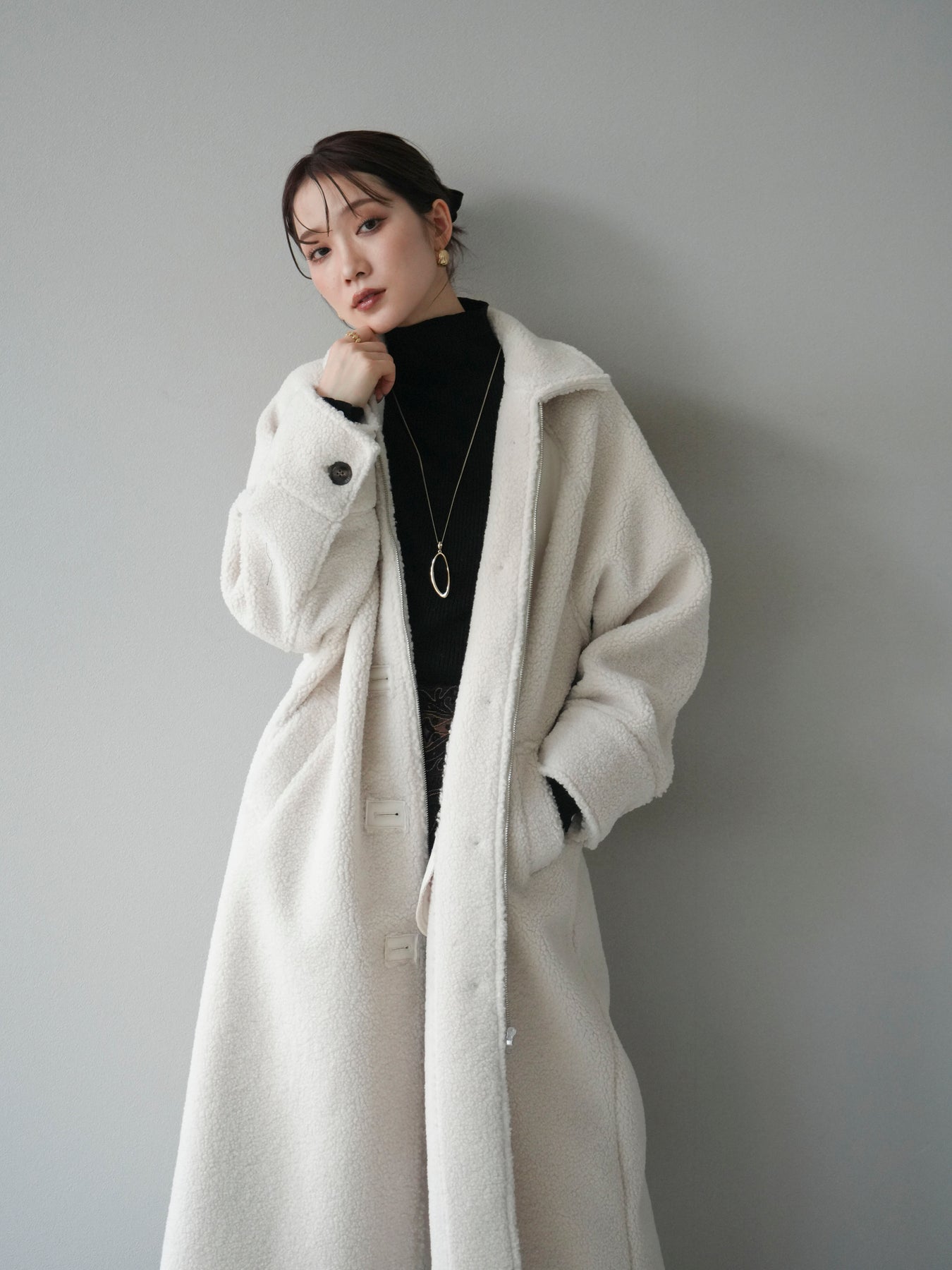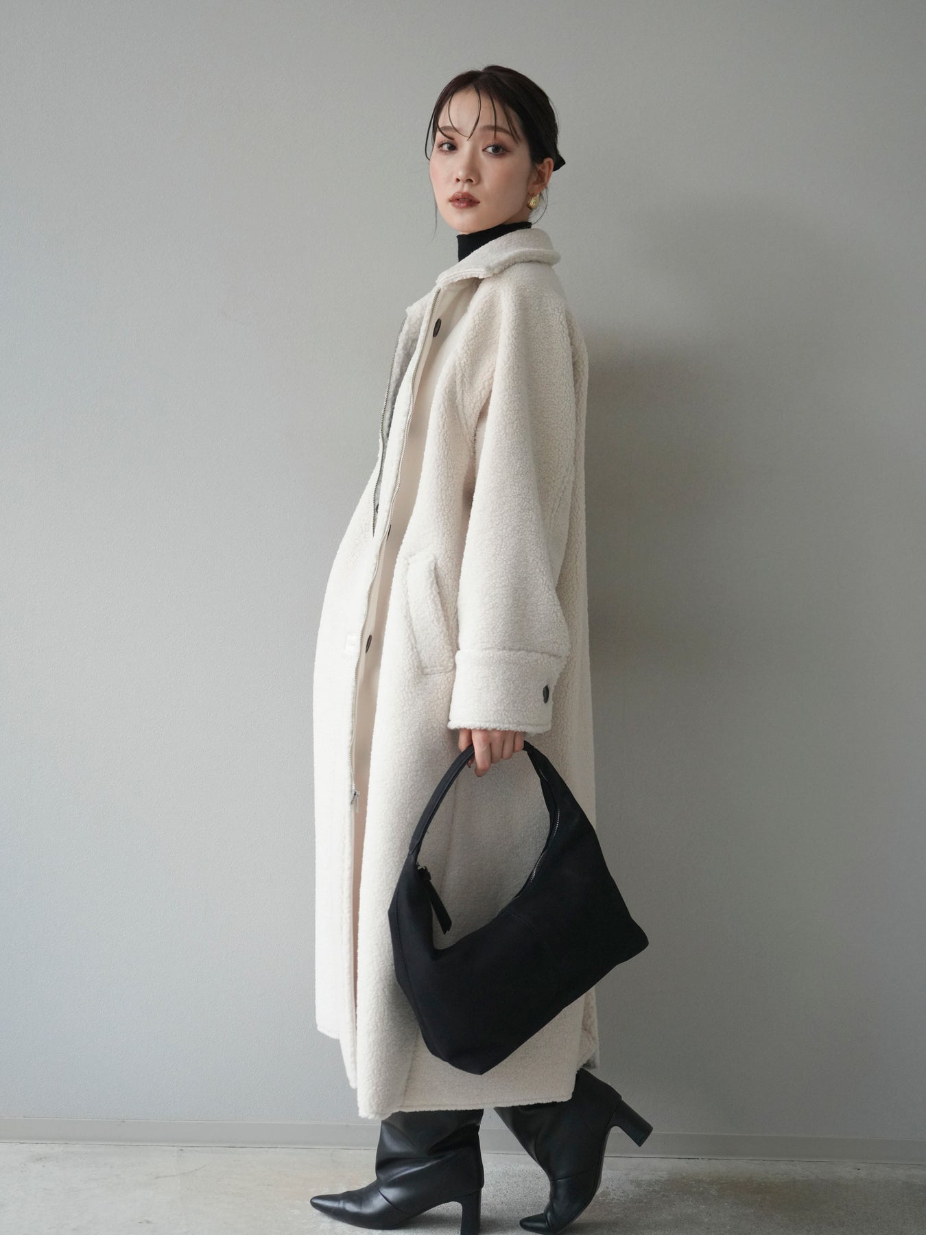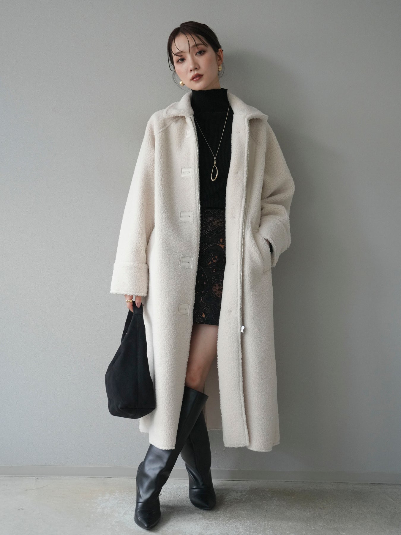 ふっくらとしたボアと滑らかなフェイクムートンを組み合わせた、リュクスな印象のロングコート。 異素材のコンビネーションが奥行きのある表情を生み出し、羽織るだけでスタイリングを格上げします。 しっかりと厚みのある素材ながら軽やかで、保温性にも優れた一枚。 ボリュームのあるシルエットが華奢見えを叶えつつ、ロング丈で全体をバランスよくまとめています。 デイリーから特別なシーンまで活躍し、冬の主役アウターとして長く愛用できるアイテムです。 ※ボトムス、キャミソール(インナー)以外の商品は一律でインナーは付属していません。