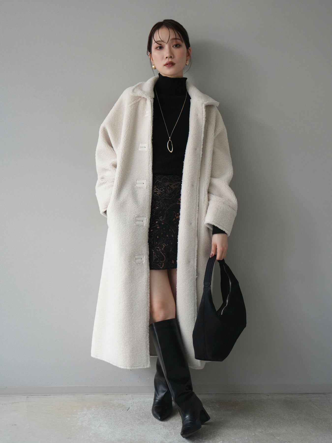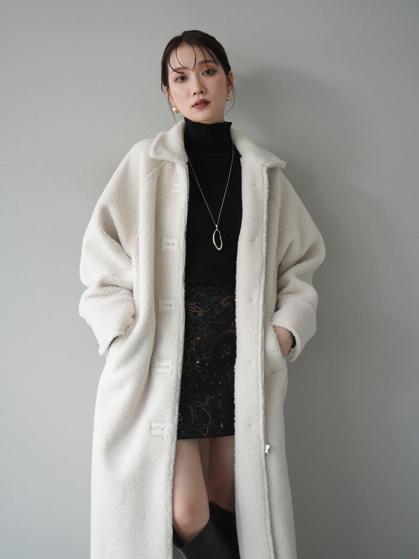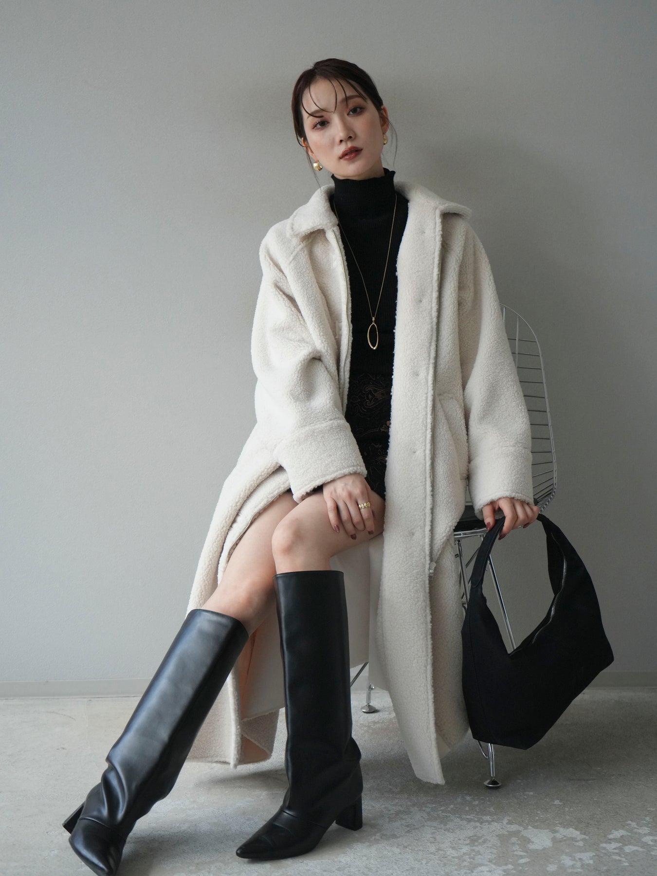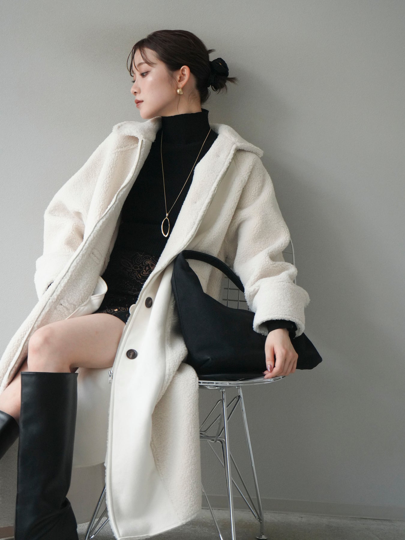 ふっくらとしたボアと滑らかなフェイクムートンを組み合わせた、リュクスな印象のロングコート。 異素材のコンビネーションが奥行きのある表情を生み出し、羽織るだけでスタイリングを格上げします。 しっかりと厚みのある素材ながら軽やかで、保温性にも優れた一枚。 ボリュームのあるシルエットが華奢見えを叶えつつ、ロング丈で全体をバランスよくまとめています。 デイリーから特別なシーンまで活躍し、冬の主役アウターとして長く愛用できるアイテムです。 ※ボトムス、キャミソール(インナー)以外の商品は一律でインナーは付属していません。