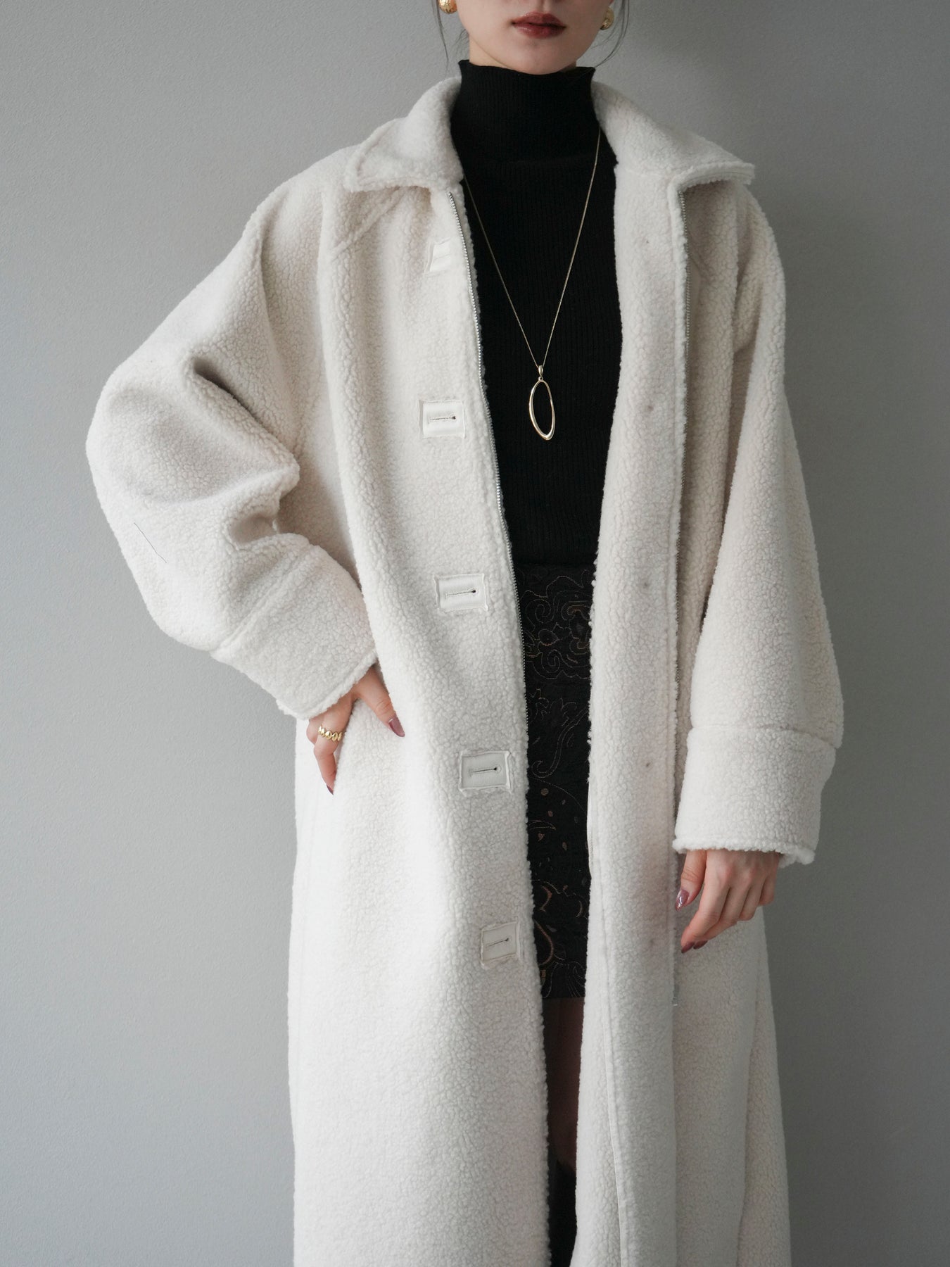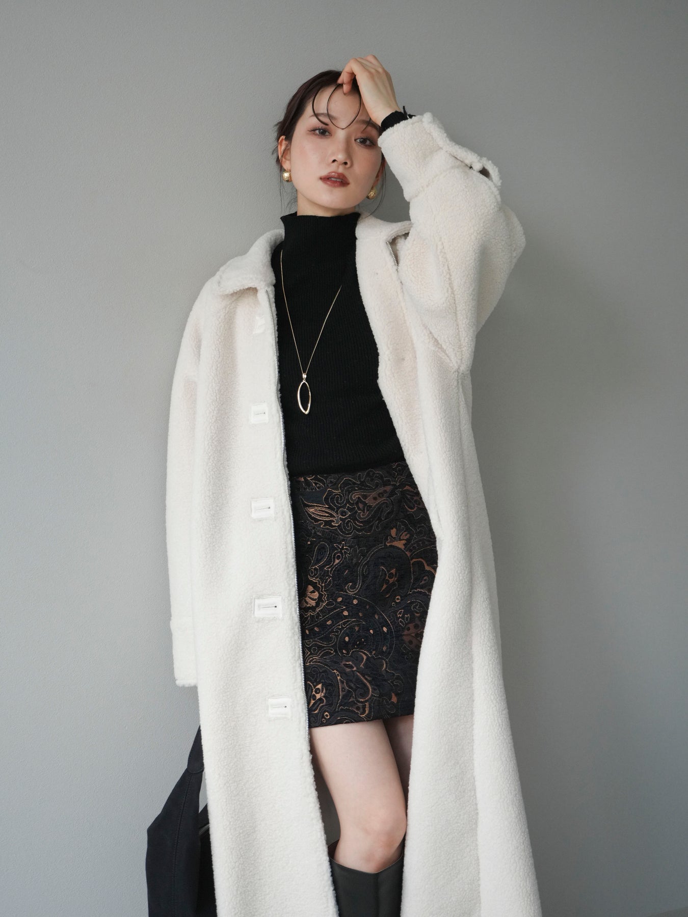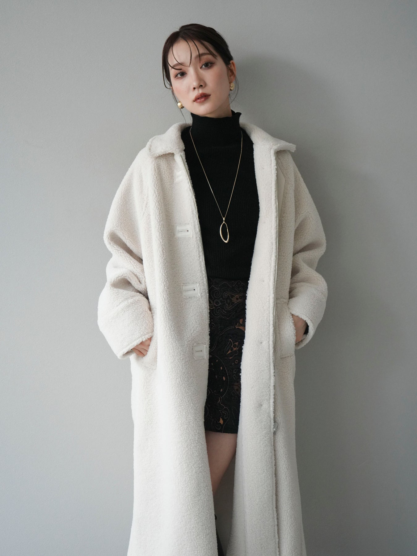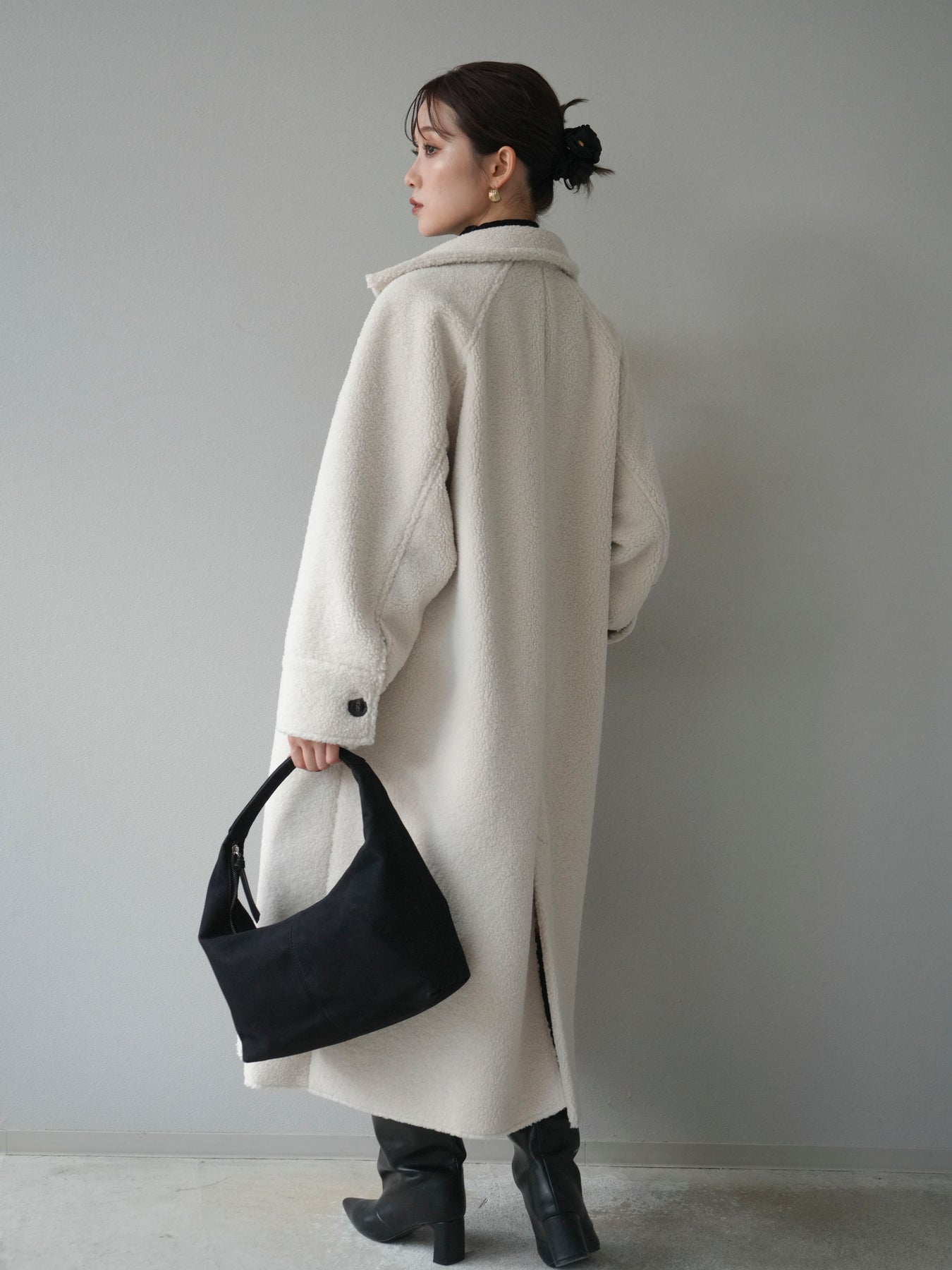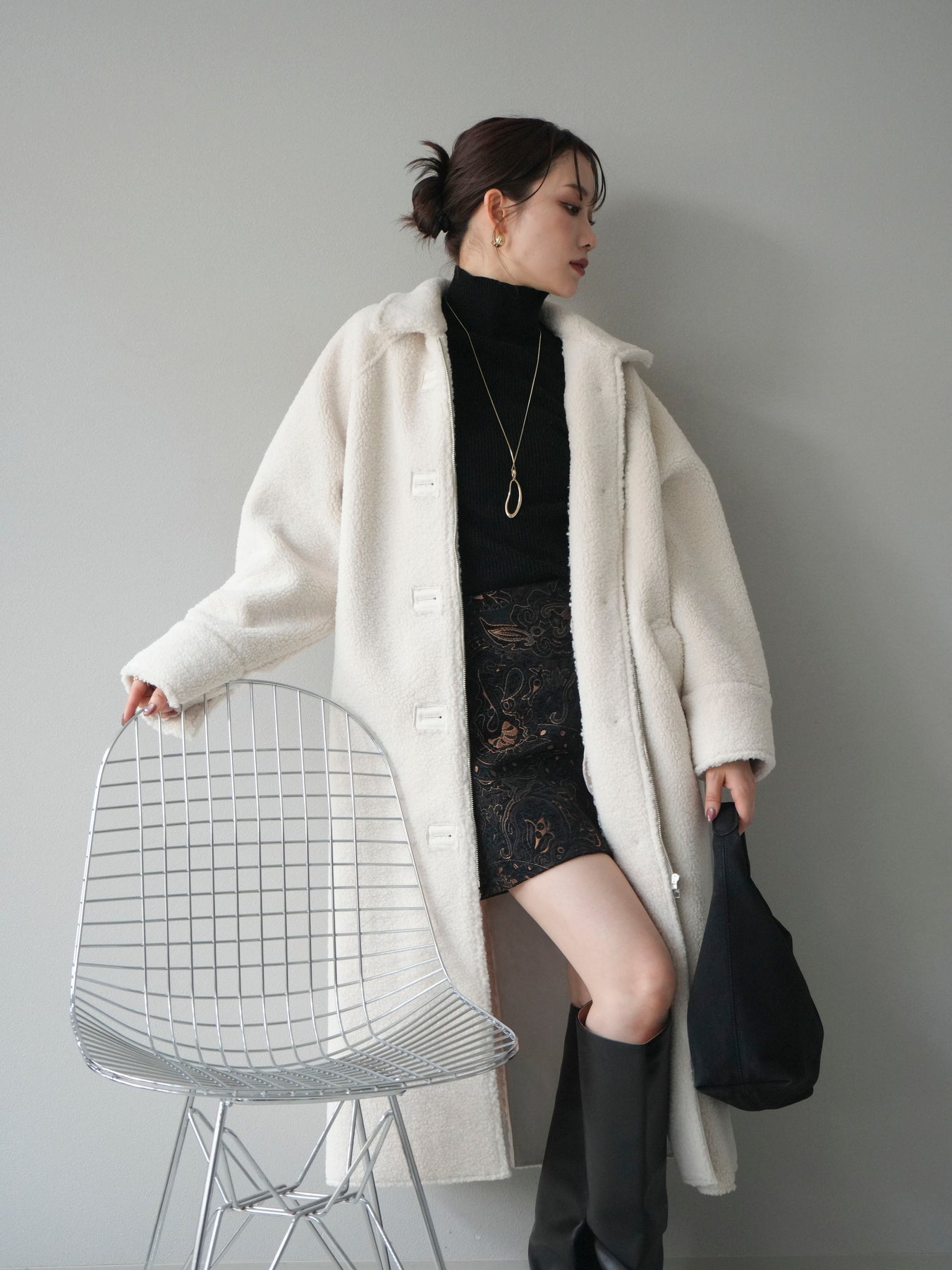 ふっくらとしたボアと滑らかなフェイクムートンを組み合わせた、リュクスな印象のロングコート。 異素材のコンビネーションが奥行きのある表情を生み出し、羽織るだけでスタイリングを格上げします。 しっかりと厚みのある素材ながら軽やかで、保温性にも優れた一枚。 ボリュームのあるシルエットが華奢見えを叶えつつ、ロング丈で全体をバランスよくまとめています。 デイリーから特別なシーンまで活躍し、冬の主役アウターとして長く愛用できるアイテムです。 ※ボトムス、キャミソール(インナー)以外の商品は一律でインナーは付属していません。