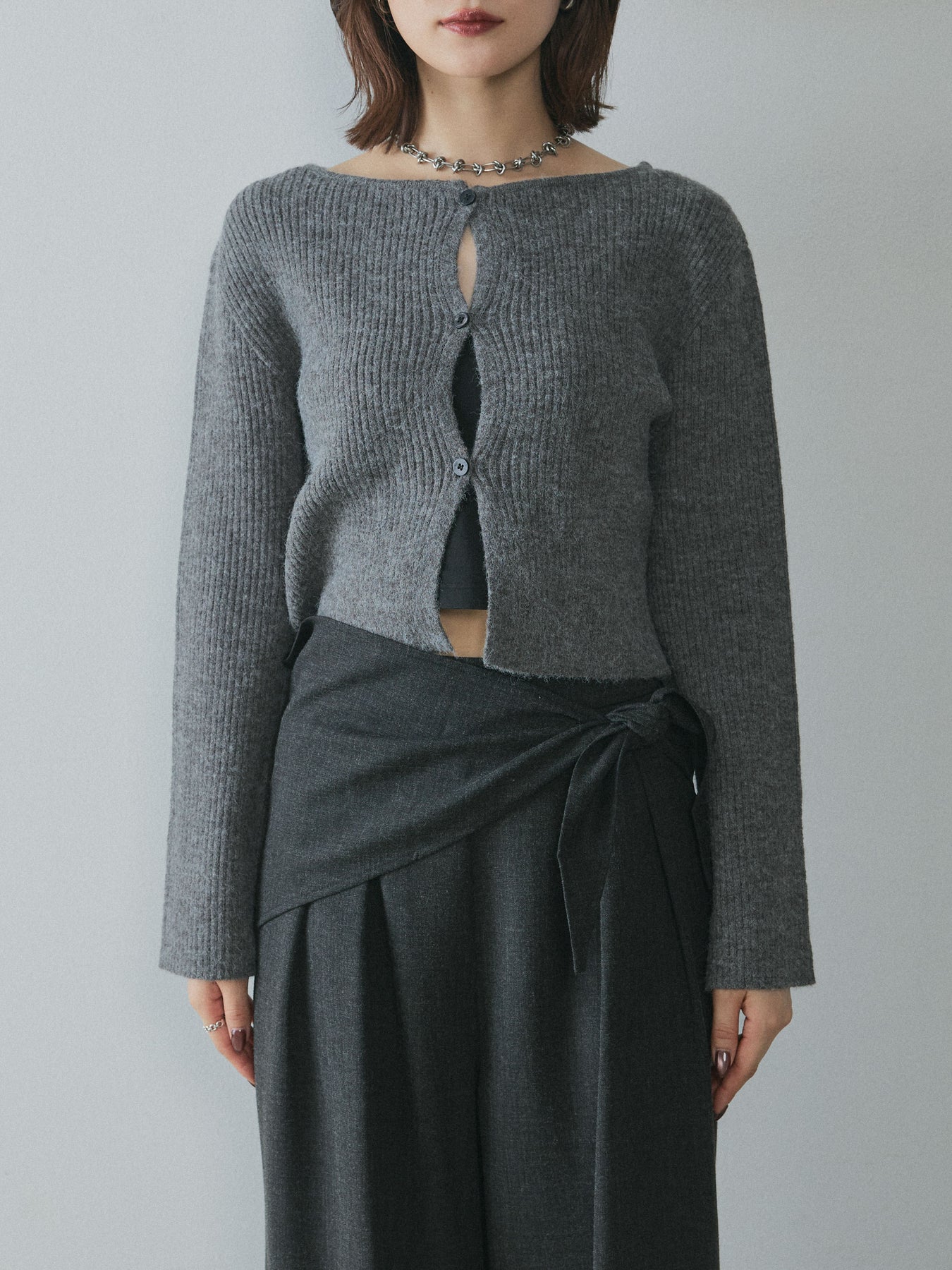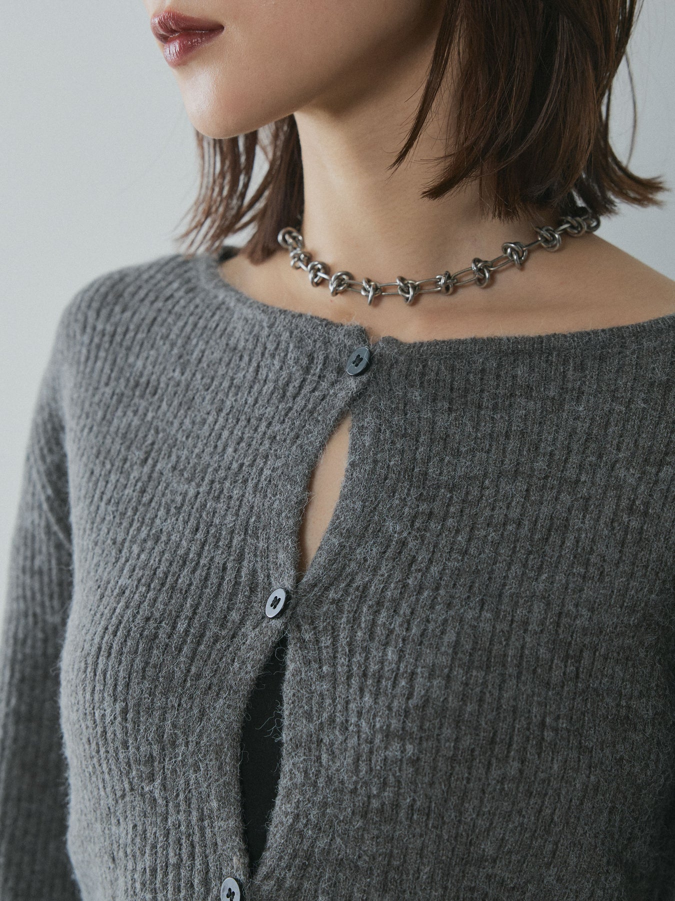 コンパクトな丈感と、フロントのデザインボタンが特徴のショートニットカーディガン。程よい開きのネックラインがデコルテをきれいに見せ、女性らしい抜け感を演出します。さらりとしたニット素材で着心地が良く、ボトムスを選ばずバランスの取りやすいシルエット。ボタンを閉じてトップスとして着るのはもちろん、羽織りとしても活躍する万能アイテムです。