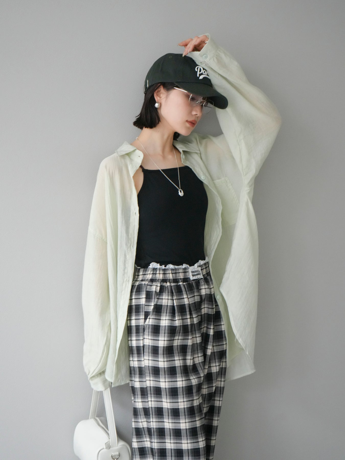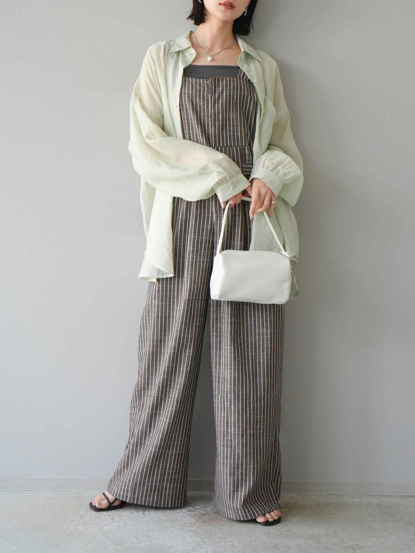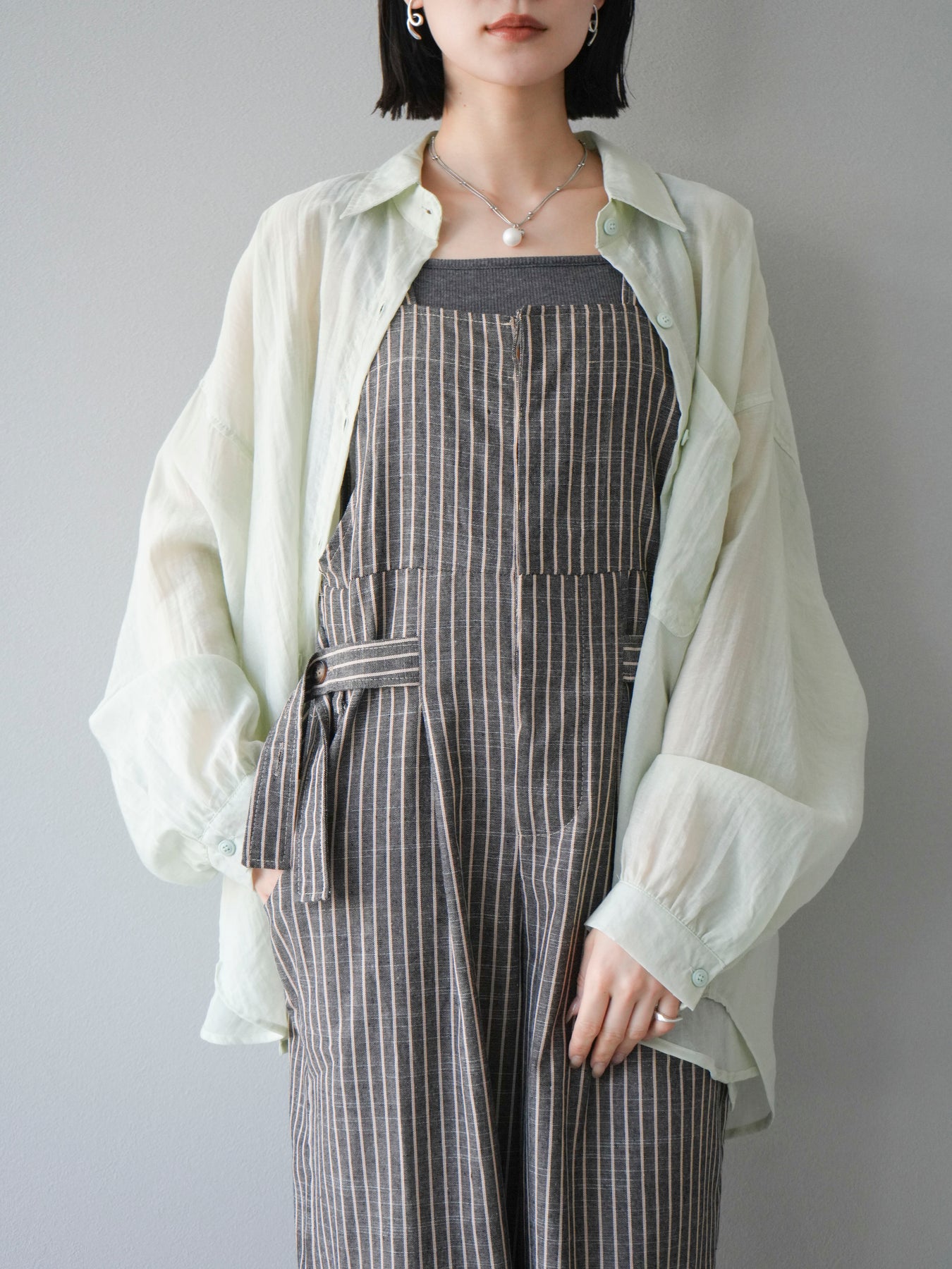 軽やかなシアー素材を使用したオーバーシャツ。ドライタッチな風合いが涼しげで、春夏にぴったりの一枚です。ゆったりとしたシルエットで、リラックスした着心地を提供し、シンプルながらも清涼感のあるスタイルを演出します。ワイドな袖と、前開きのデザインがアクセントとなり、さまざまなコーディネートに活躍するアイテムです。 ※ボトムス、キャミソール(インナー)以外の商品は一律でインナーは付属していません