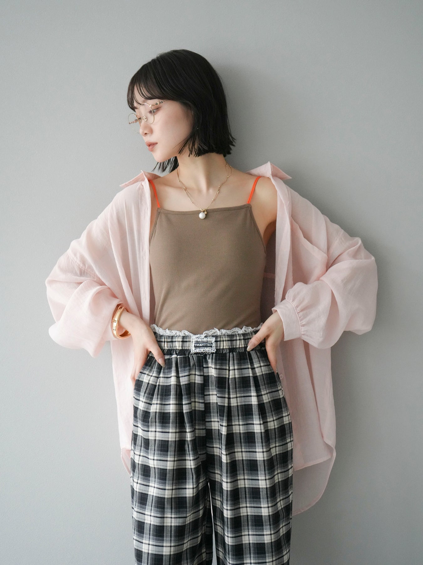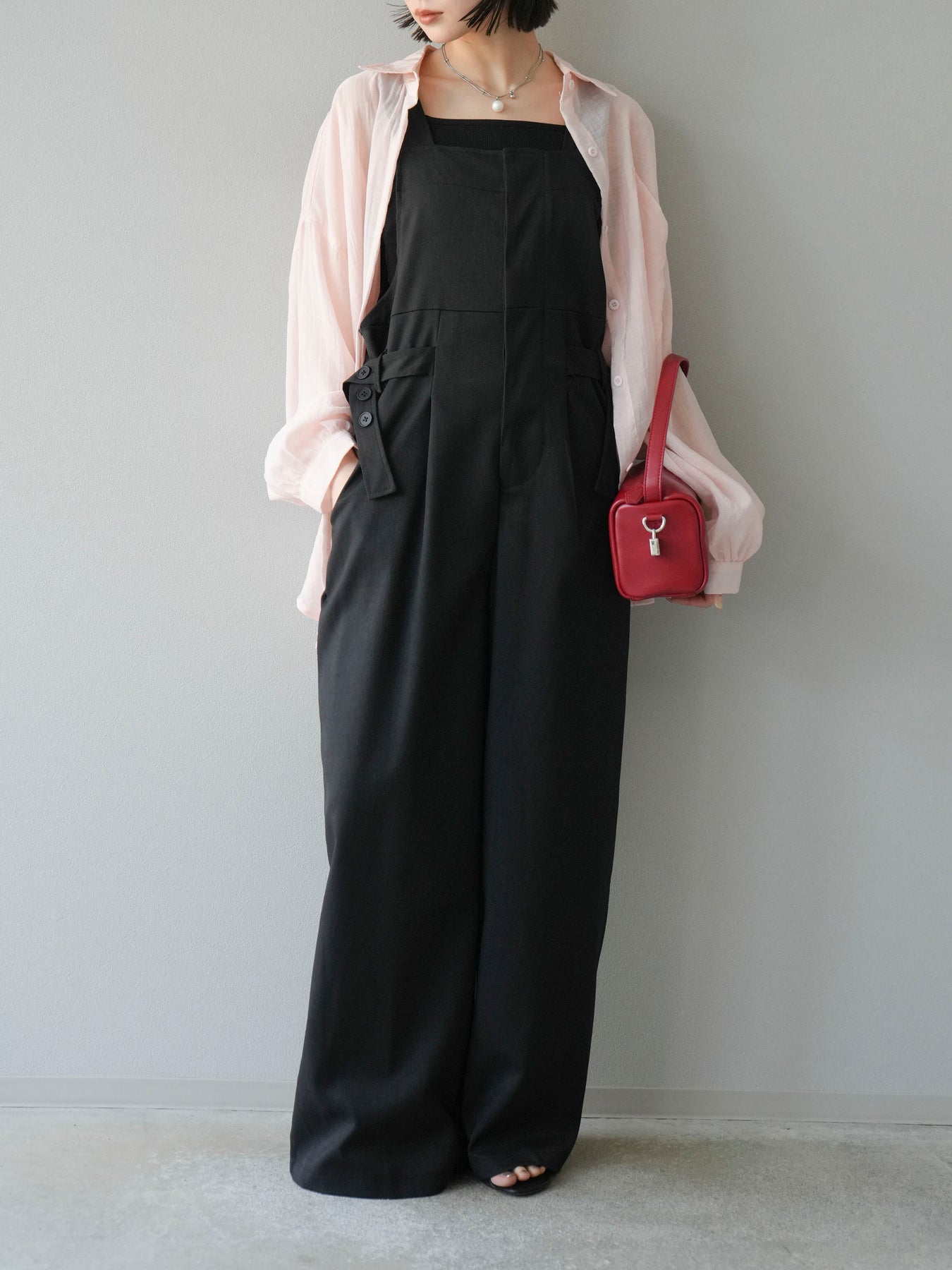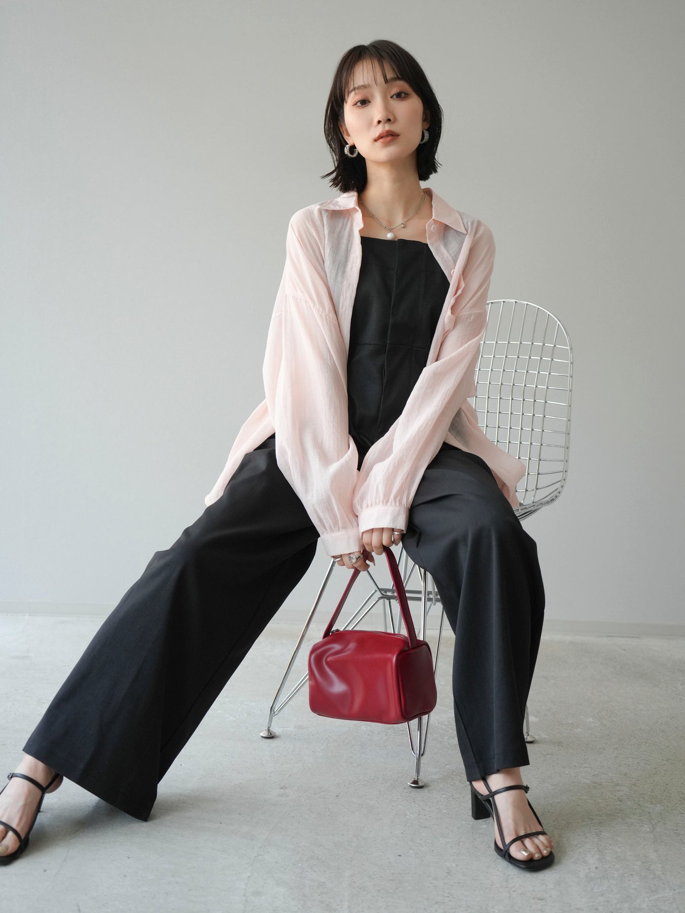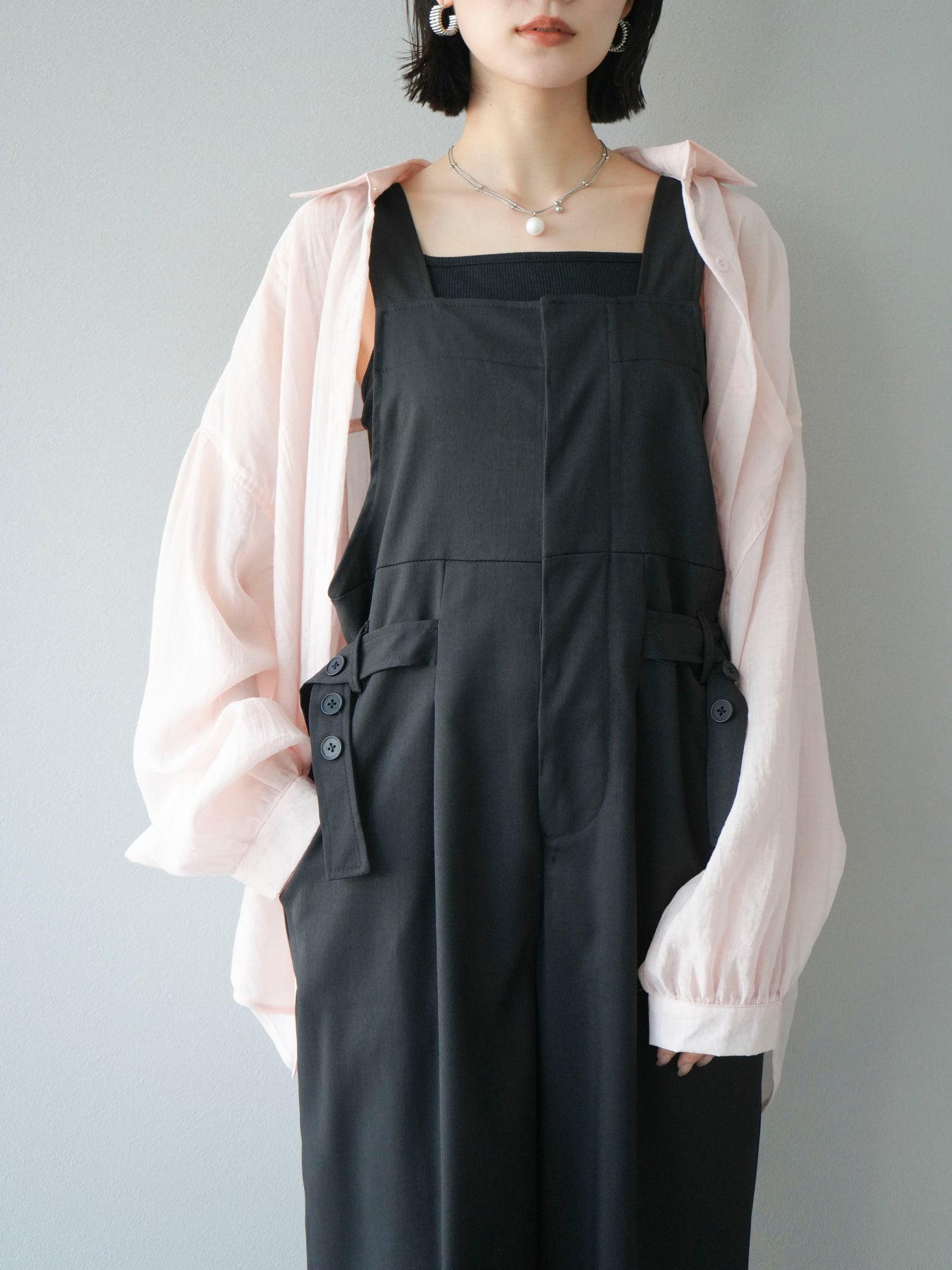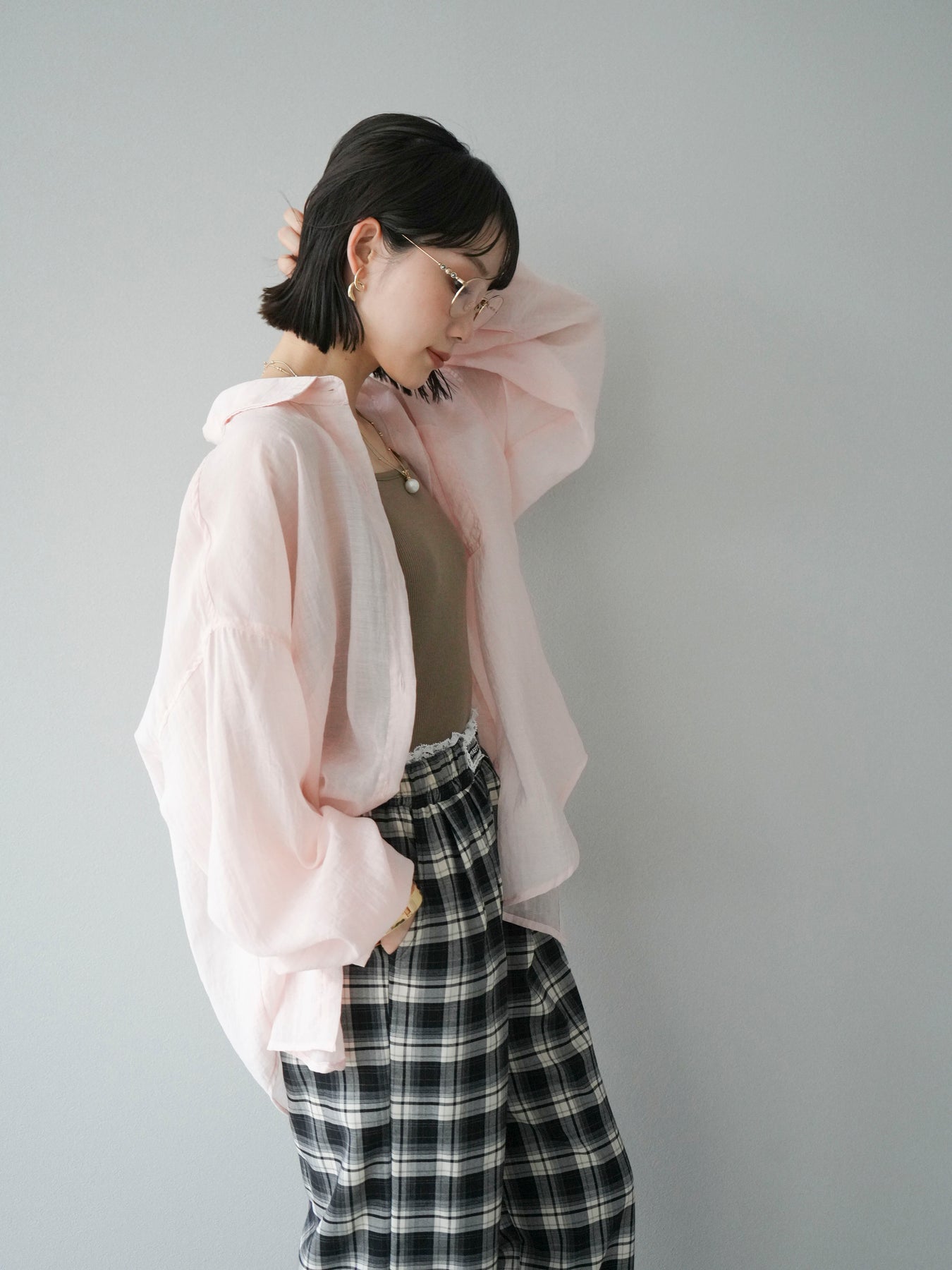 軽やかなシアー素材を使用したオーバーシャツ。ドライタッチな風合いが涼しげで、春夏にぴったりの一枚です。ゆったりとしたシルエットで、リラックスした着心地を提供し、シンプルながらも清涼感のあるスタイルを演出します。ワイドな袖と、前開きのデザインがアクセントとなり、さまざまなコーディネートに活躍するアイテムです。 ※ボトムス、キャミソール(インナー)以外の商品は一律でインナーは付属していません
