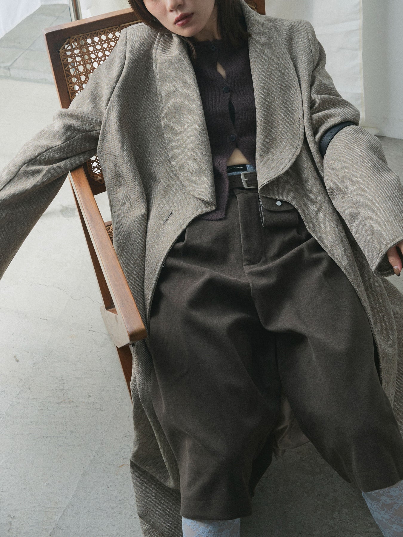 大きめのショールカラーとロング丈のシルエットが印象的な一着。程よく厚みのあるツイード風素材で、クラシックながらも抜け感のあるデザイン。ウエストは同素材の細紐ベルトでさりげなくマークでき、前を開けても閉めてもバランス良く決まるのが魅力です。