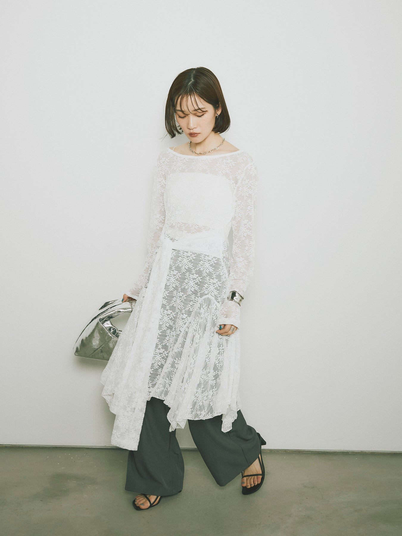 繊細なレースと動きのあるラッフルが印象的なロングトップス。シアー感のある素材が女性らしさを引き立てつつ、ブラックカラーで甘さを抑えたバランスが魅力。前後差のあるヘムラインが軽やかな抜け感を演出し、パンツ合わせでもワンピース風でも着こなせる優秀アイテム。レイヤードスタイルが楽しめる一枚です。 ※ボトムス、キャミソール(インナー)以外の商品は一律でインナーは付属していません
