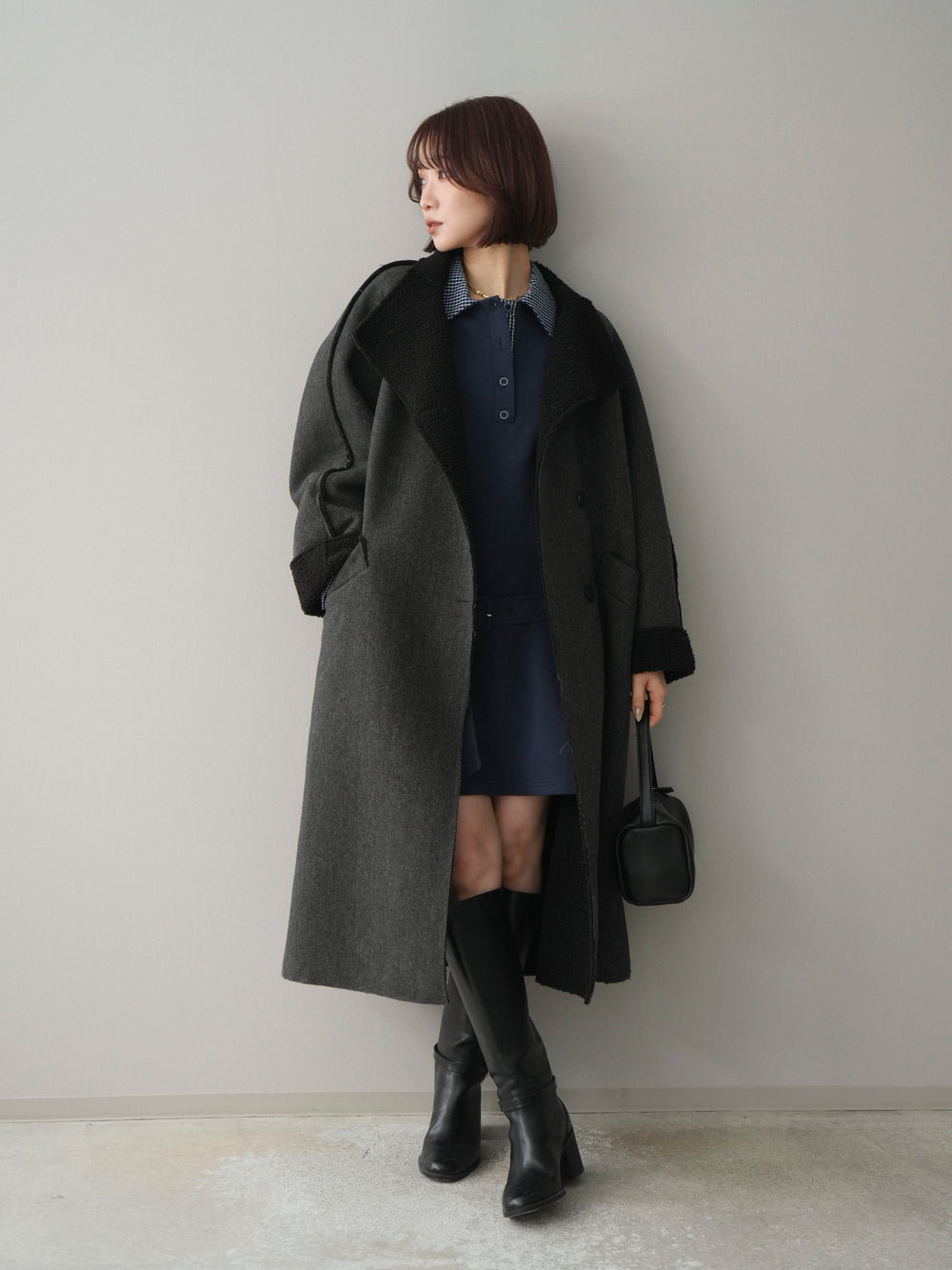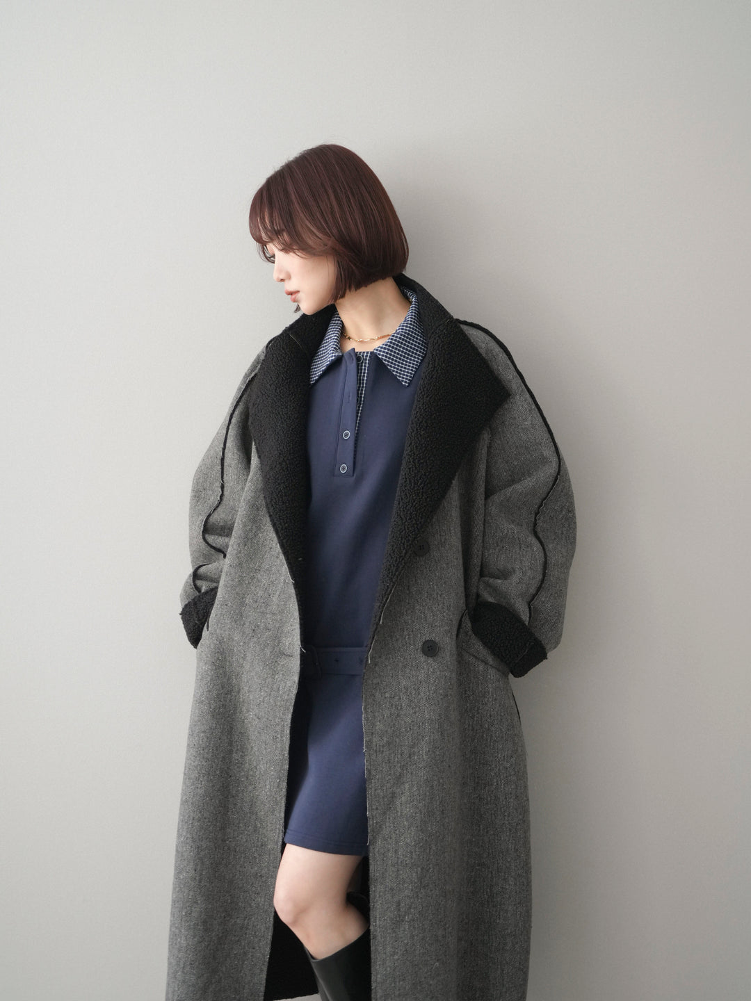 [SET]チェック襟xスエットミニワンピース+アウトシーム裏ボアコート(2set)