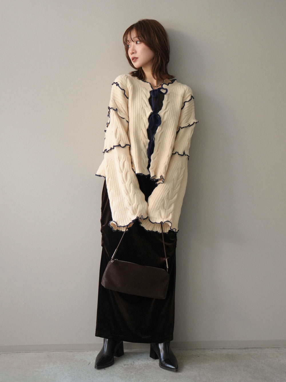 [SET]フロントリボン配色メローニットカーディガン+ギャザーベロアスカート(2set)