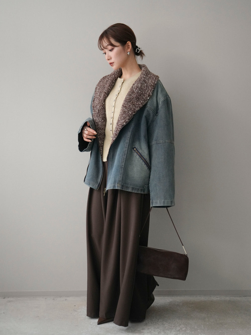 [SET]ミックスボアデニムジャケット+シルバーボタン畦編みニットカーディガン+テープベルトタックバギーパンツ(3set)